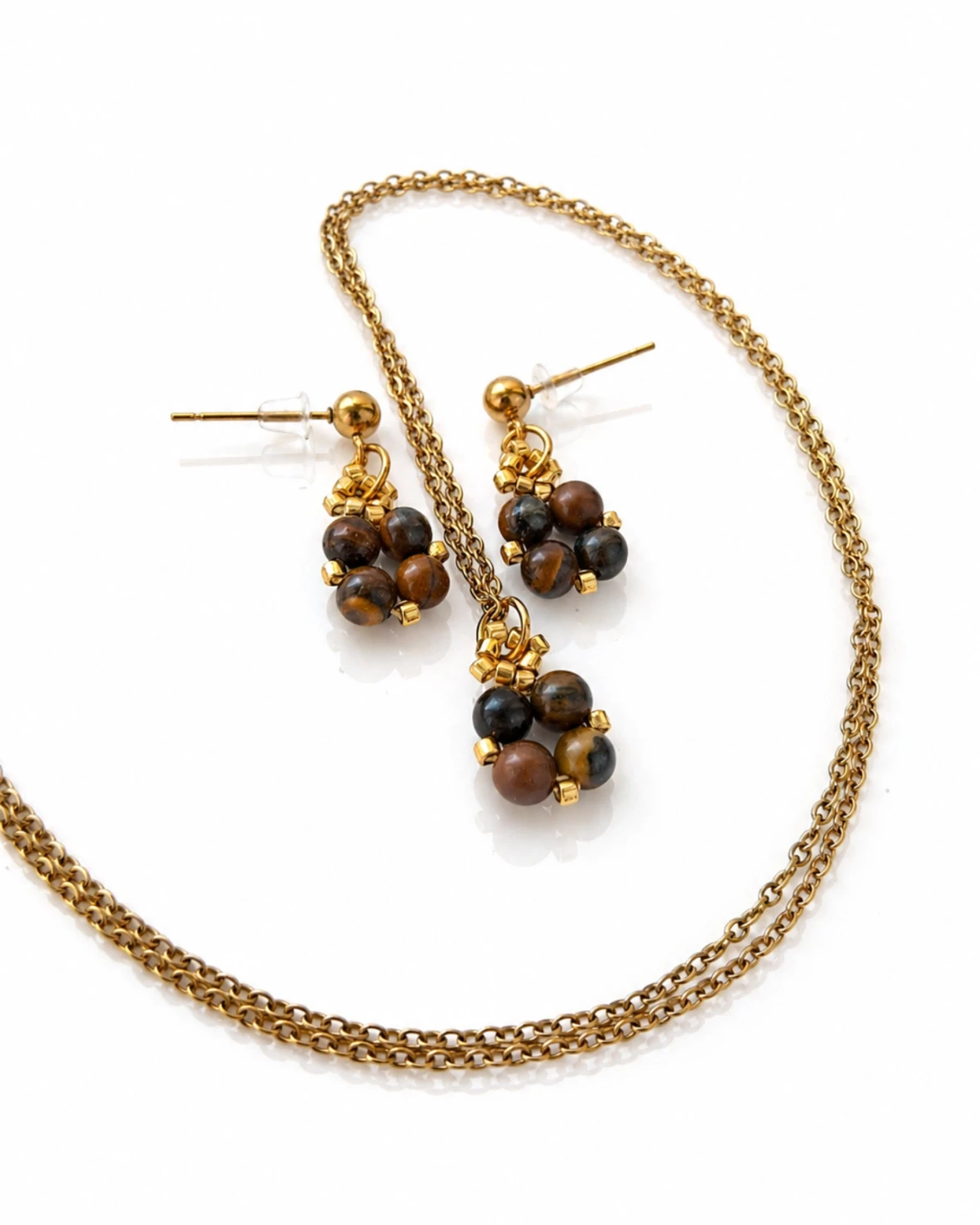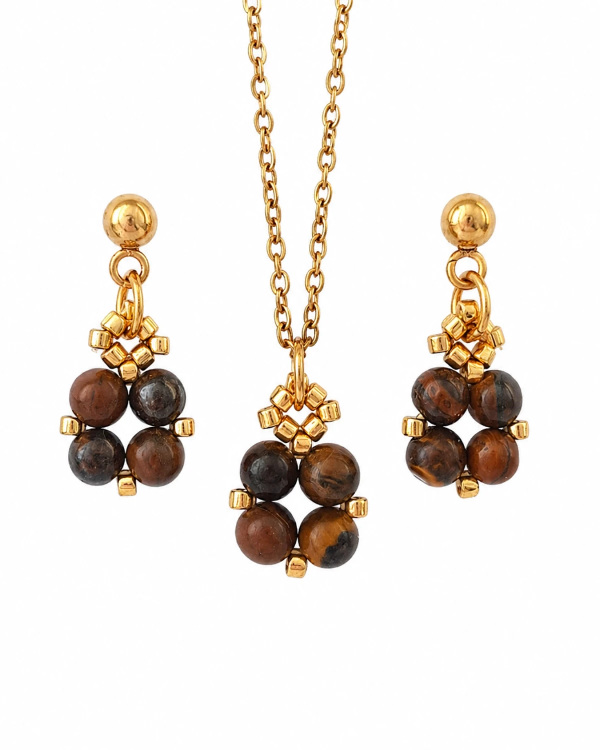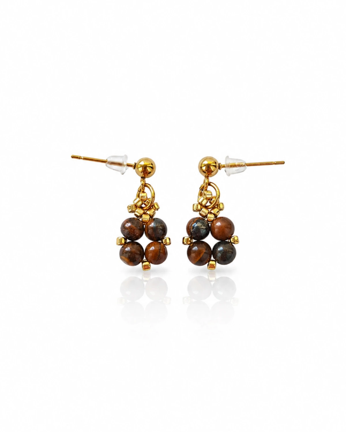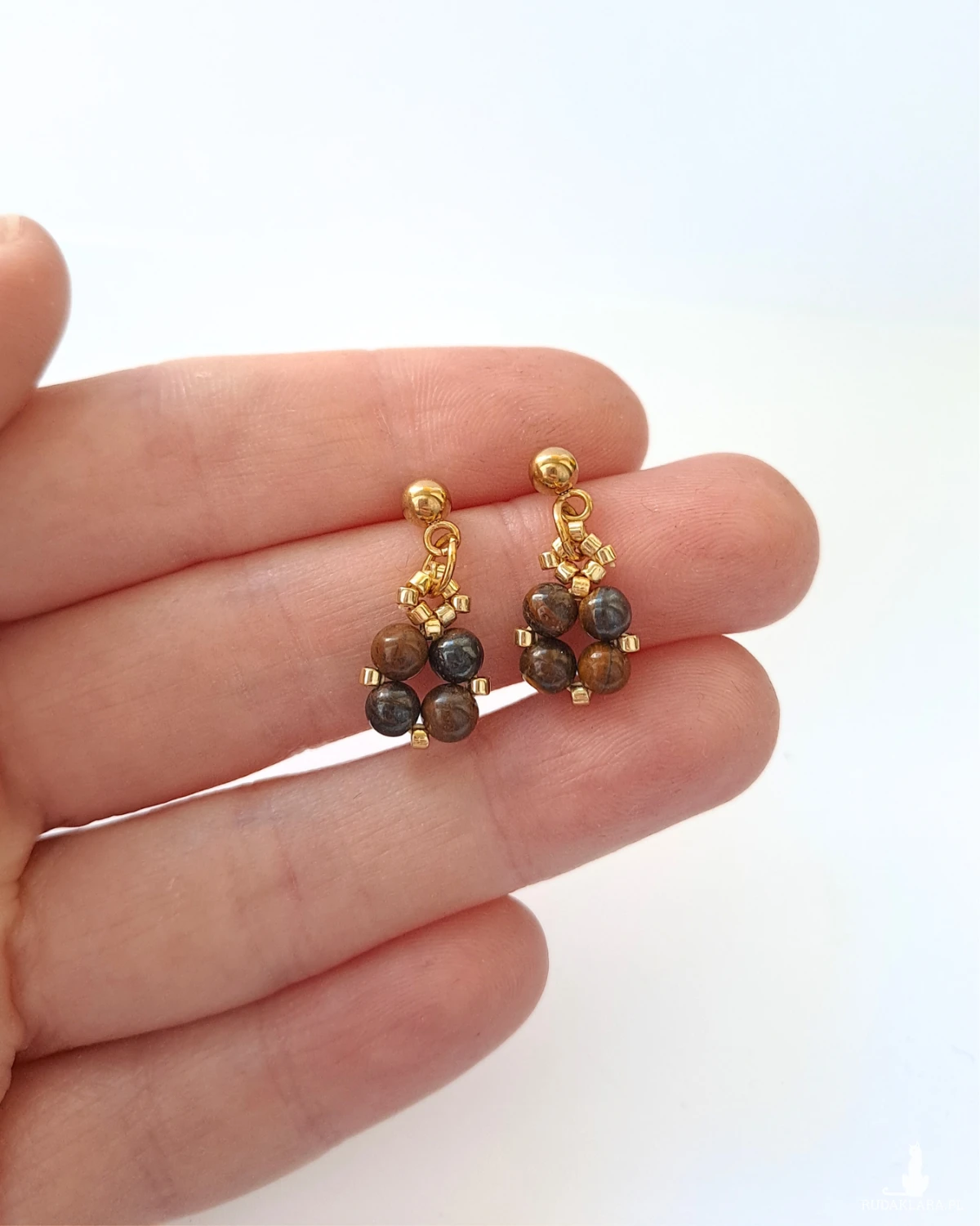 Delikatne, wiszące sztyfty z tygrysim okiem przyciągają uwagę ciepłymi, złocisto-brązowymi refleksami i charakterystycznym, jedwabistym połyskiem. Niewielka forma i subtelny ruch nadają im lekkości, a złote akcenty pięknie podkreślają głębię kamienia. Minimalistyczna kompozycja sprawia, że kolczyki są eleganckie, ale nienachalne — idealne zarówno na co dzień, jak i na wyjątkowe okazje.