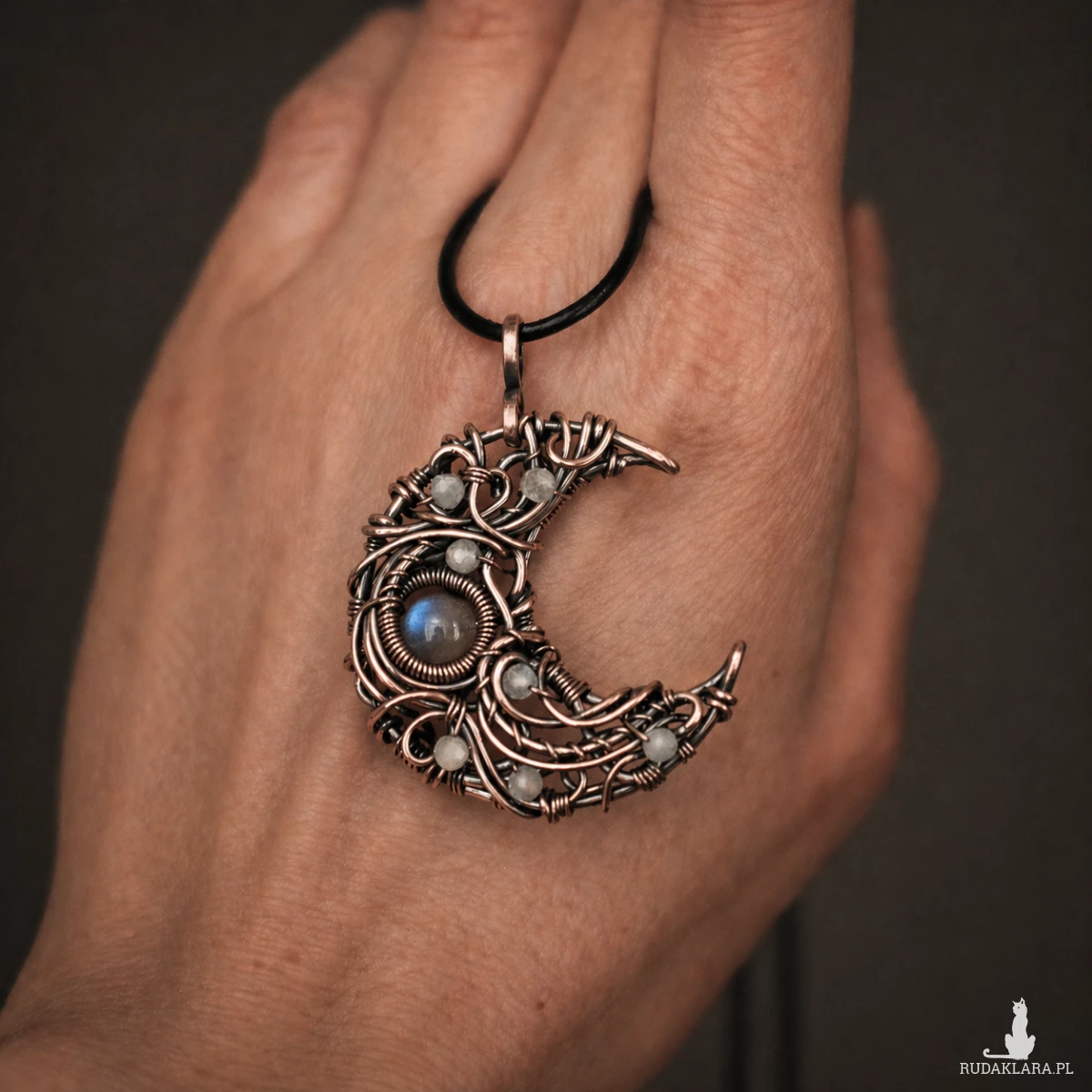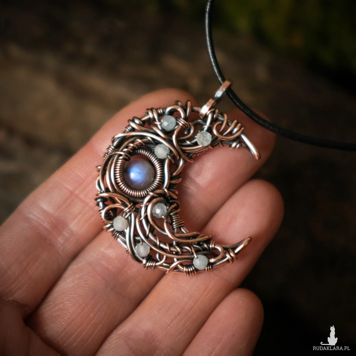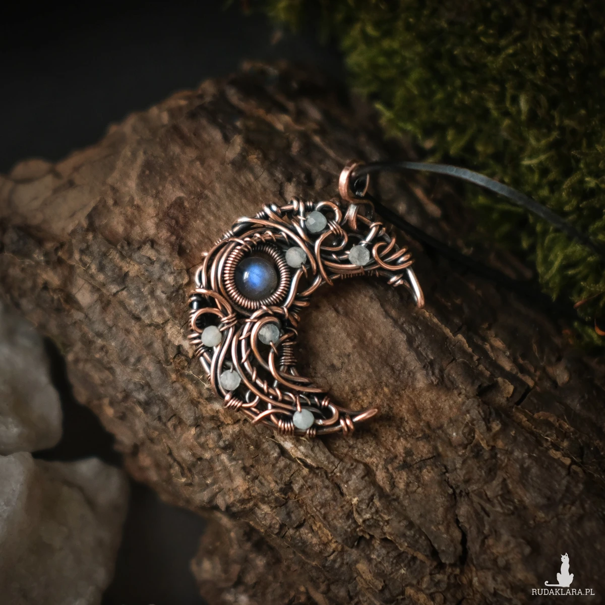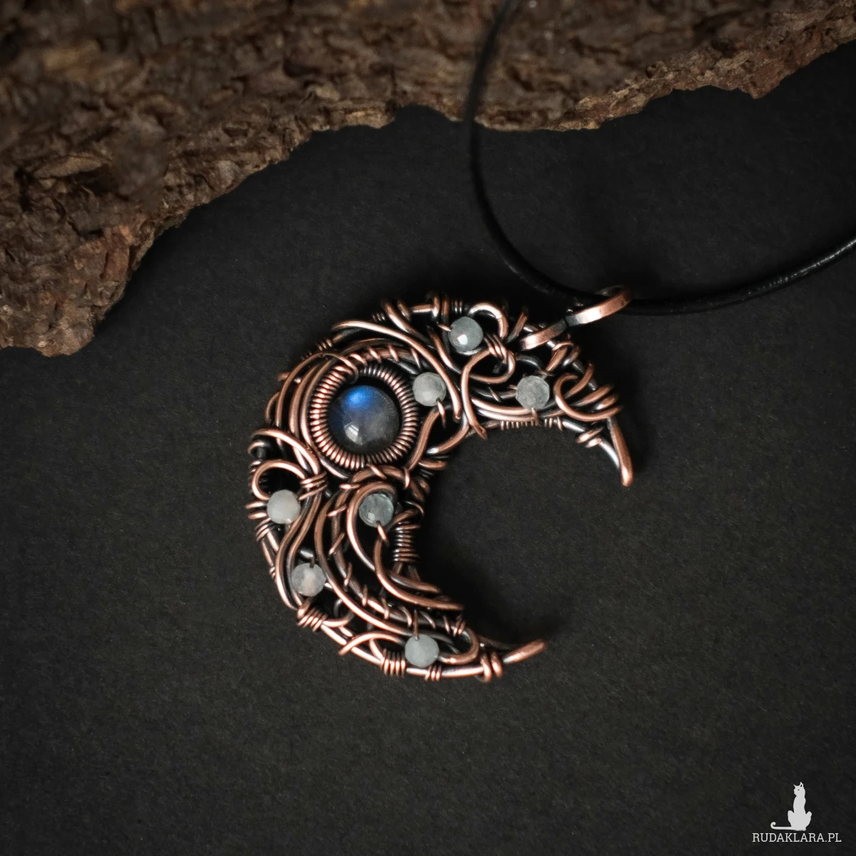 Miedziany wisiorek - księżyc z labradorytem iryzującym na niebiesko w centrum oraz fasetowanymi akwamarynami. Piękne fantazyjne sploty dodają mu baśniowego charakteru.