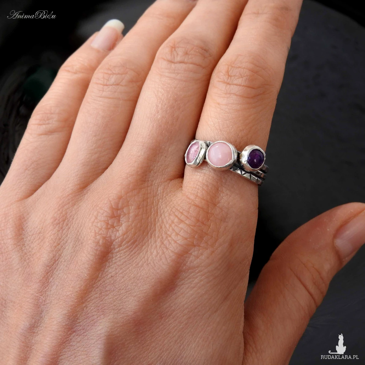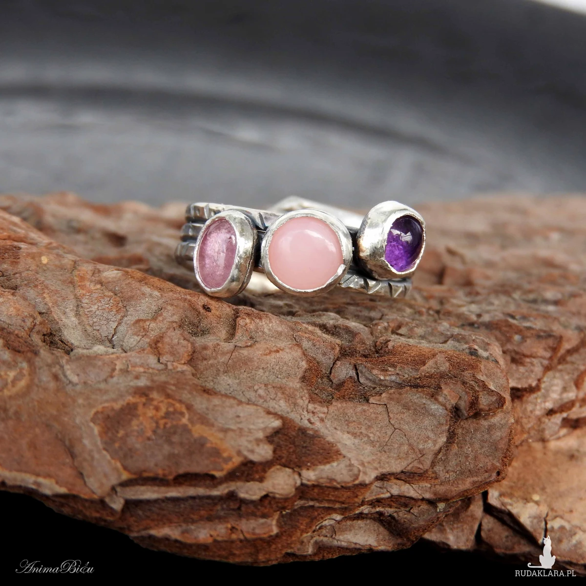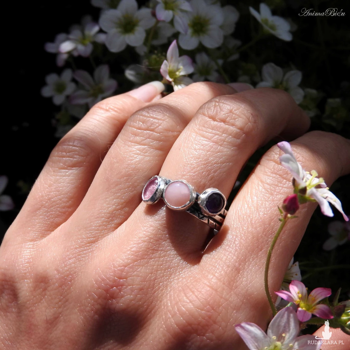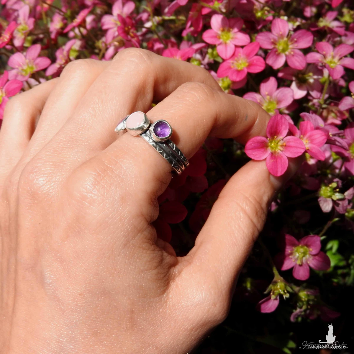 okrągły, pastelowo różowy opal i fioletowy ametyst stanowią apetyczne trio