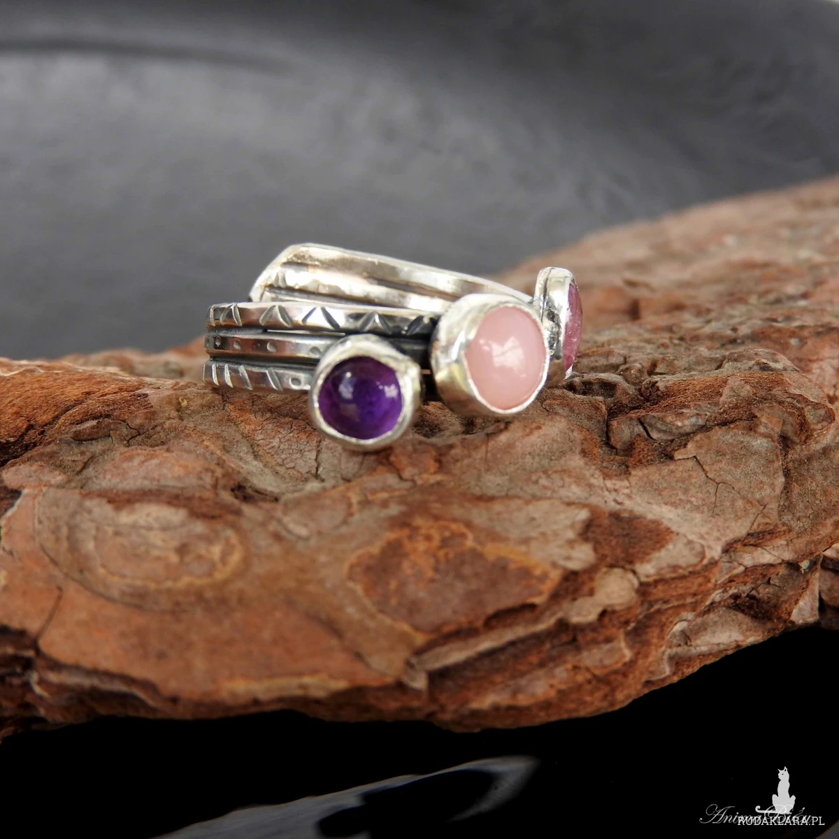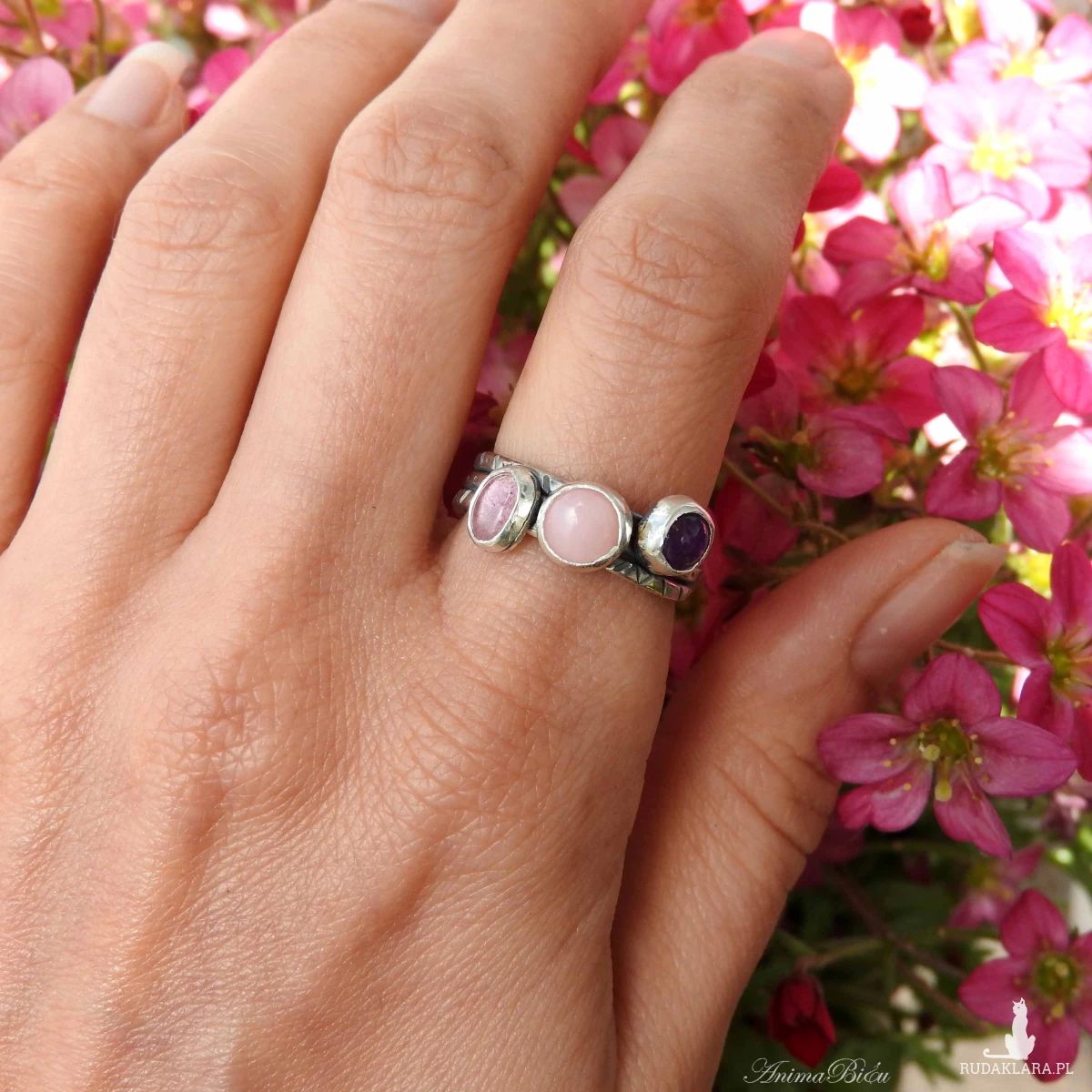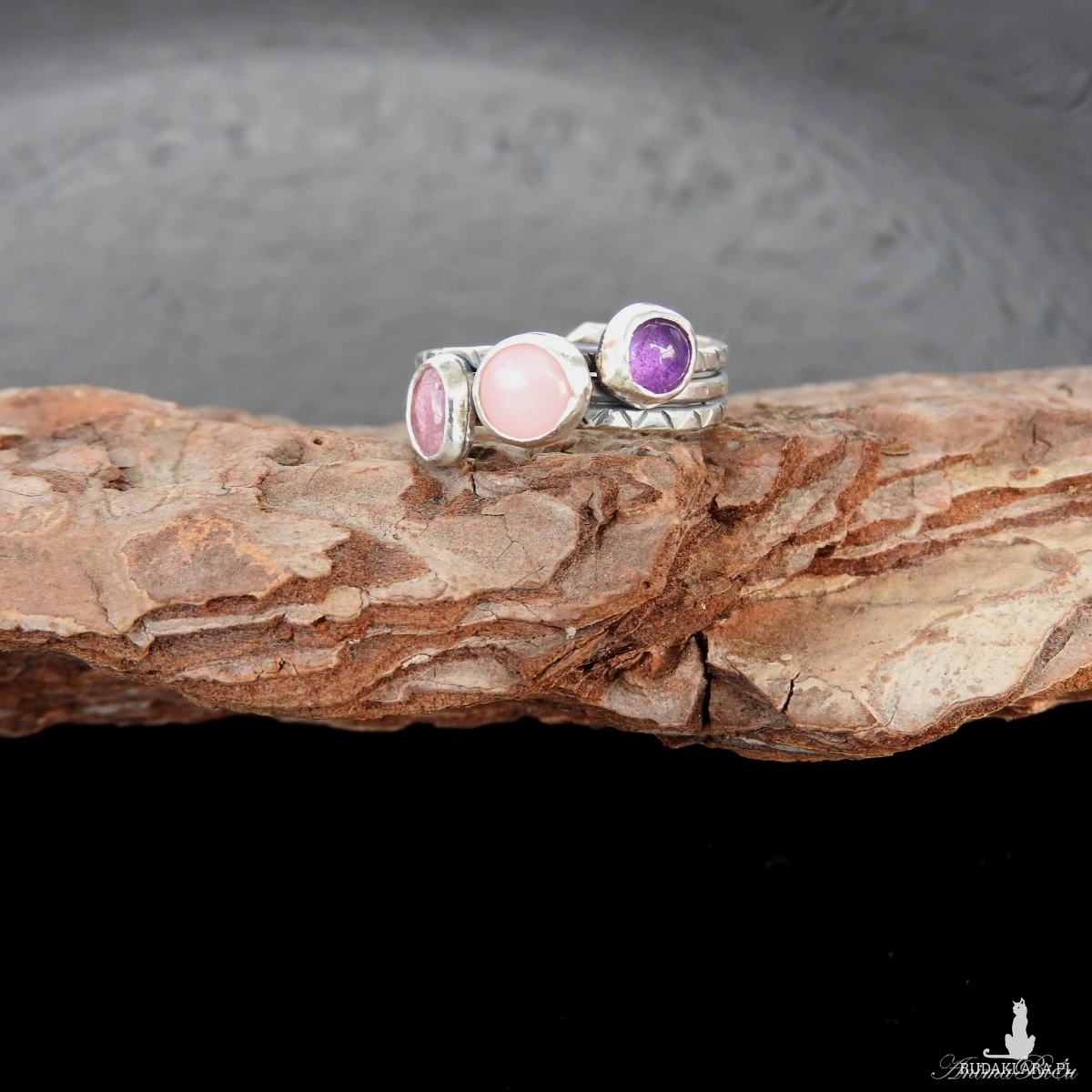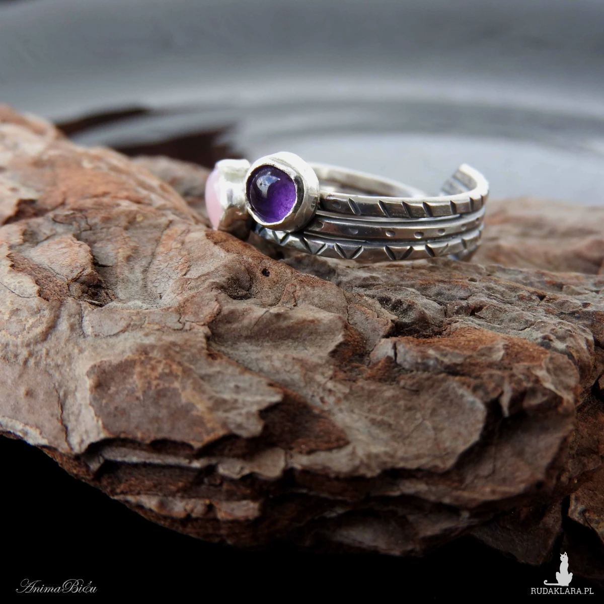 okrągły, pastelowo różowy opal i fioletowy ametyst stanowią apetyczne trio