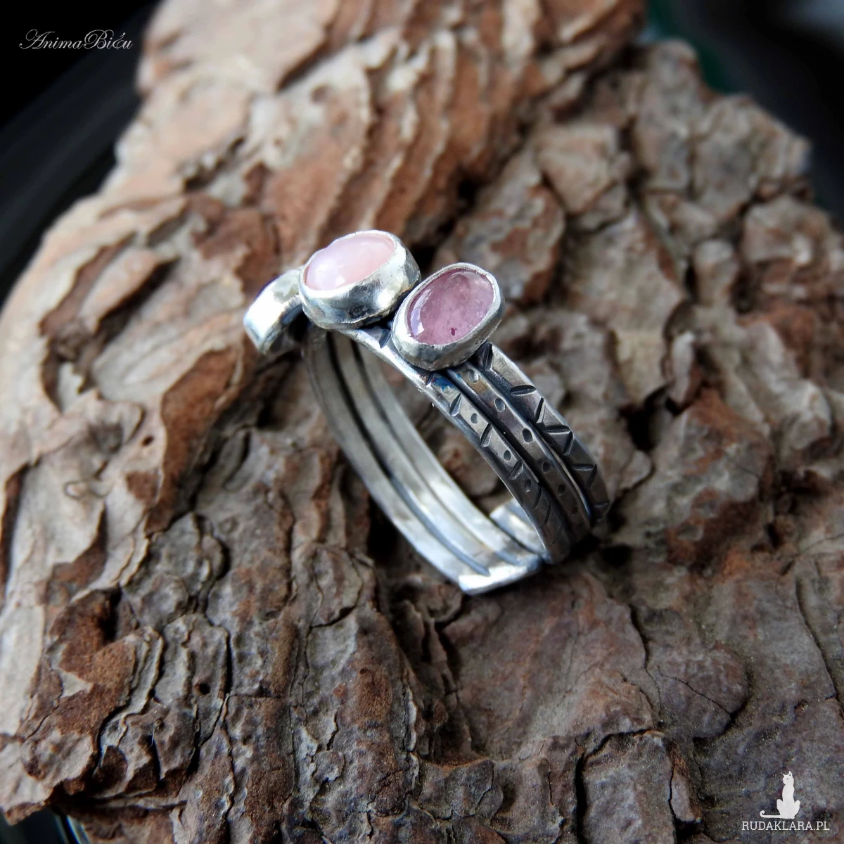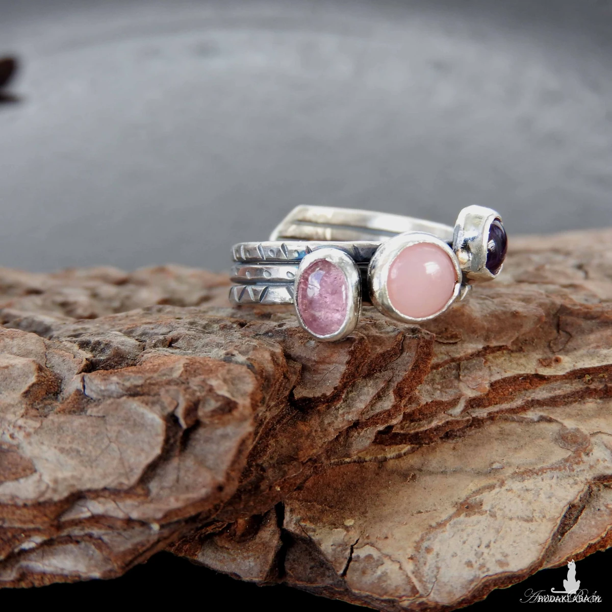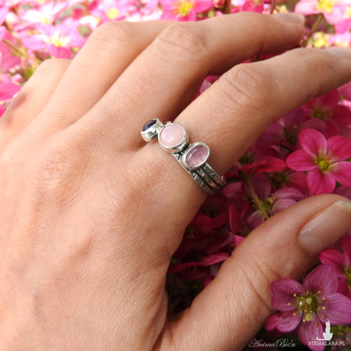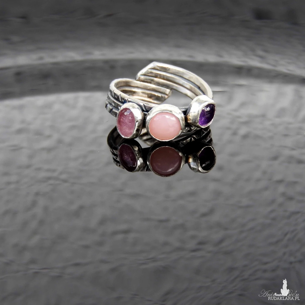 okrągły, pastelowo różowy opal i fioletowy ametyst stanowią apetyczne trio