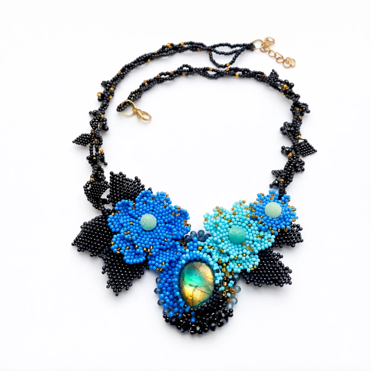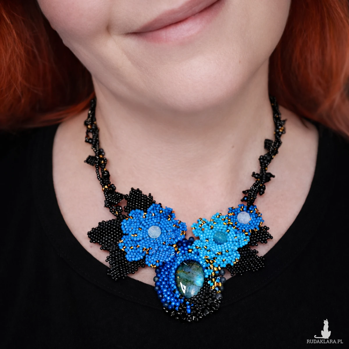 Unikatowy naszyjnik z naturalnym labradorytem i agatami, wykonany ręcznie w technice haftu koralikowego. Szlachetne połączenie głębokiej czerni i królewskiego błękitu tworzy biżuterię klasy premium – dla kobiet, które wybierają wyjątkowość zamiast masowej produkcji.