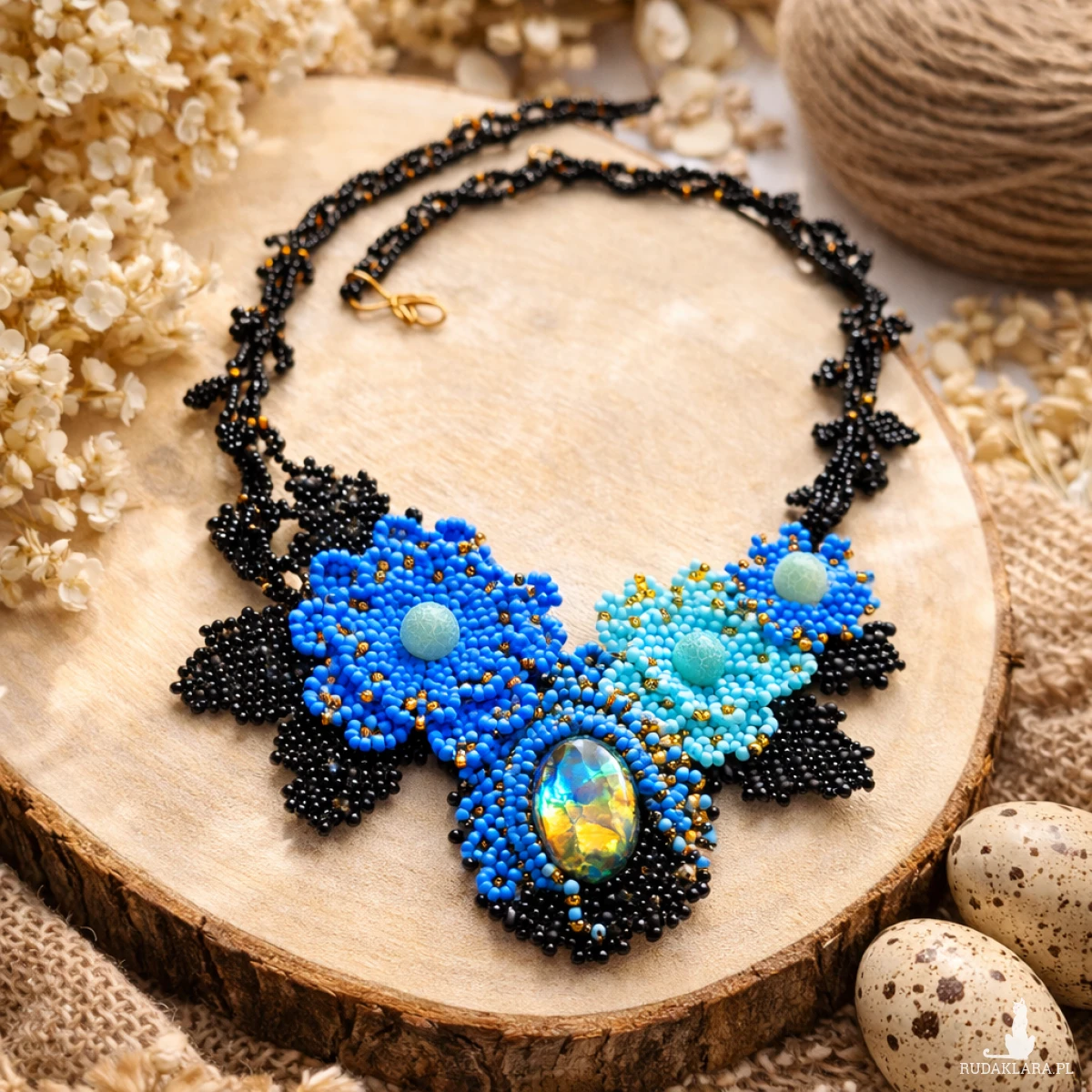Naszyjnik wykonany został techniką haftu koralikowego z wykorzystaniem wysokiej jakości koralików jubilerskich. Precyzja, symetria i perfekcyjne wykończenie sprawiają, że to biżuteria z segmentu premium handmade.