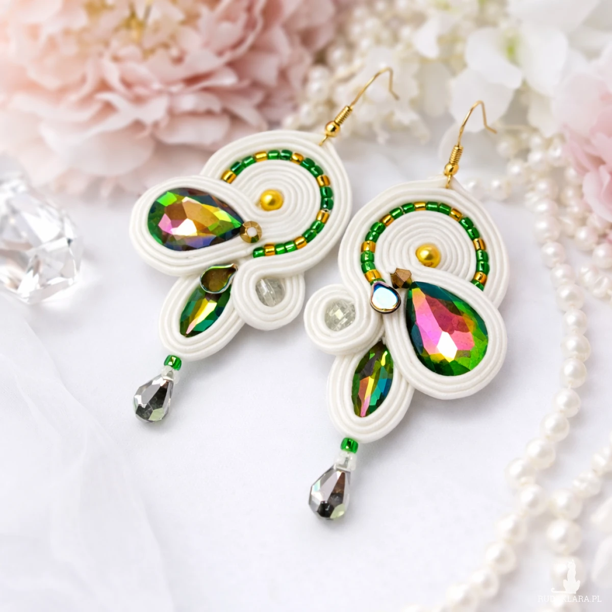 Połączenie klasycznej bieli, złotych detali oraz mieniących się kryształów sprawia, że kolczyki pięknie odbijają światło i subtelnie podkreślają rysy twarzy.
