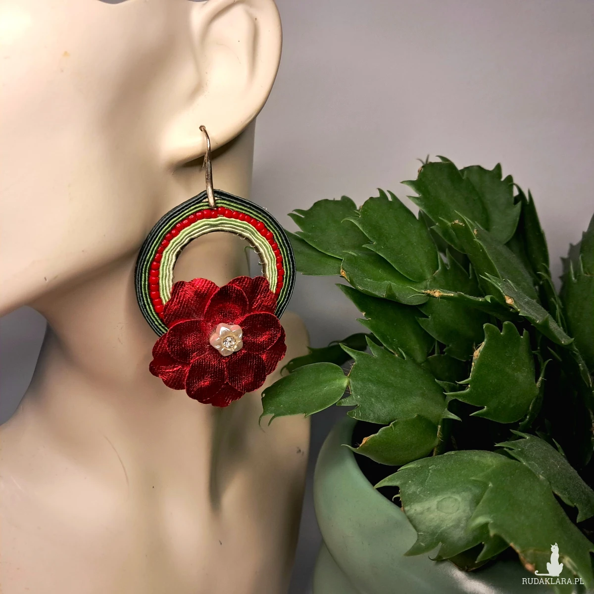 Wyjątkowe, ręcznie wykonane kolczyki sutasz w intensywnym czerwonym kolorze z dekoracyjnym kwiatem. Połączenie zielonych i kremowych splotów z czerwonymi koralikami tworzy efektowną, artystyczną kompozycję inspirowaną stylem etno i folk.