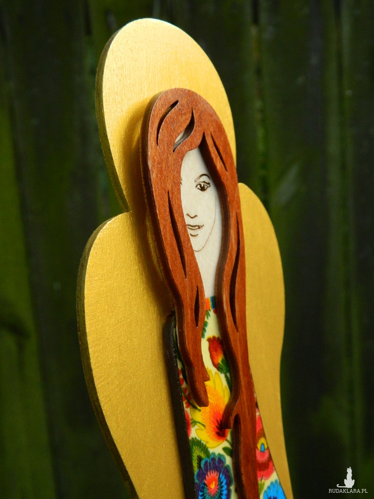 Anioł z drewna do powieszenia, ozdobiony wzorem łowickim z użyciem techniki decoupage, częściowo malowany ręcznie, kilkakrotnie lakierowany. Idealny na prezent – na chrzest, nowe mieszkanie czy z dowolnej innej okazji. ?