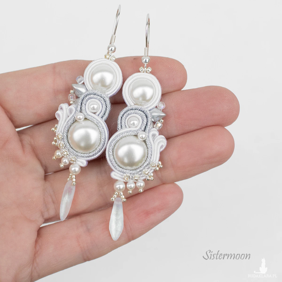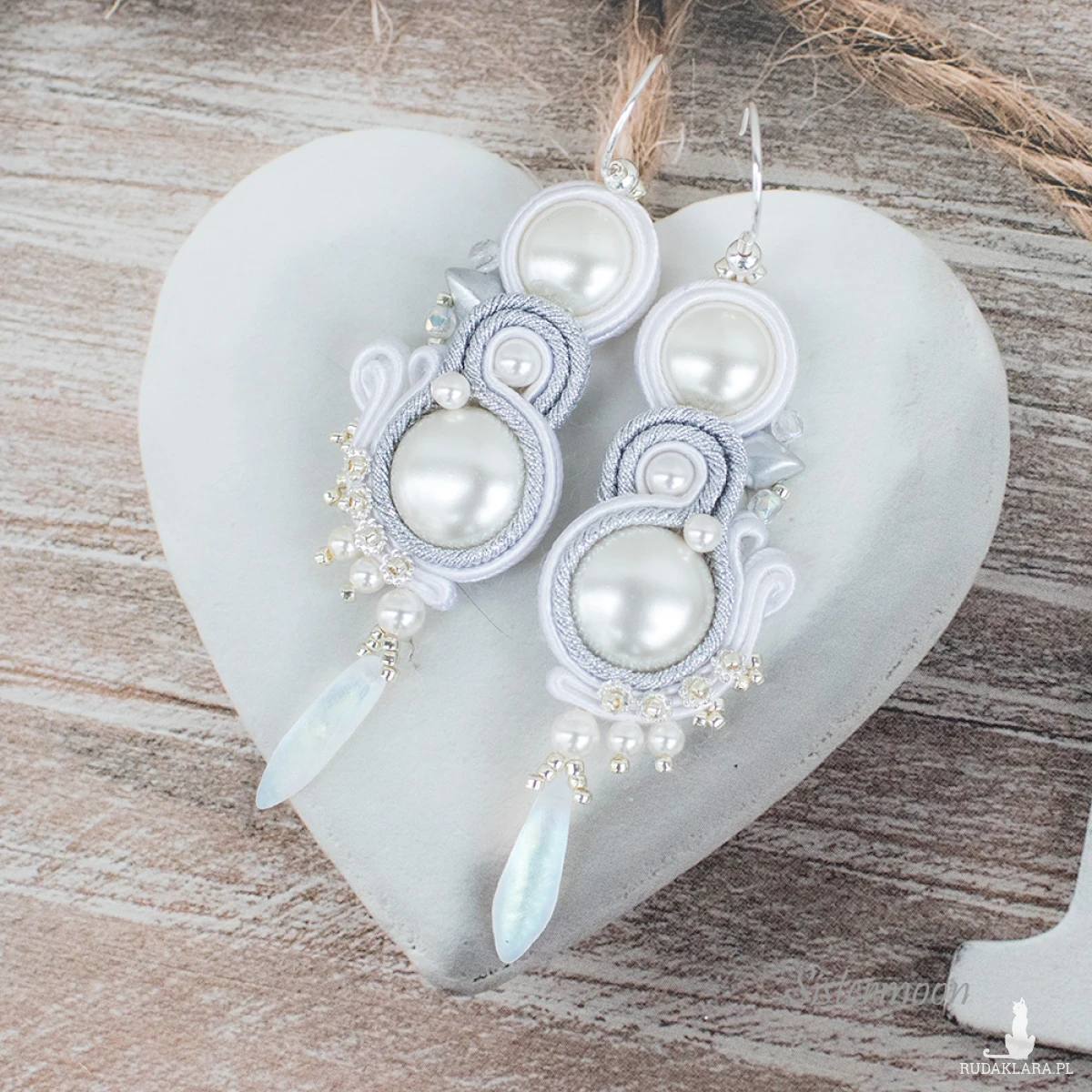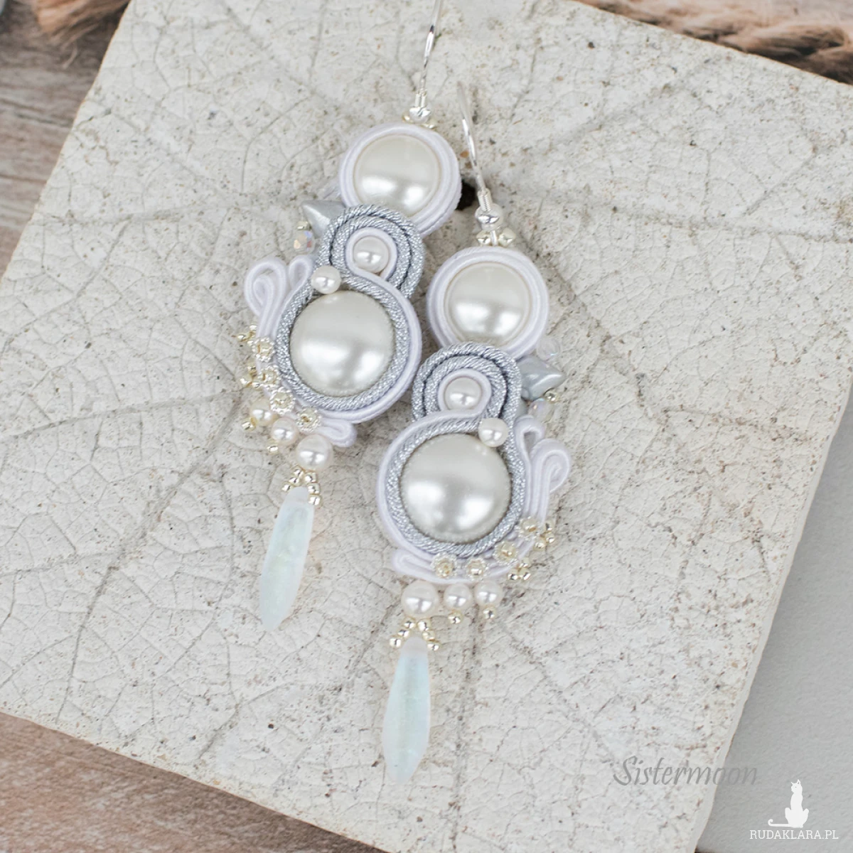 Białe kolczyki ślubne sutasz w tonacji biel i srebro. Małe, smukłe, delikatne. Użyte materiały wysokiej jakości: kaboszony perłowe, perełki Swarovskiego White, czeski sutasz, czeskie kryształki i japońskie koraliki Toho. Zapięcie typu bigiel otwarty antyalergiczny. Spód wykończony skórką. Wysokość całkowita 7 cm (w tym 6 cm sam kolczyk bez bigla), szerokość 2 cm.