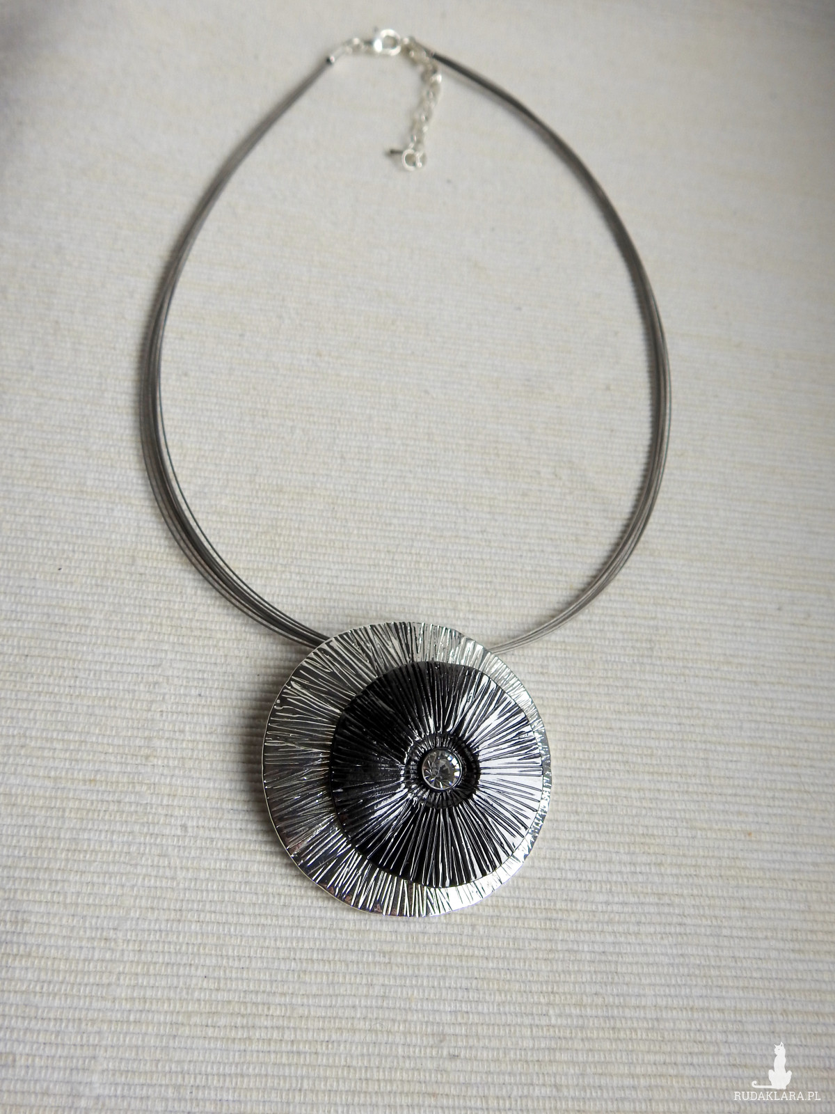 Zawieszka ma dość duży uchwyt do wieszania, można zamiast na długim łańcuszku, powiesić ją np. na krótkiej obroży skórzanej albo metalowej. Oprócz tego możesz w tej samej cenie zamienić łańcuszek na obrożę ze strun jubilerskich widoczną na zdjęciu (długość 42cm + 6cm przedłużenie), albo wybrać łańcuszek o innej długości.