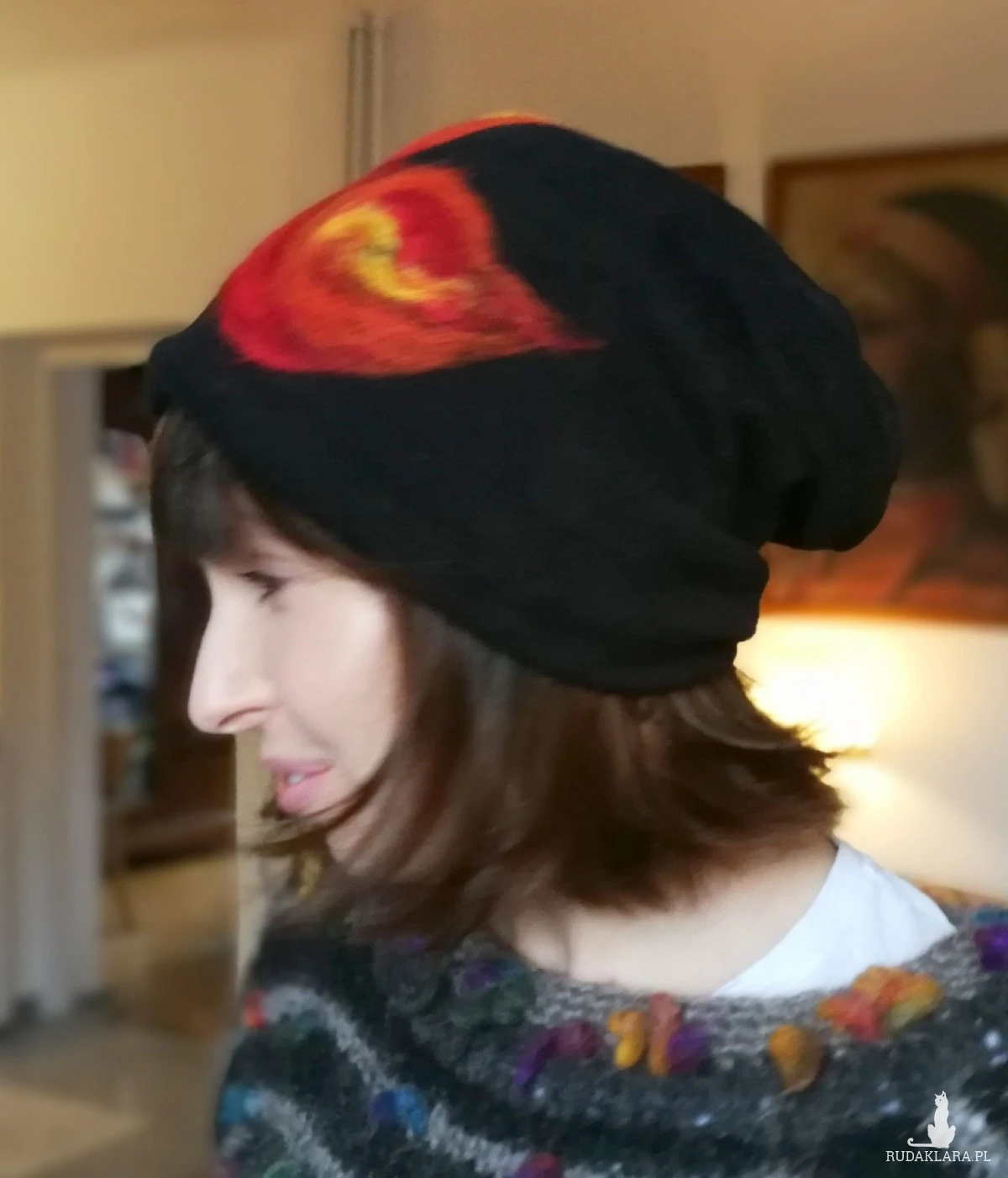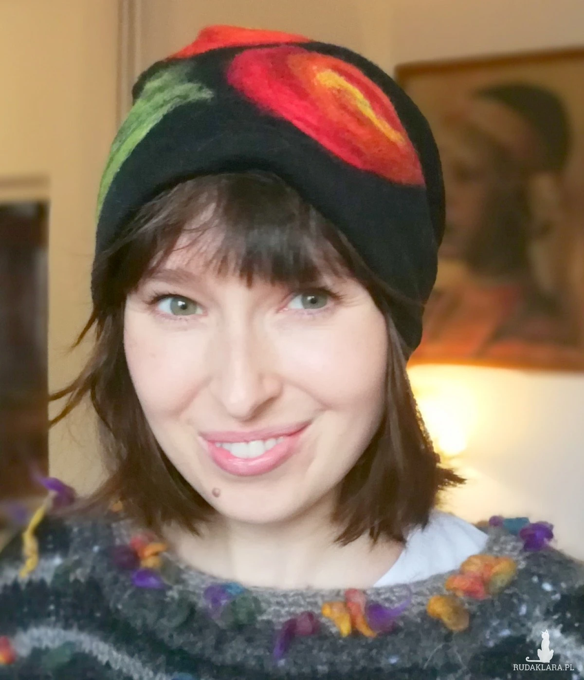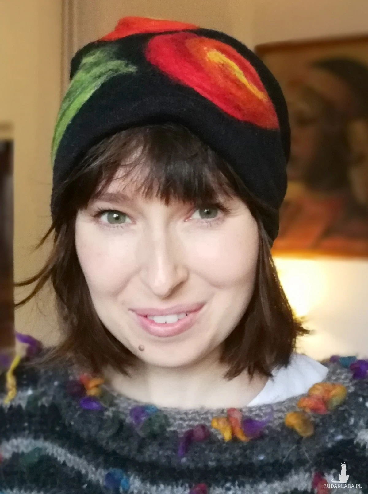 czapka wełniana damska czarna z kwiatem-czesanką filcowane czapki wełniane -czapka handmade na podszewce, 59cm-61cm,wełniana, filcowana wełną merynosów, bardzo ciepła, fantastyczna, miła, miękko układa się na głowie, niezwykle oryginalna, niesamowicie zwraca uwagę, doskonała na codzienne noszenie jak i na prezent, zawsze możesz ją założyć po basenie i przeżyjesz z mokrą głową:) idealna na wypad w góry,naprawdę superowa -pojedyncze egzemplarze, polecam- box m1
