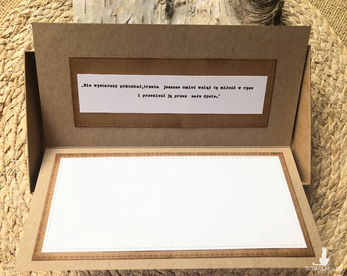 Kartka z okazji Ślubu w dopasowanym stylistycznie pudełku z okienkiem dla Młodej Pary , która kocha podróże i wybiera się w szczęśliwą podróż przez wspólne życie z urokliwym samolotem. Komplet stworzony na bazie papieru kraftowego nadając kompletowi klimat w stylu rustykalnym. Kartka ma wymiary 21,0 x 10,5 , pudełko ma wymiary 11,5 x 22,5. Całość obwiązana sznurkiem z tagiem - biletem .W środku kartki znajduje się miejsce na wypisanie własnych życzeń a na dnie pudełka umieszczono kieszonkę na małe co nieco lub kupon lotto . W tej postaci produkt dostępny od ręki .Pozdrawiam