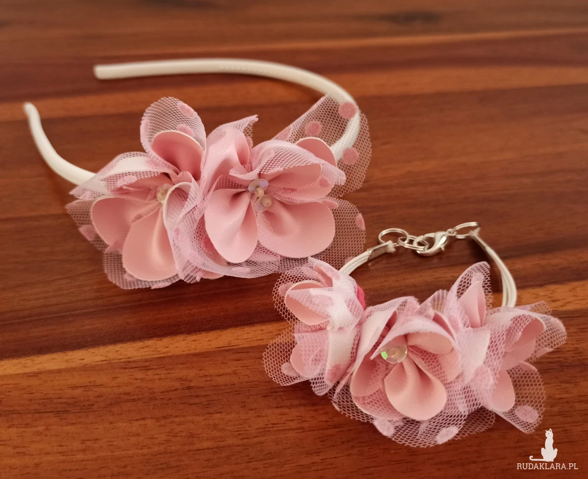 Elegancka opaska z delikatnymi kwiatuszkami oraz bransoletka z trzema małymi kwiatuszkami.
