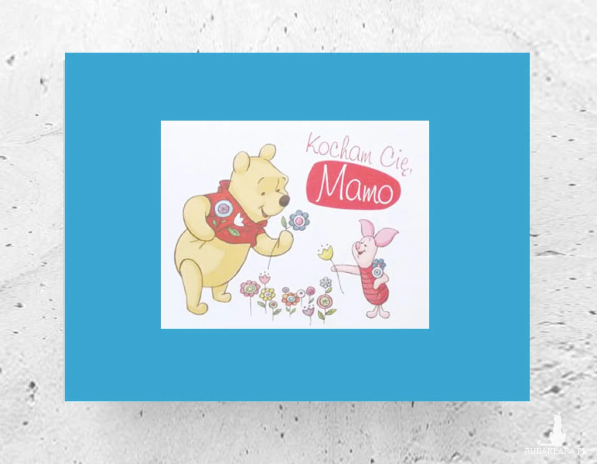 Nowy, kolorowy plakat z Kubusiem Puchatkiem i Prosiaczkiem. Bajkowa dekoracja na ścianę do dziecięcego pokoju, kuchni, jadalni, żłobka, przedszkola, bawialni, klubu malucha itp. Grafika na ciemnoniebieskim kartoniku w rozmiarze A4. Poster wystarczy dać do ramki w rozmiarze 21 x 30 cm.