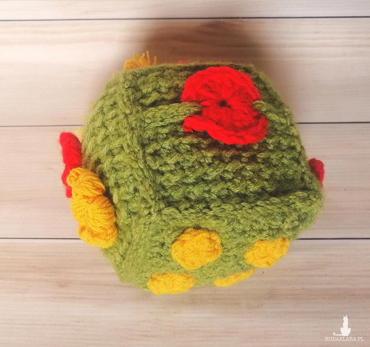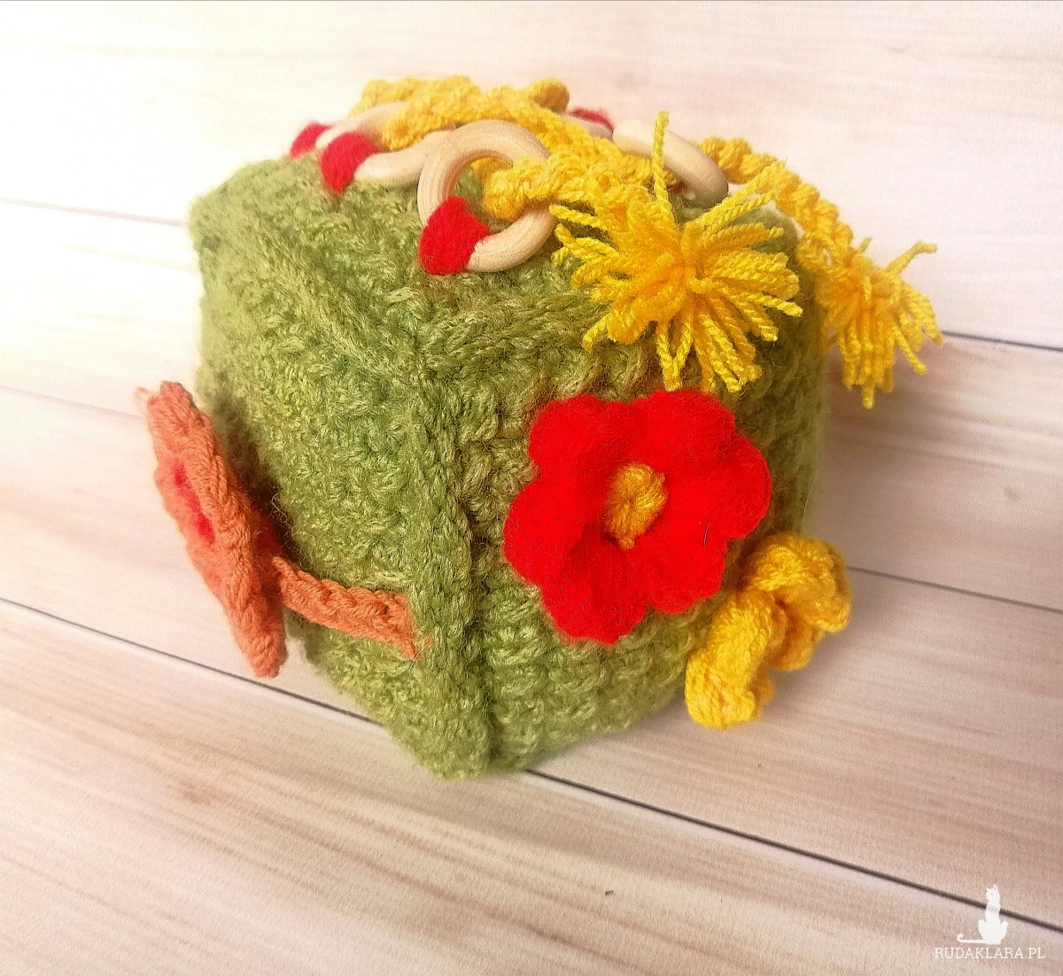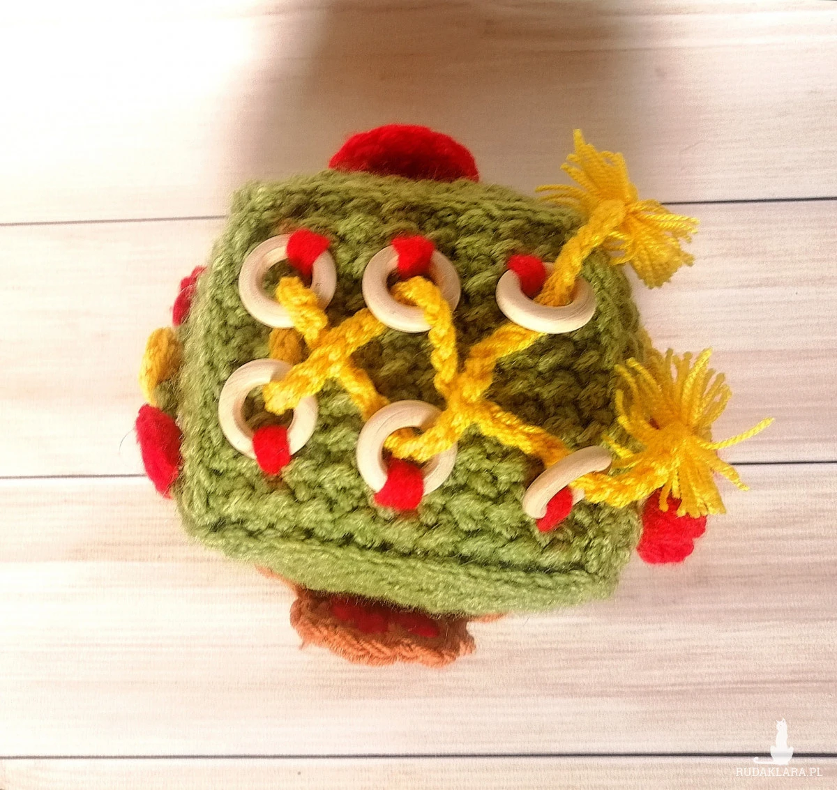 Kostka sensoryczna wykonana na szydełku w kolorach przyciągających wzrok dziecka, niektóre elementy przesuwne, jest też możliwości nauki sznurowania na jednej ze stron kostki.