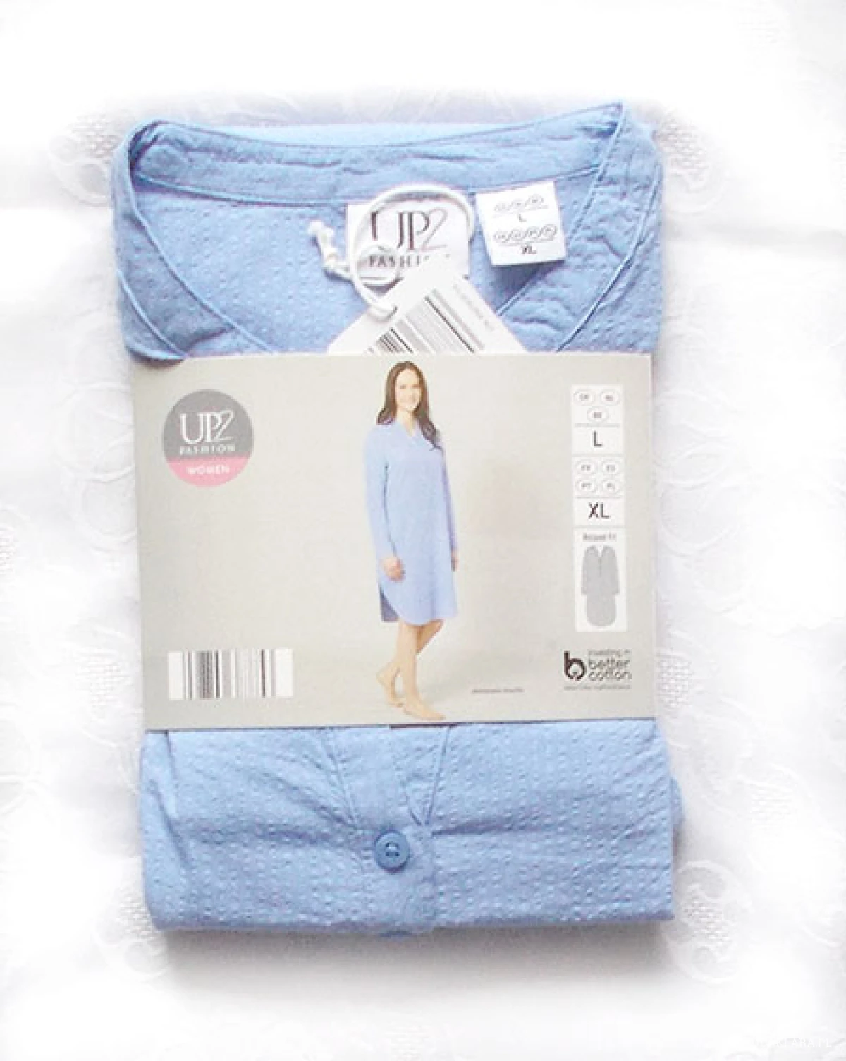 Damska tunika: koszula nocna lub sukienka lub bluza itp. Materiał: bawełna 100%, tkanina typu "kora", kolor niebieski chabrowy. Rozmiar L/XL. Marka "up 2 fashion". Wymiary: ramiona 43 cm, pacha-pacha 60 cm, długość całkowita 96 cm.