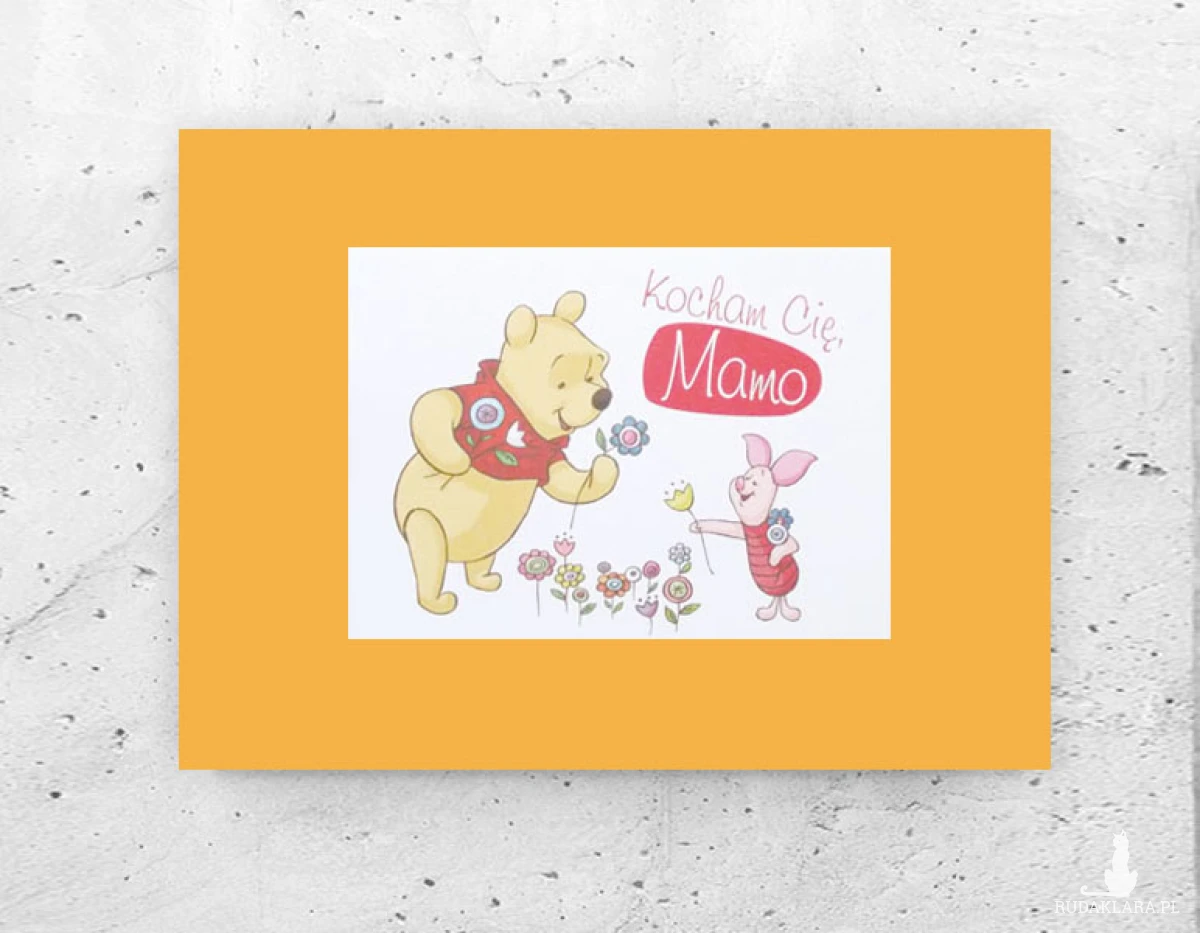Nowy, kolorowy plakat z Kubusiem Puchatkiem i Prosiaczkiem oraz napisem "Kocham Cię Mamo". Bajkowa dekoracja na ścianę do dziecięcego pokoju, kuchni, jadalni, żłobka, przedszkola, bawialni, klubu malucha itp. Grafika na pomarańczowym tle w rozmiarze A4, gruby kartonik. Poster wystarczy dać do ramki w rozmiarze 21 x 30 cm..