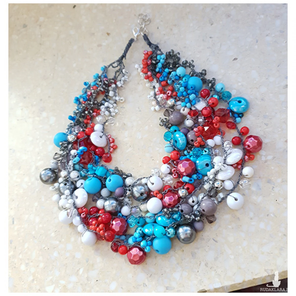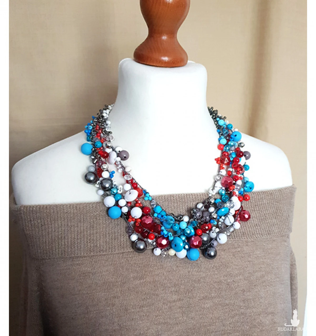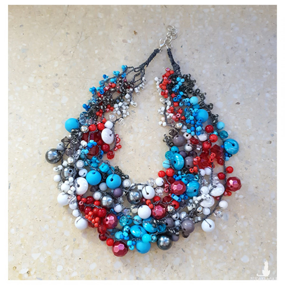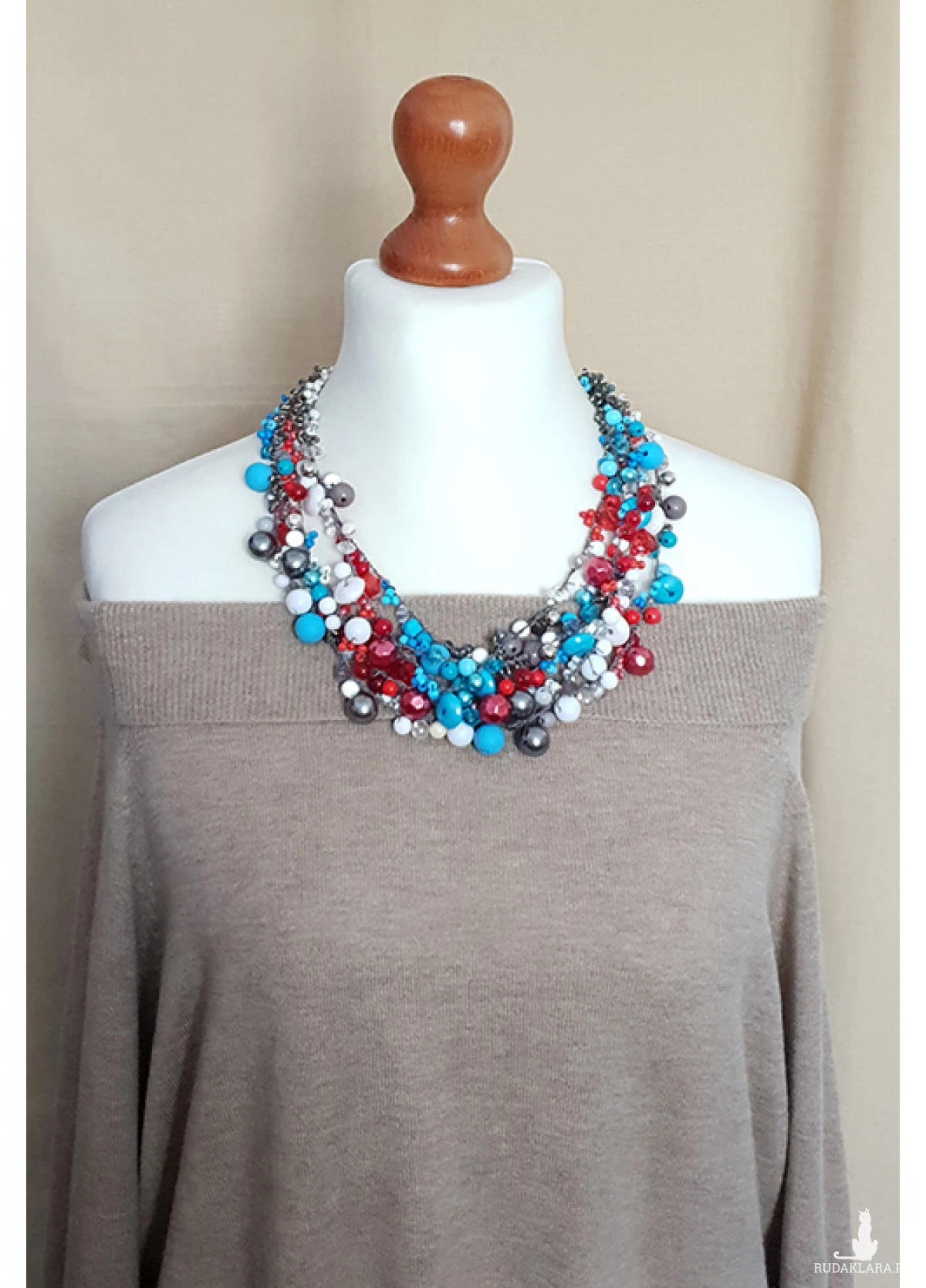 Naszyjnik wykonany jest z akrylowych i szklanych koralików w rozmiarze 4-14 mm.