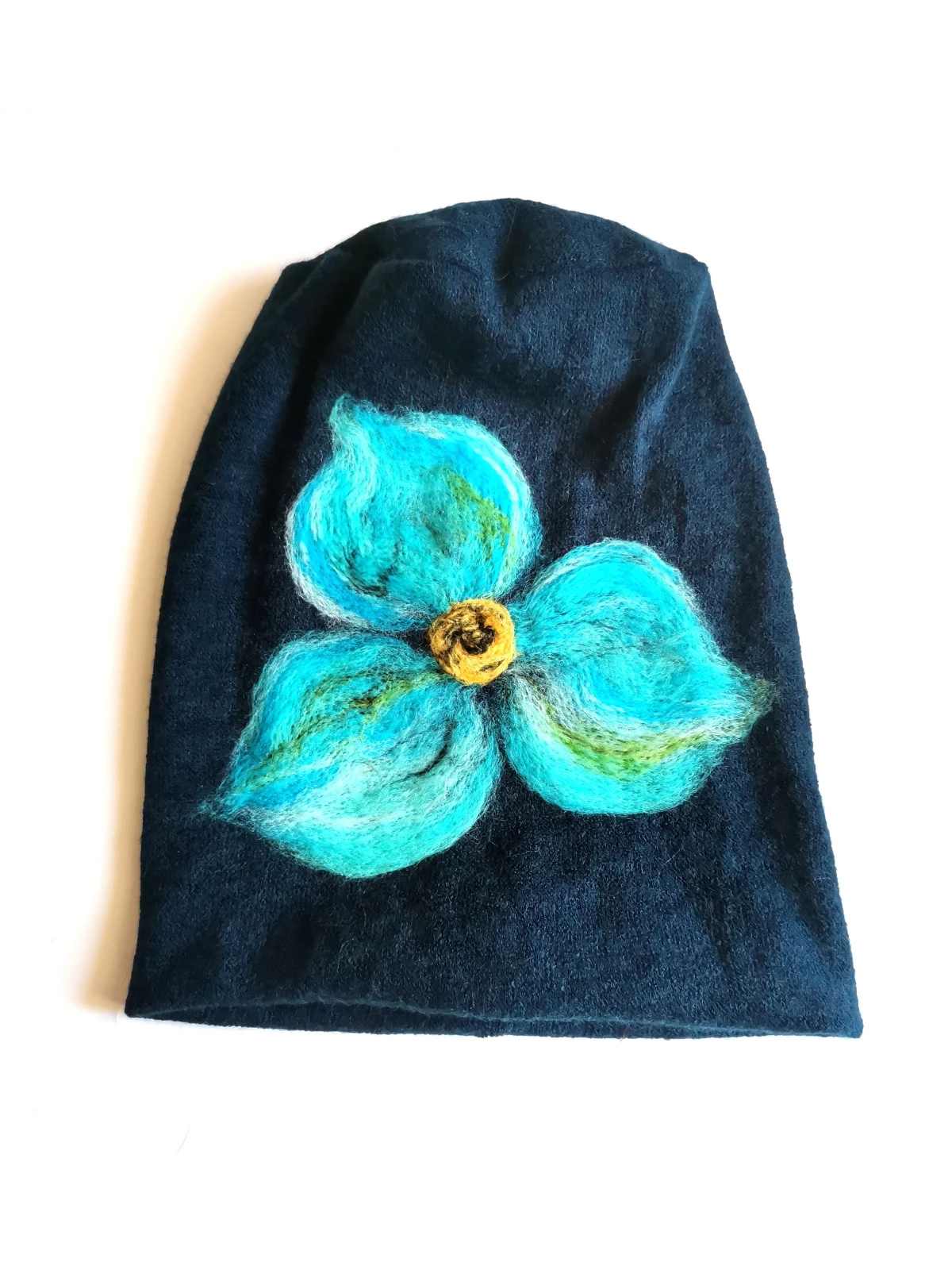 czapka wełniana filcowana granatowa zimowa handmade w kwiaty na podszewce-- rozmiar uniwersalny, wełniana, filcowana wełną merynosów, bardzo ciepła, fantastyczna, miła, miękko układa się na głowie, niesamowicie zwraca uwagę, doskonałą na codzienne noszenie jak i na prezent, zawsze możesz ją założyć po basenie i przeżyjesz z mokrą głową:) naprawdę superowa -pojedyncze egzemplarze
