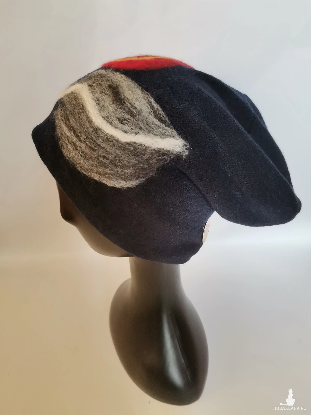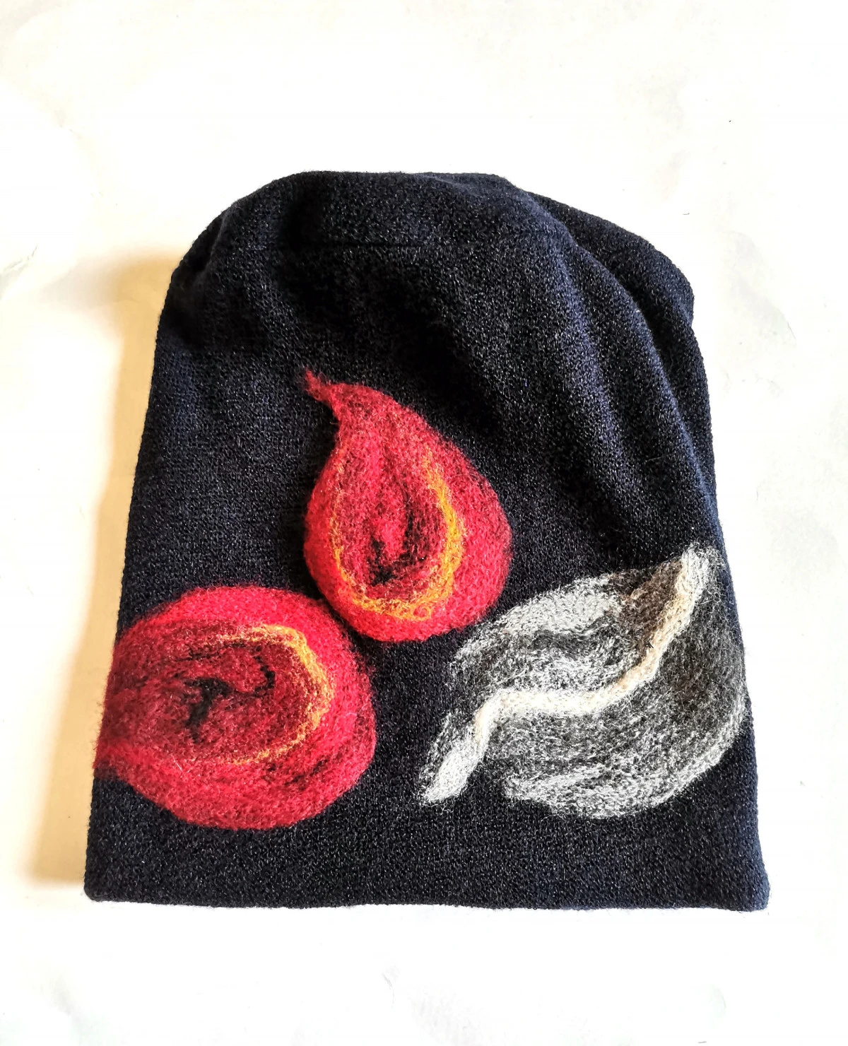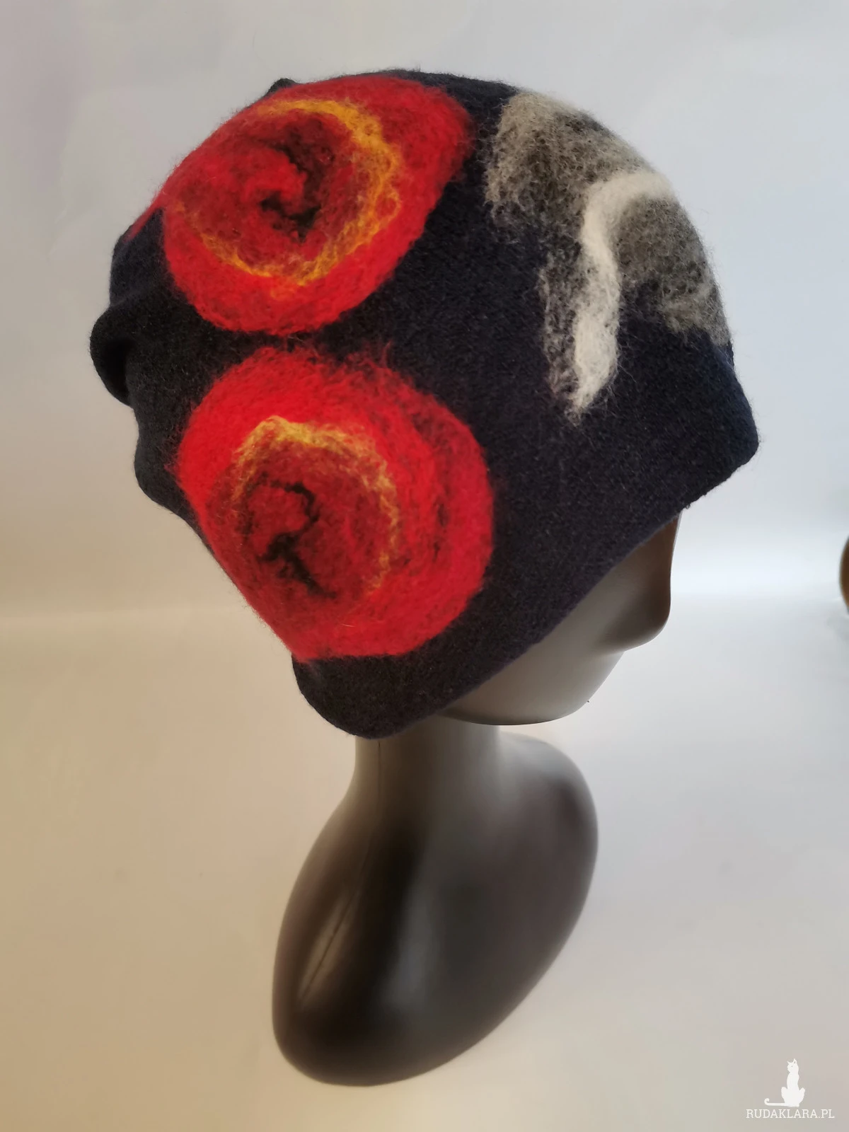 czapka wełniana filcowana zimowa handmade w kwiaty na podszewce-- rozmiar uniwersalny, wełniana, filcowana wełną merynosów, bardzo ciepła, fantastyczna, miła, miękko układa się na głowie, niesamowicie zwraca uwagę, doskonałą na codzienne noszenie jak i na prezent, zawsze możesz ją założyć po basenie i przeżyjesz z mokrą głową:) naprawdę superowa -pojedyncze egzemplarze box d1 granat