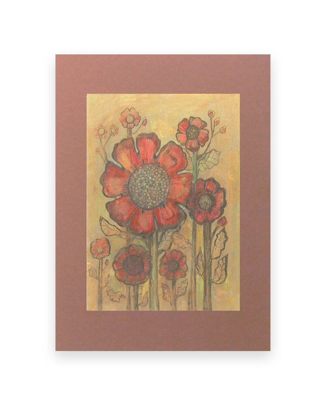 Kolorowy rysunek, ręcznie wykonany szkic z kwiatkami. Grafika na brązowym kartoniku w