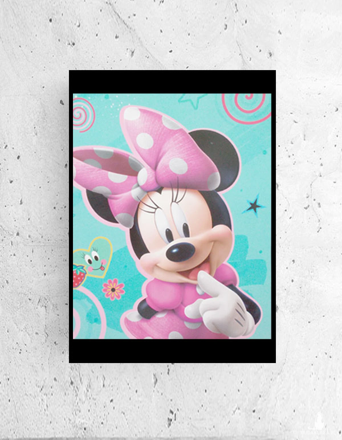 Kolorowa grafika z myszką Minnie na czarnym kartoniku A4. Dekoracja na ścianę do pokoju dziewczynki lub nastolatki. Plakat wystarczy dać do ramki 21x30 cm.