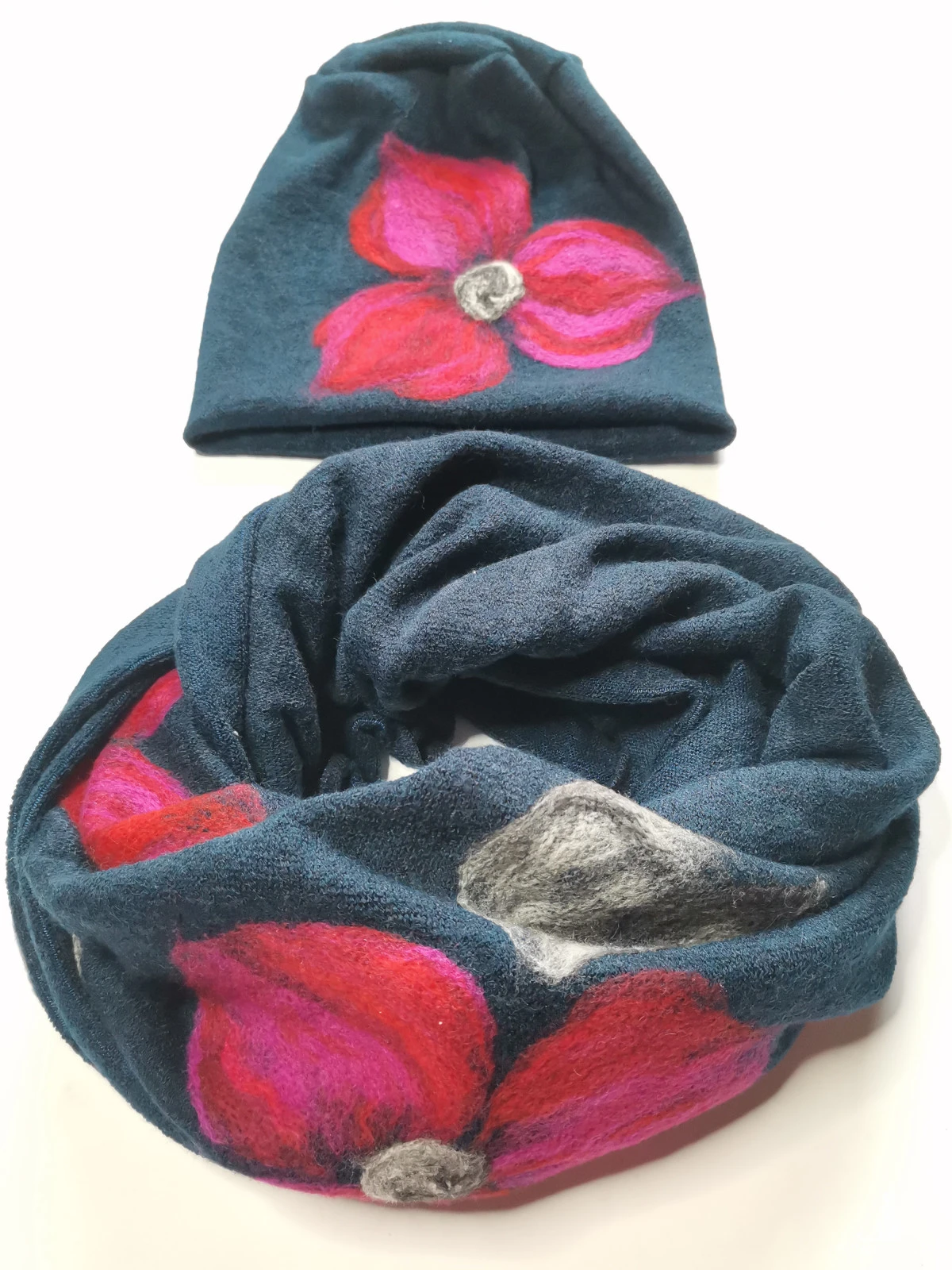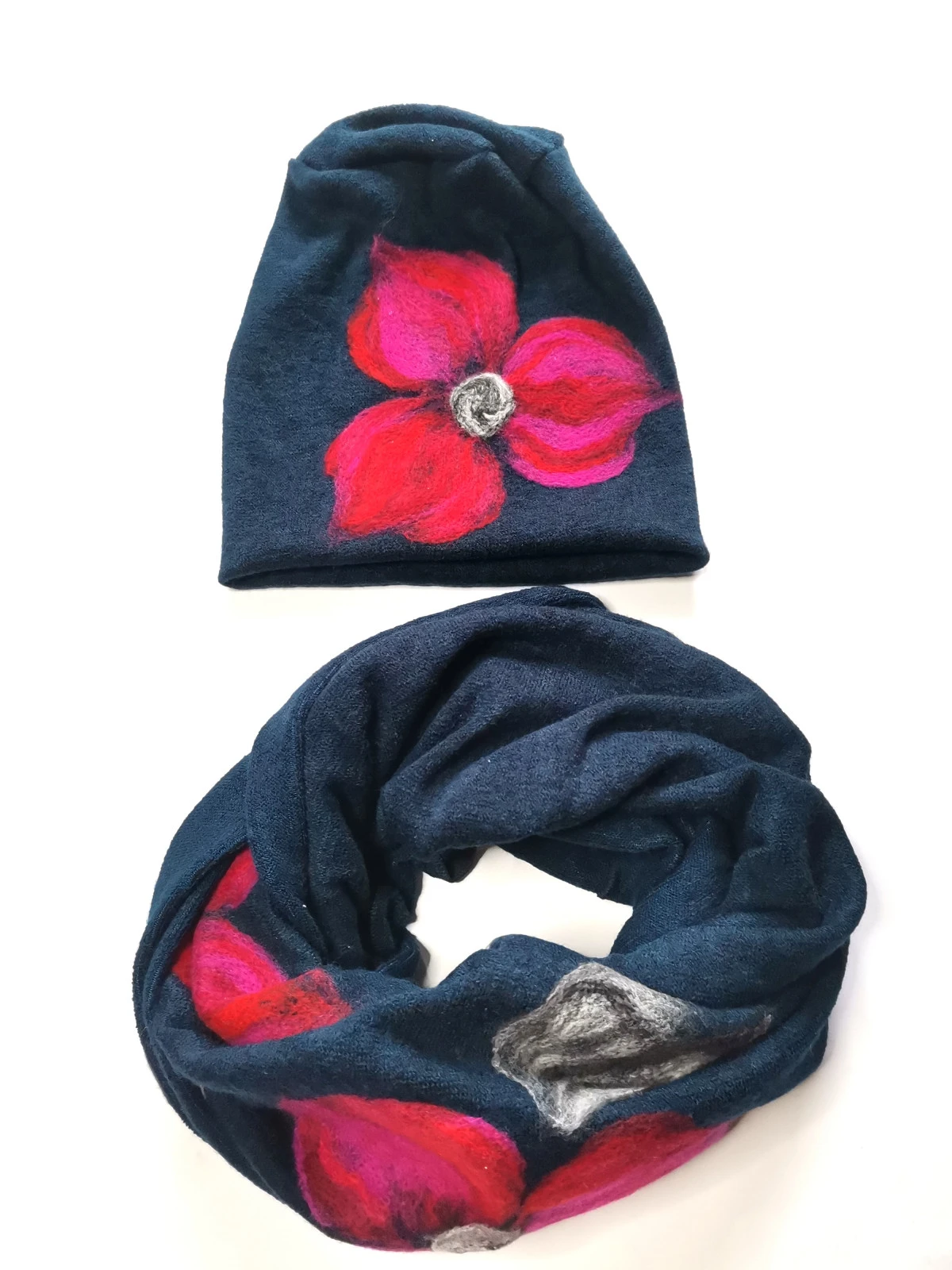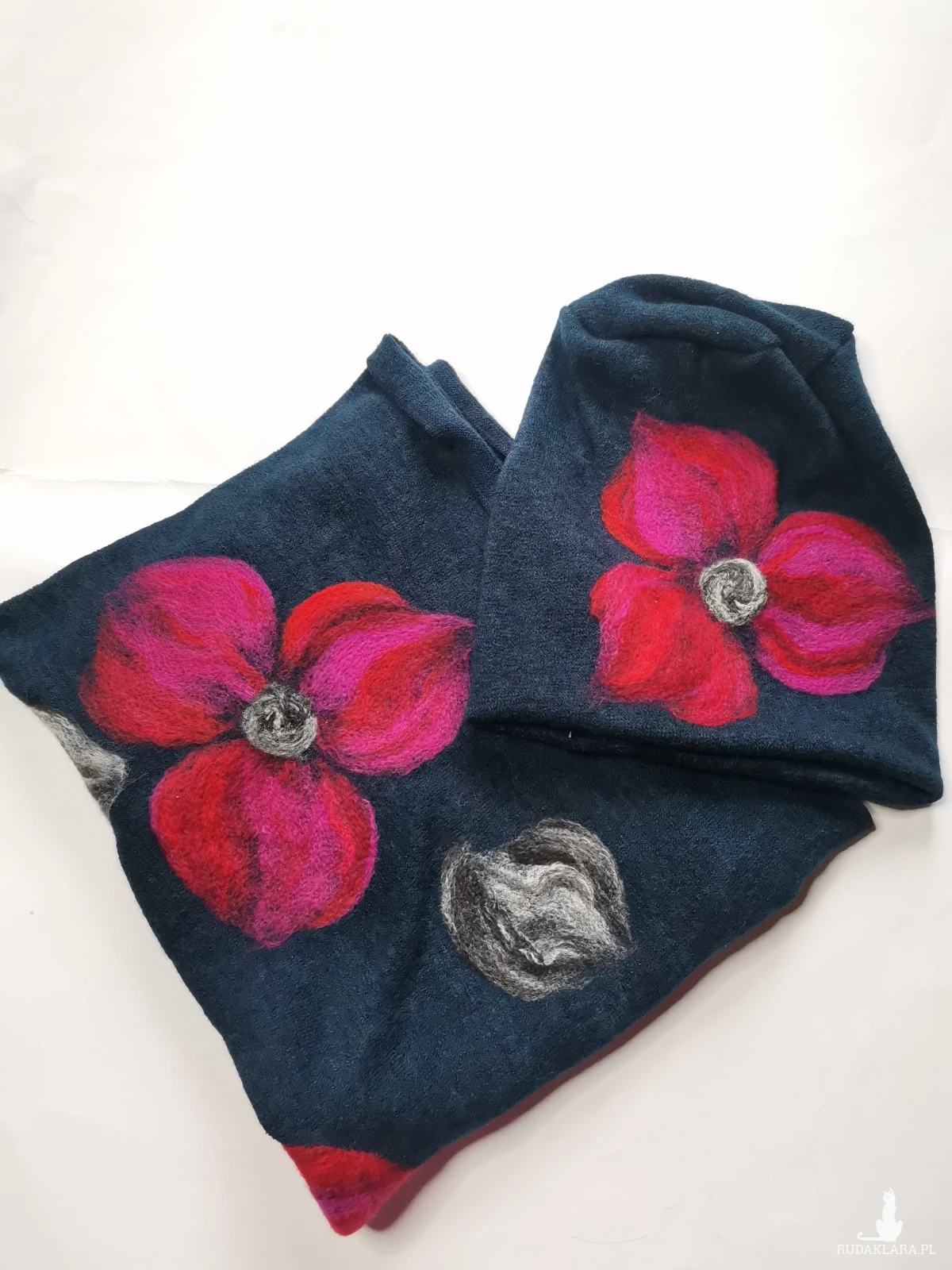 Czarny wełniany komplet w kwiaty idealny na zimę filcowany wełną - wełna z kwiatami zachwyca godzinami- czapka wełniana obwód 59-61cm, miękka, miła na podszewce, komin wełniany, komplet filcowany wełną merynosów, cudny, ciepły, doskonały na codzienne noszenie, na prezent, na dłużej, polecam box f1