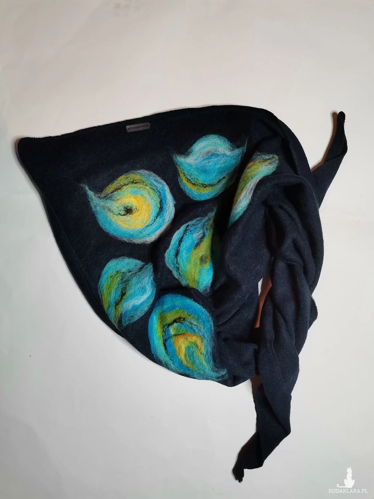 Czarna chusta handmade wełniana, elementy filcowane to wełna merynosów, produkt wysokiej jakości, chusta miła i ciepła, doskonała na chłodne dni, idealna na prezent, wspaniała na codzienne noszenie, zwraca uwagę swą oryginalnością, miękko układa się wokół szyi, absolutny bestseller polecam ostatnia