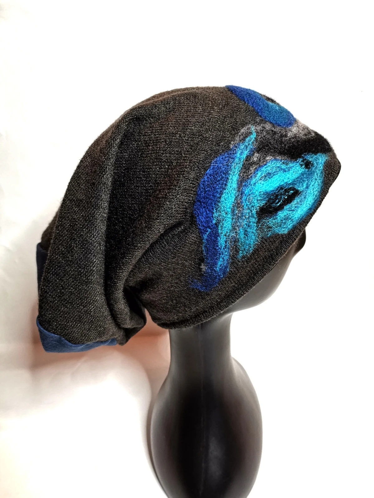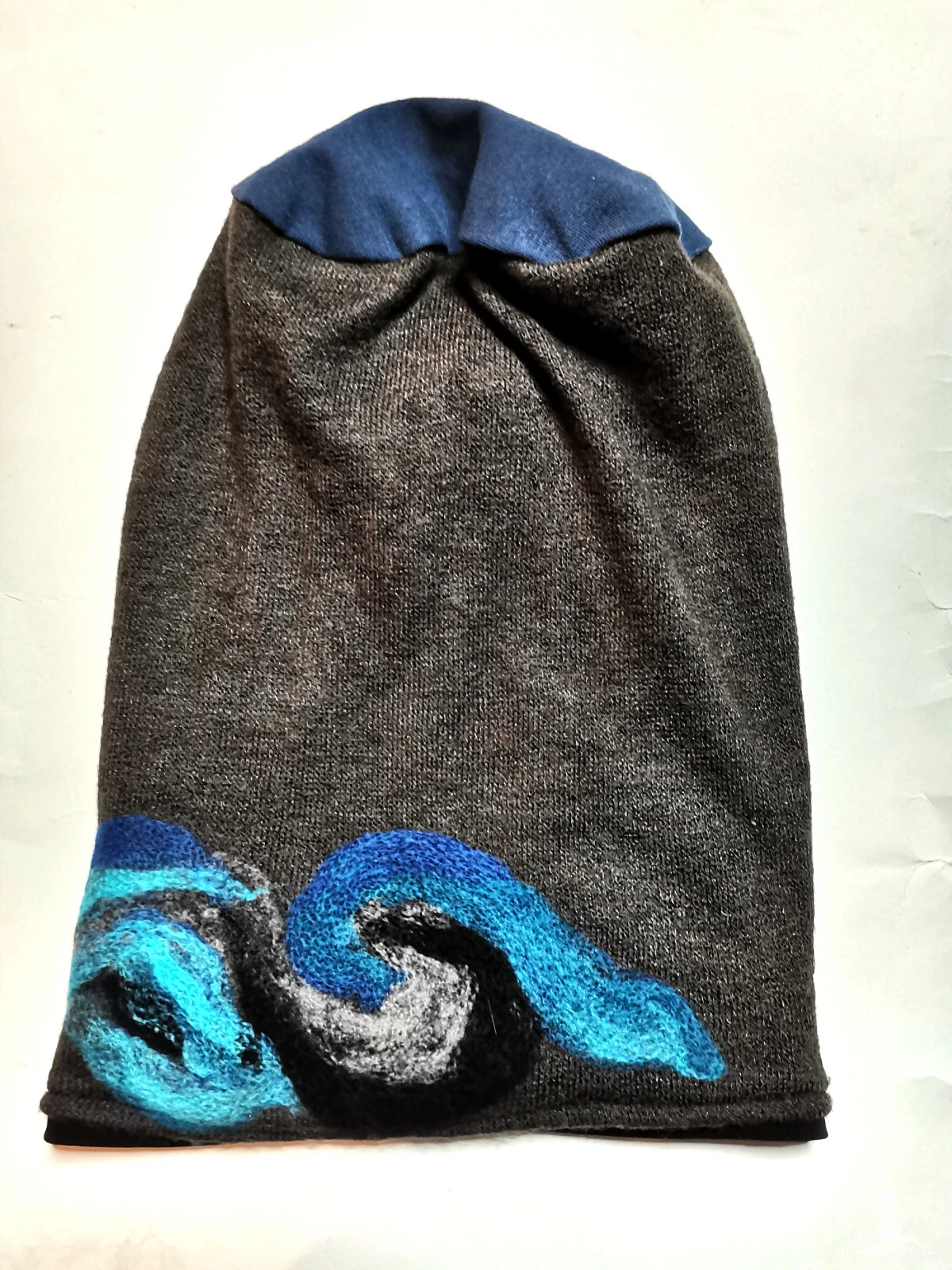 czapka wełniana filcowana zimowa handmade w kwiaty na podszewce-- rozmiar uniwersalny, wełniana, filcowana wełną merynosów, bardzo ciepła, fantastyczna, miła, miękko układa się na głowie, niesamowicie zwraca uwagę, doskonałą na codzienne noszenie jak i na prezent, zawsze możesz ją założyć po basenie i przeżyjesz z mokrą głową:) naprawdę superowa ostatnia box t1