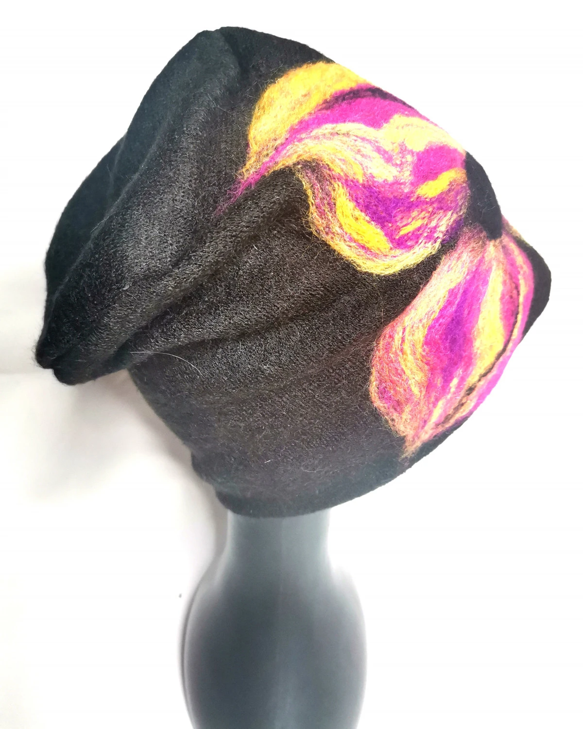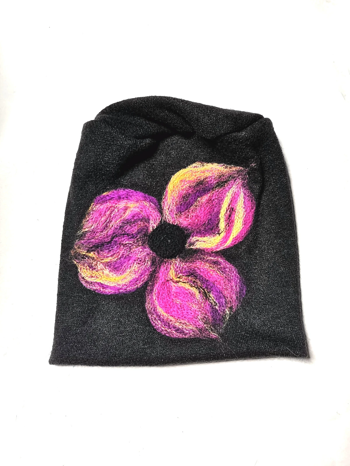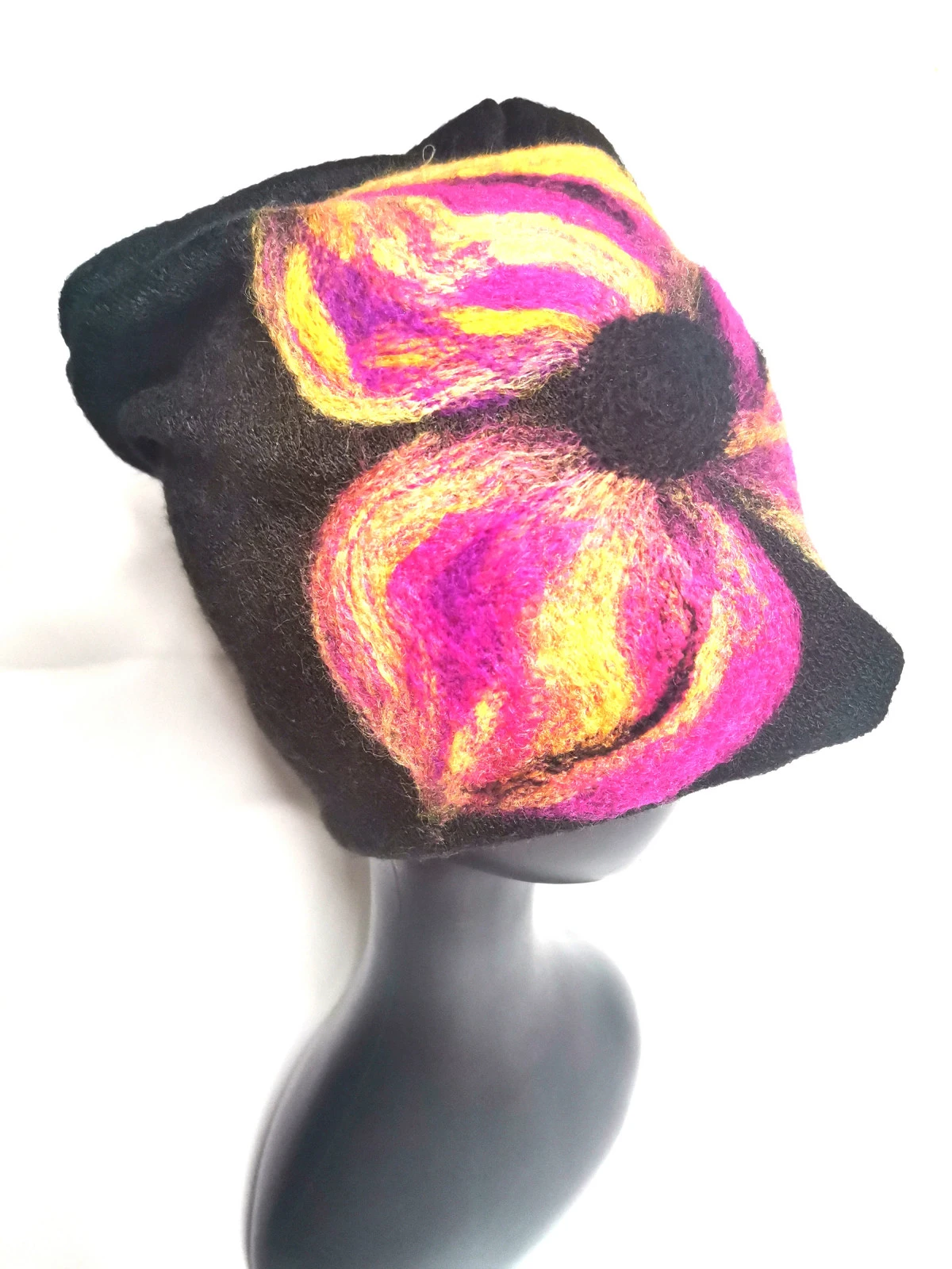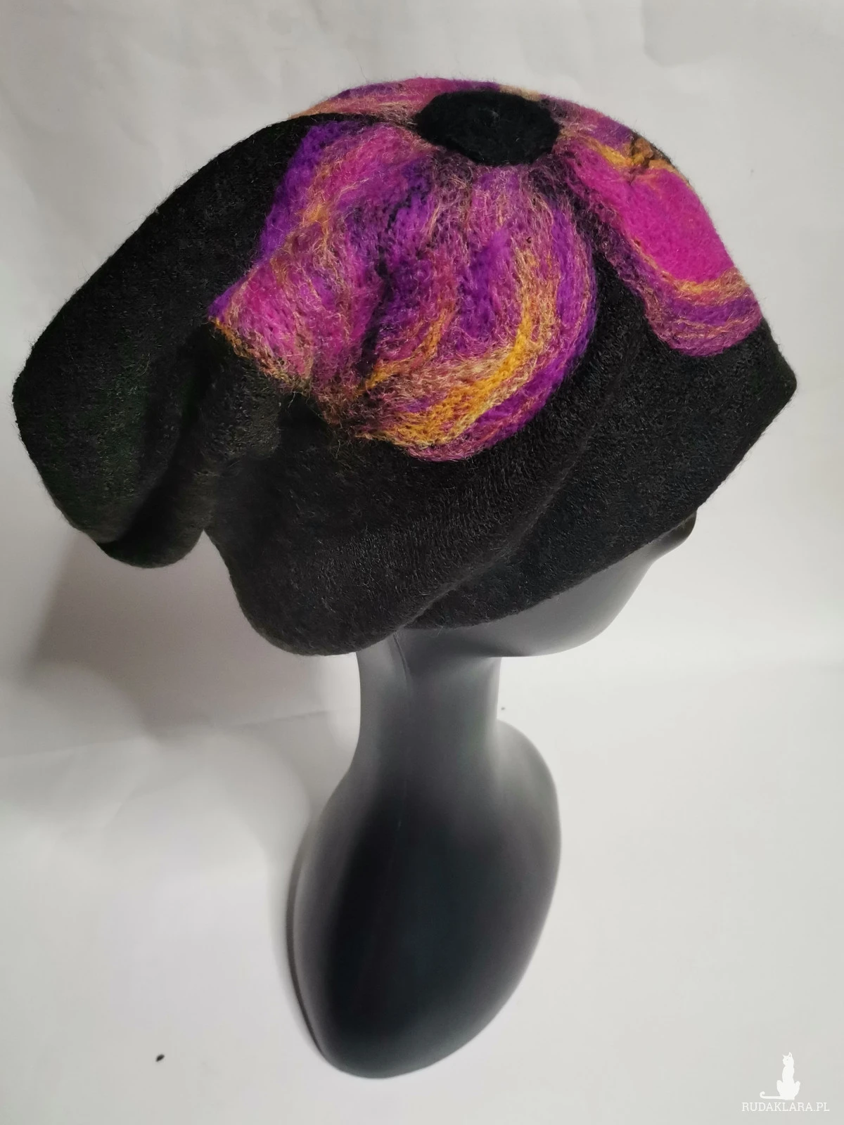 czapka wełniana filcowana zimowa handmade w kwiaty na podszewce-- rozmiar uniwersalny, wełniana, filcowana wełną merynosów, bardzo ciepła, fantastyczna, miła, miękko układa się na głowie, niesamowicie zwraca uwagę, doskonałą na codzienne noszenie jak i na prezent, zawsze możesz ją założyć po basenie i przeżyjesz z mokrą głową:) naprawdę superowa -pojedyncze egzemplarze box f1
