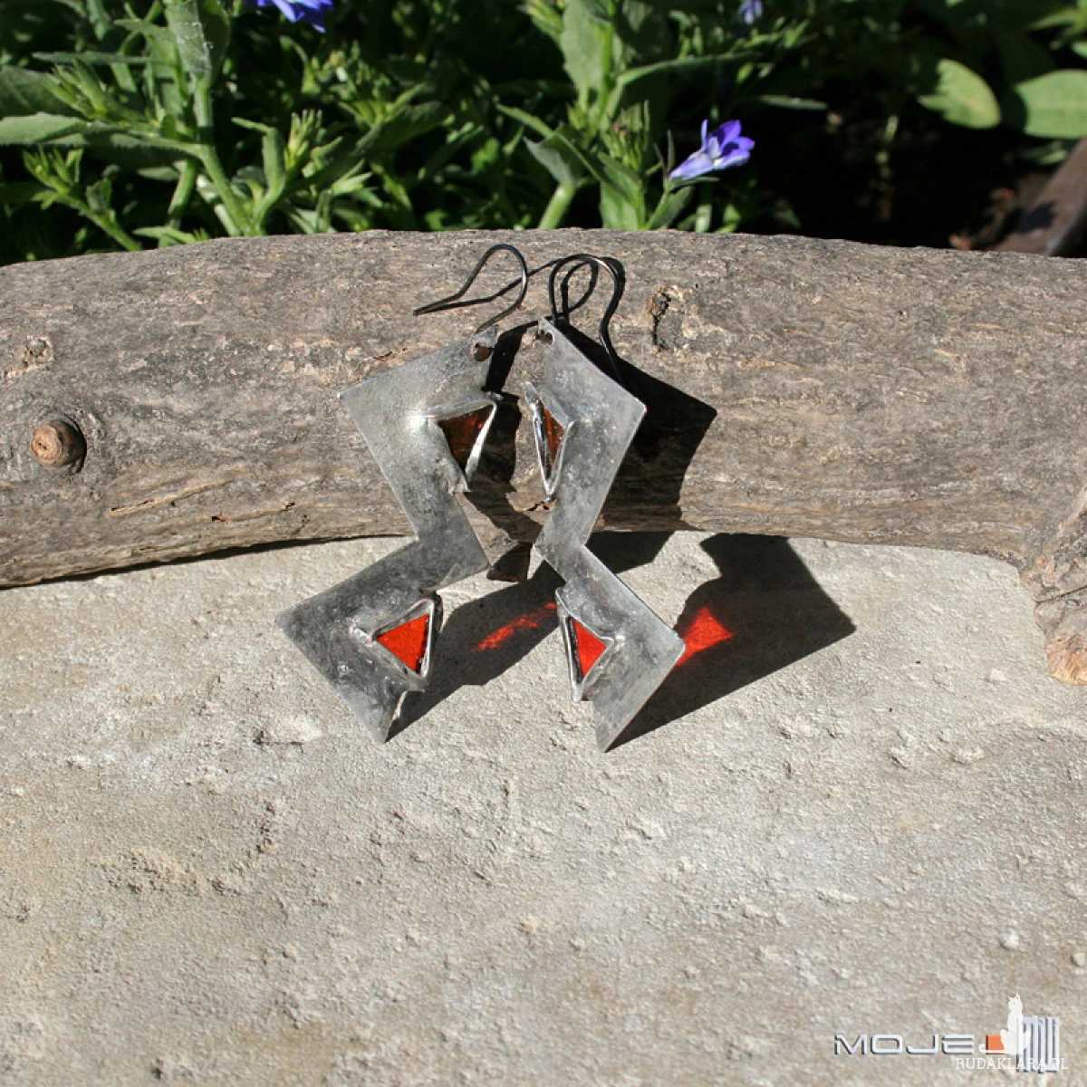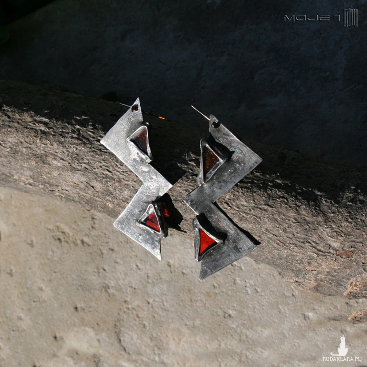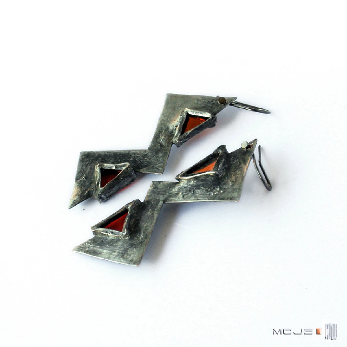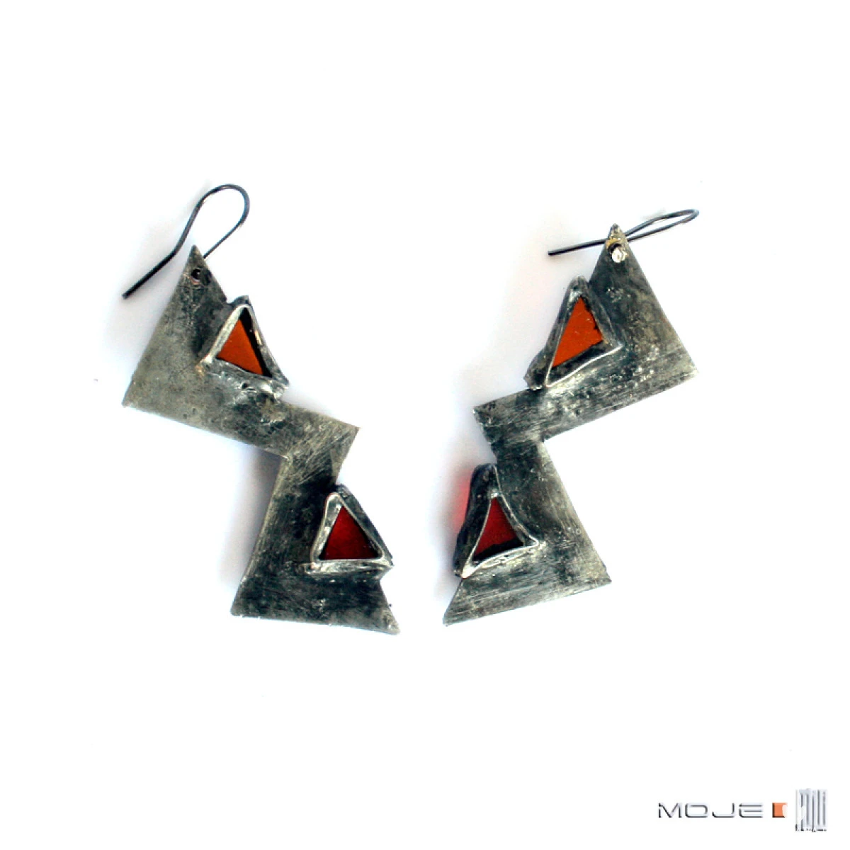 Ostre, dynamiczne, surowe w swoim wyglądzie i wyraziste zarazem kolczyki wykonane z pomarańczowego witrażowego szkła oprawionego w miedź. Miedź jest cynowana, patynowana na grafitowo, przecierana i drapana.