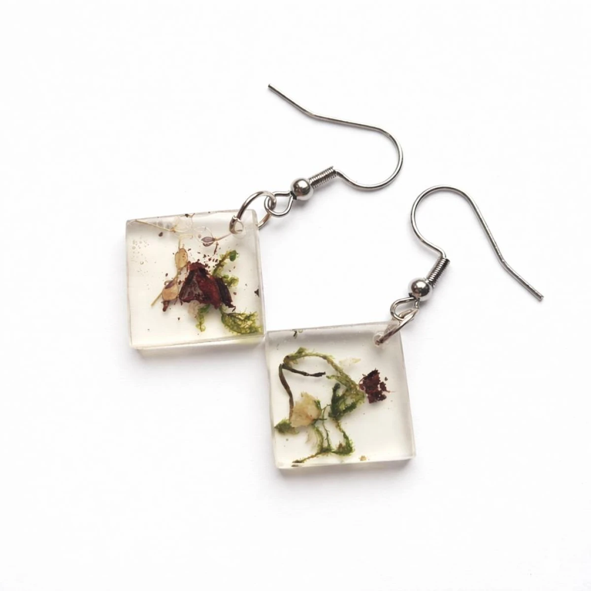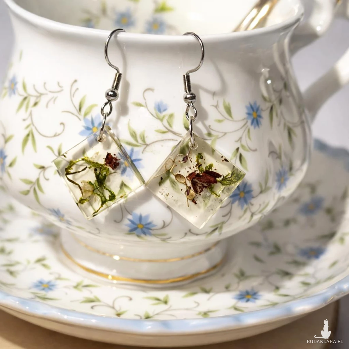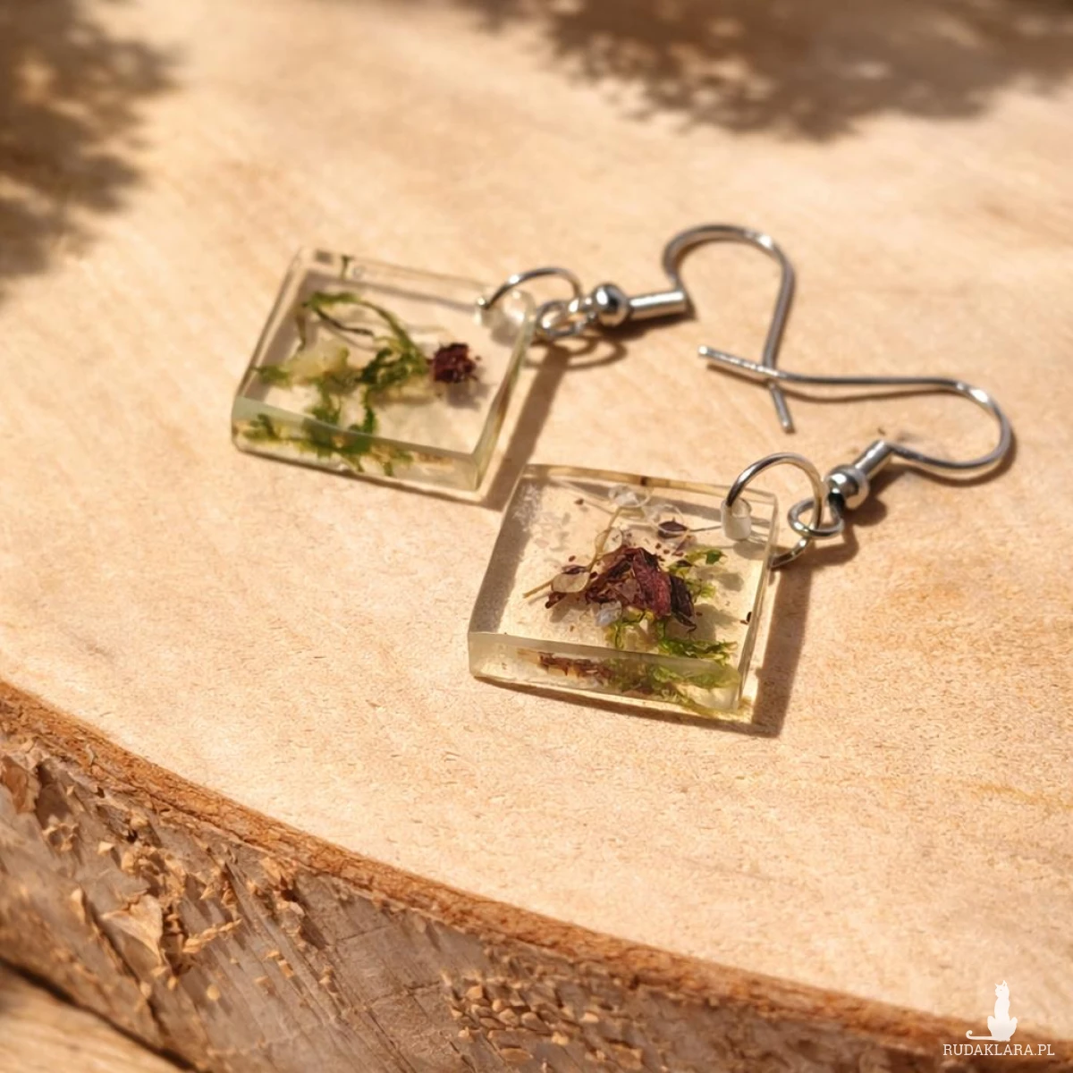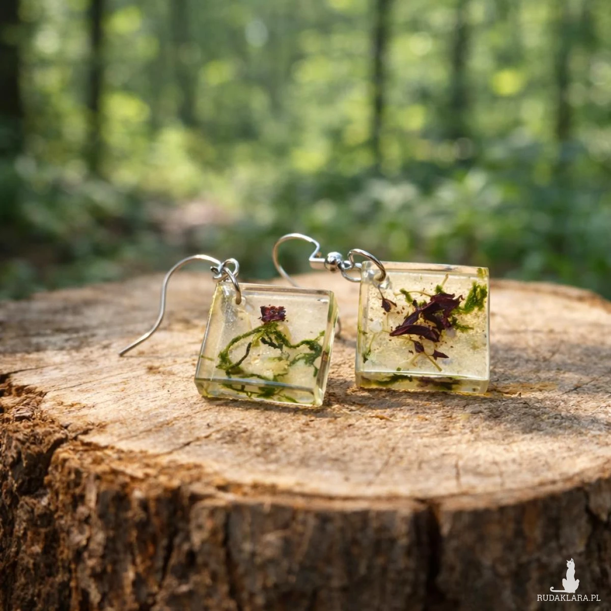 Wyjątkowe kolczyki handmade, w których zatopione zostały prawdziwe elementy natury – mech i fragmenty kory. Transparentna żywica podkreśla ich strukturę, tworząc efekt „lasu zamkniętego w biżuterii”.