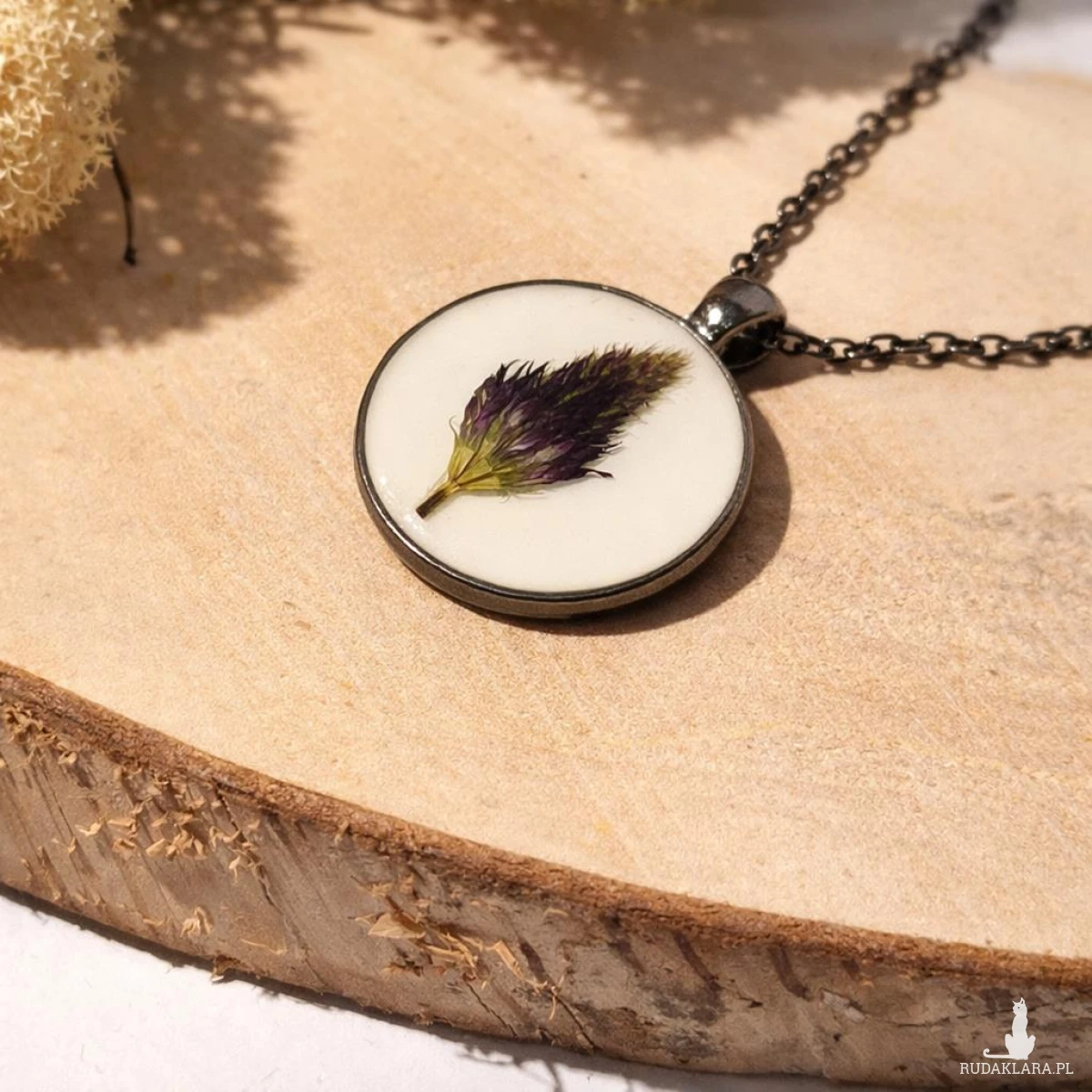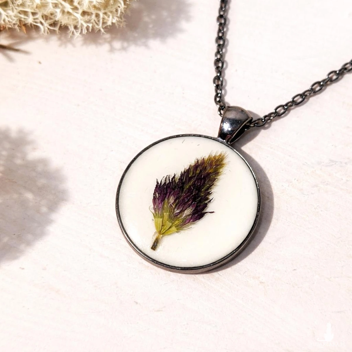 Wyjątkowy wisiorek z żywicy epoksydowej z zatopionym naturalnym kwiatem koniczyny w odcieniach fioletu. Okrągła forma i antracytowa oprawa nadają mu nowoczesnego, eleganckiego charakteru.