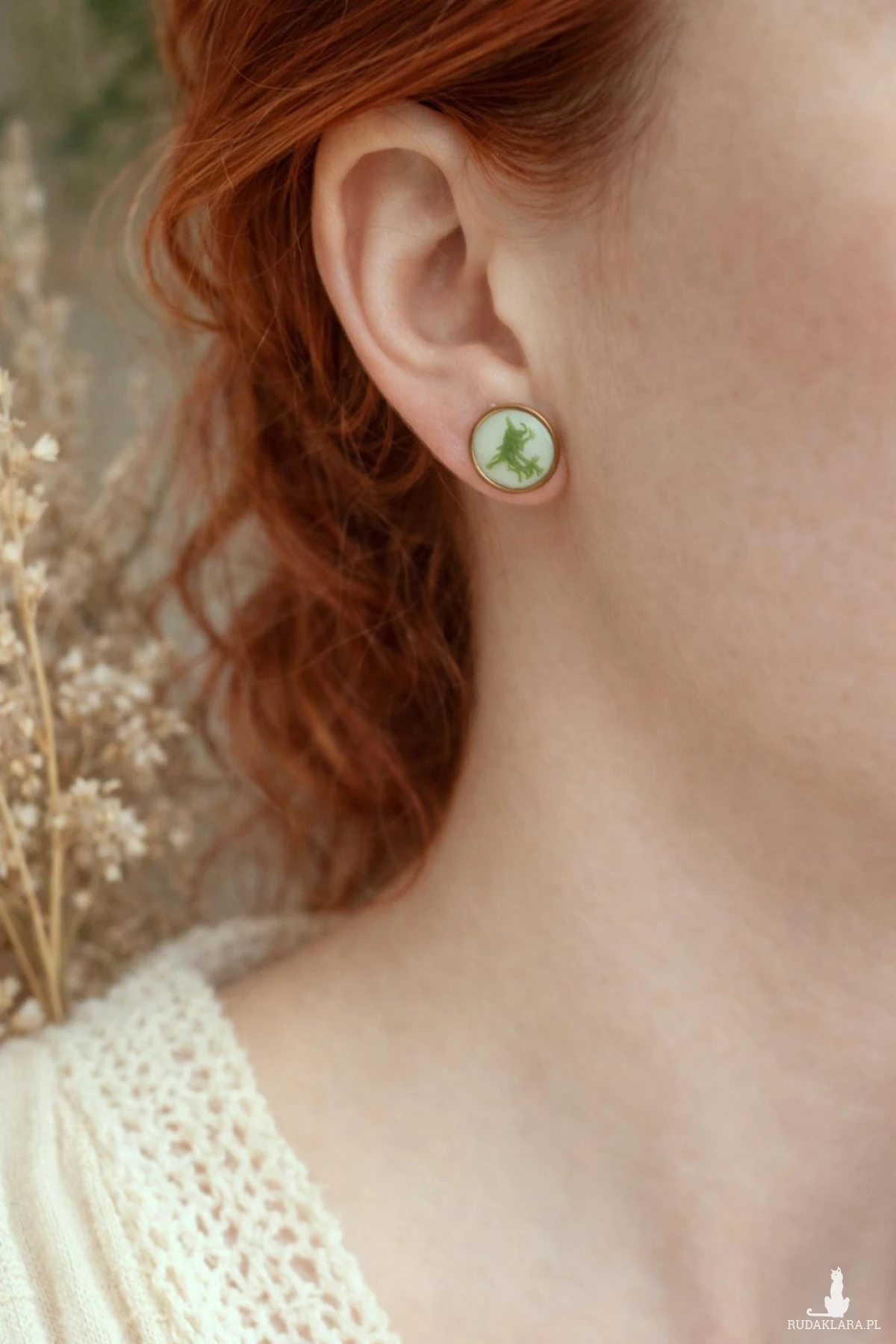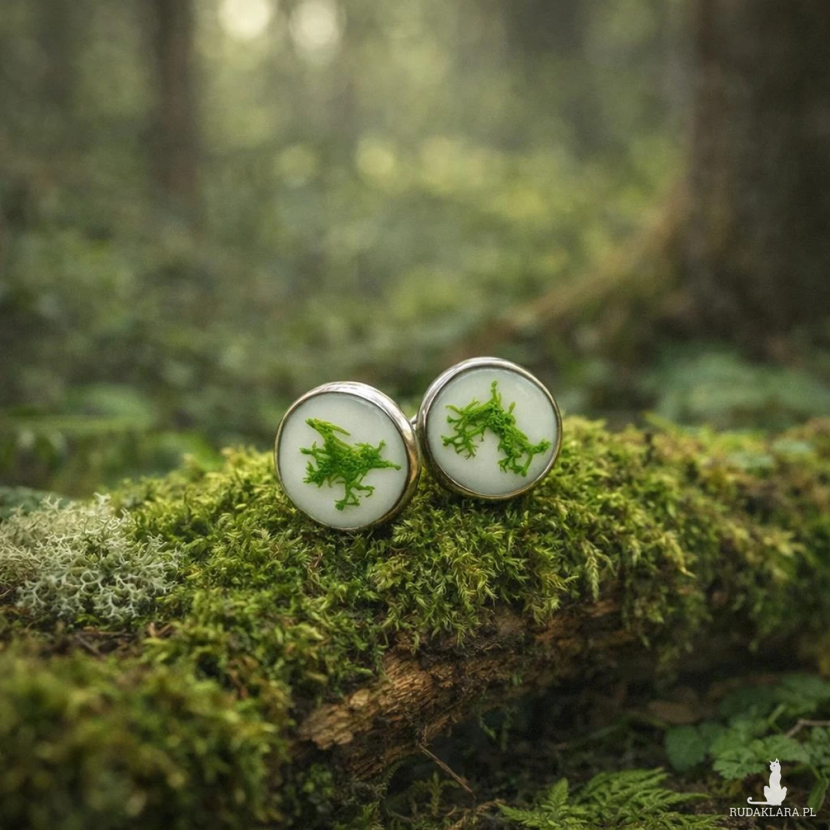 Każda para kolczyków jest tworzona ręcznie, dlatego układ mchu w żywicy jest unikalny i niepowtarzalny.
