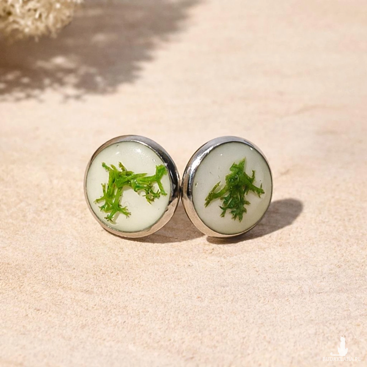 Subtelne kolczyki wkrętki wykonane z krystalicznej żywicy z zatopionym naturalnym mchem chrobotkiem. Minimalistyczny design i srebrna oprawa sprawiają, że są idealnym dodatkiem do codziennych stylizacji.
