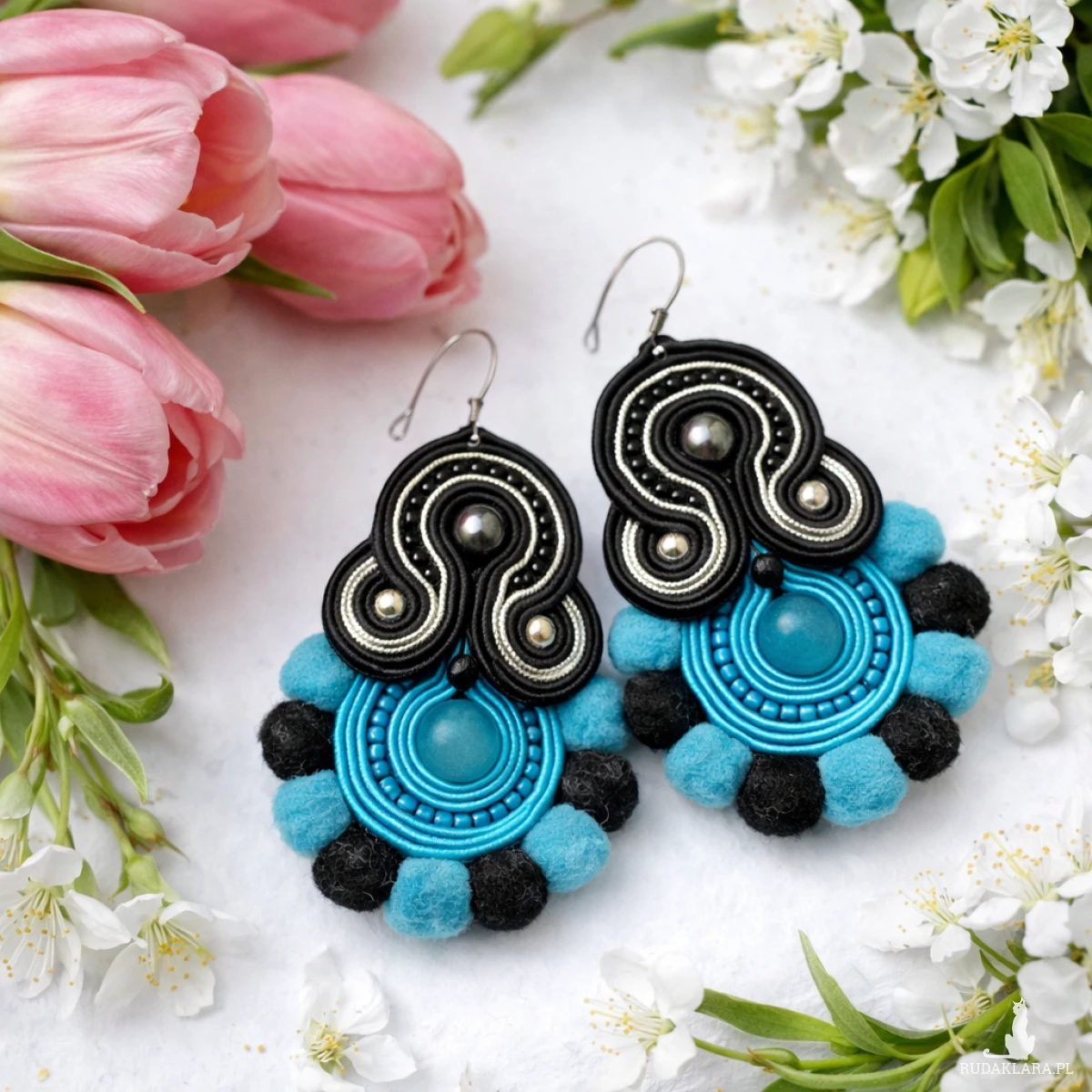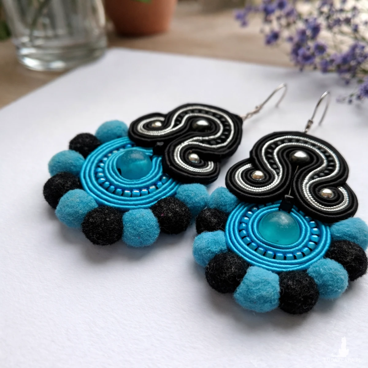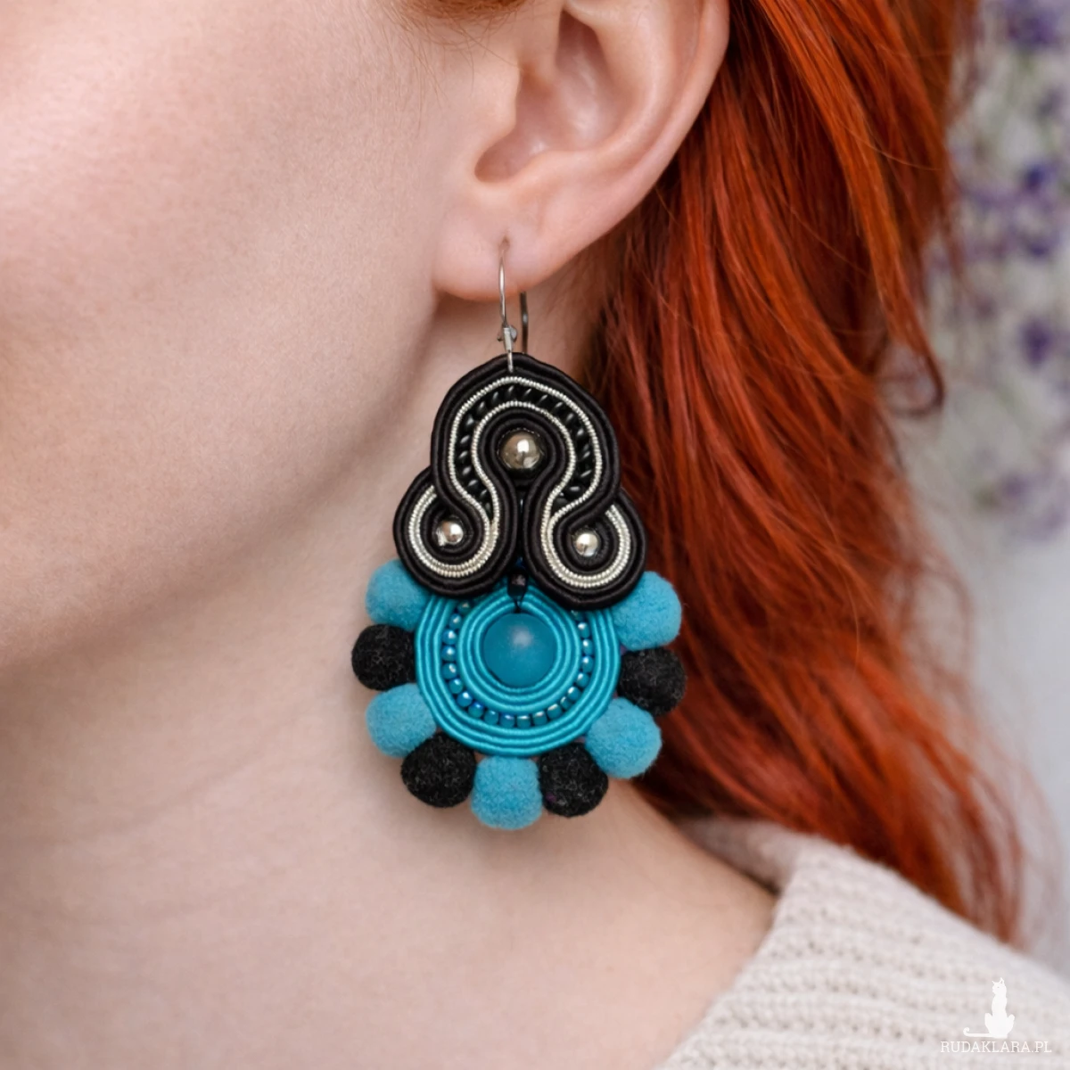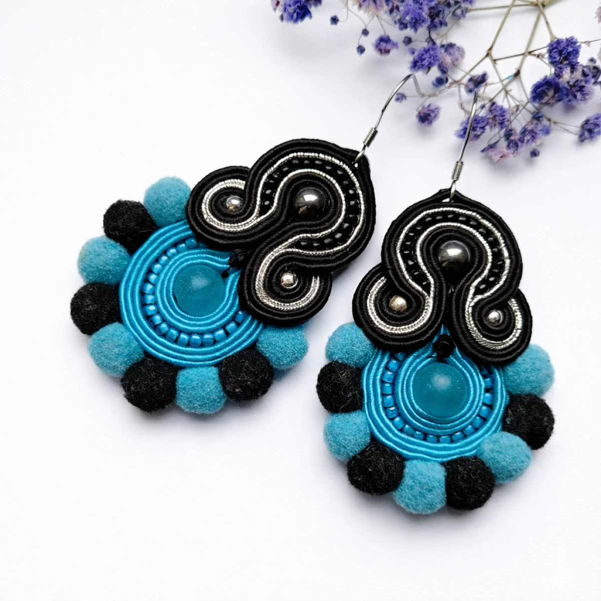 Wyjątkowe kolczyki wykonane techniką haftu sutasz to propozycja dla kobiet ceniących oryginalną biżuterię handmade. Połączenie turkusu z klasyczną czernią oraz miękkimi pomponami nadaje im artystycznego charakteru i sprawia, że doskonale uzupełniają stylizacje w klimacie boho i etno.
