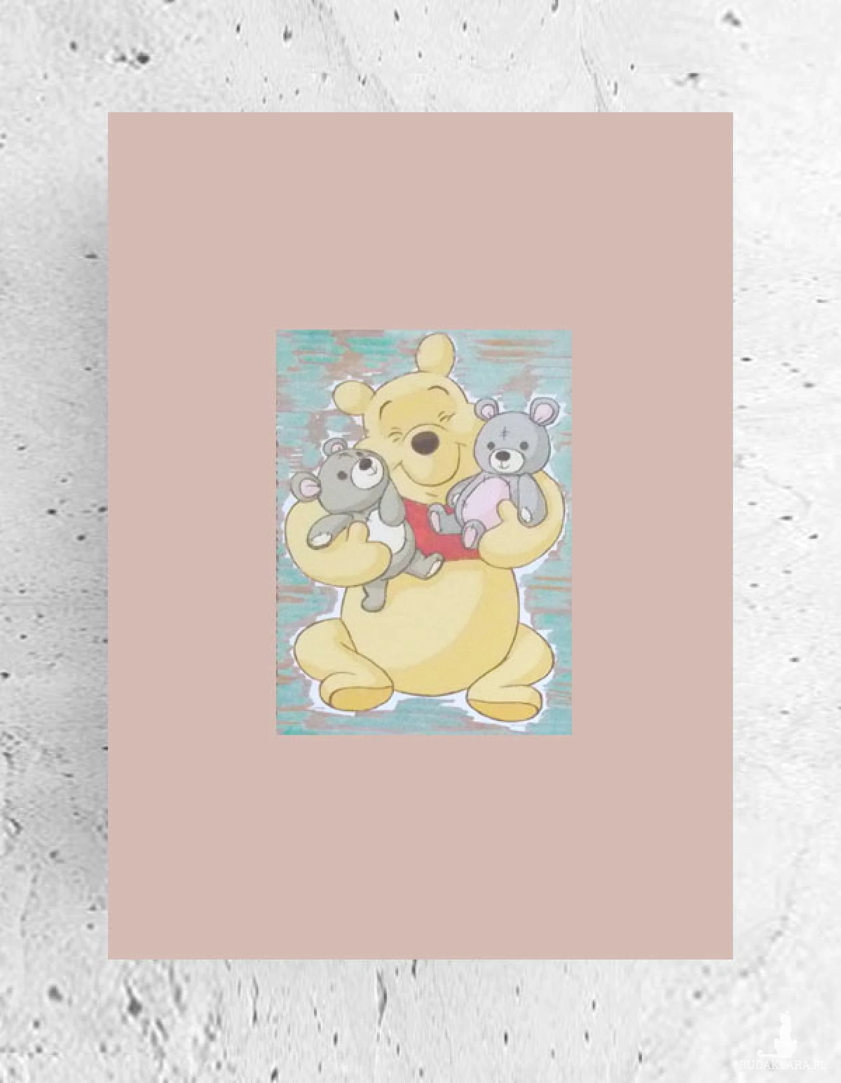 Kolorowy obrazek z Kubusiem Puchatkiem. Plakat na ścianę do dziecięcego pokoju, kuchni, jadalni, sypialni, żłobka, przedszkola, bawialni, klubu malucha itp. Grafika na beżowym kartoniku w rozmiarze A4. Poster wystarczy dać do ramki w rozmiarze 21 x 30 cm..