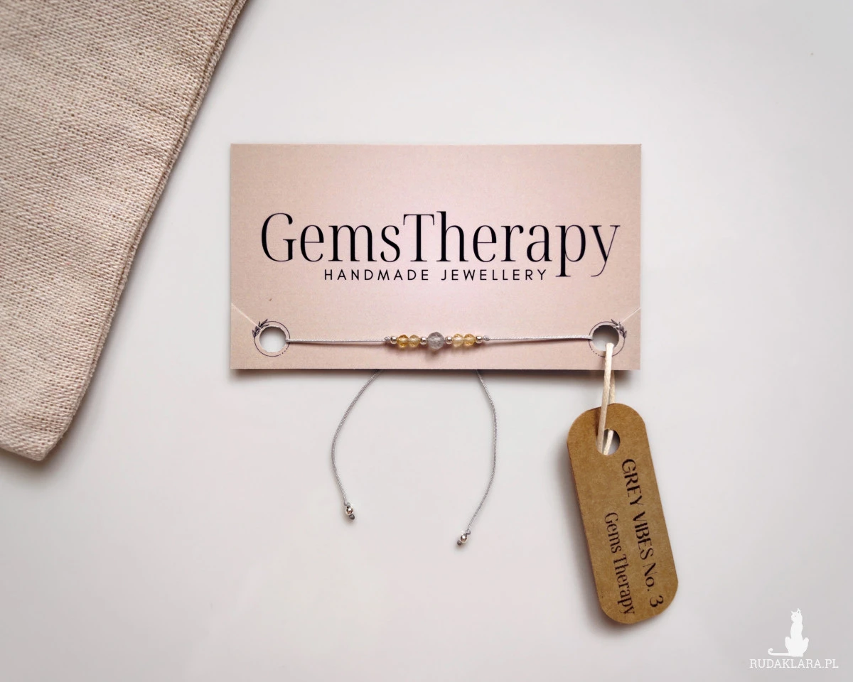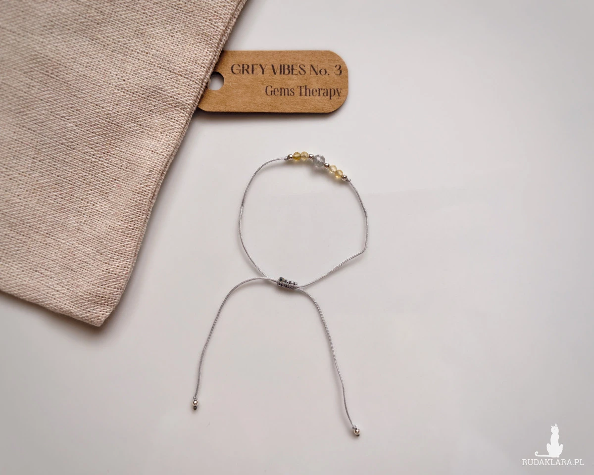 Wyróżniające się połączenie szarego labradorytu oraz żółtego cytrynu na delikatnym szarym sznurku. Wszystko ozdobione srebrnymi kuleczkami. Subtelna, lecz wyrazista.