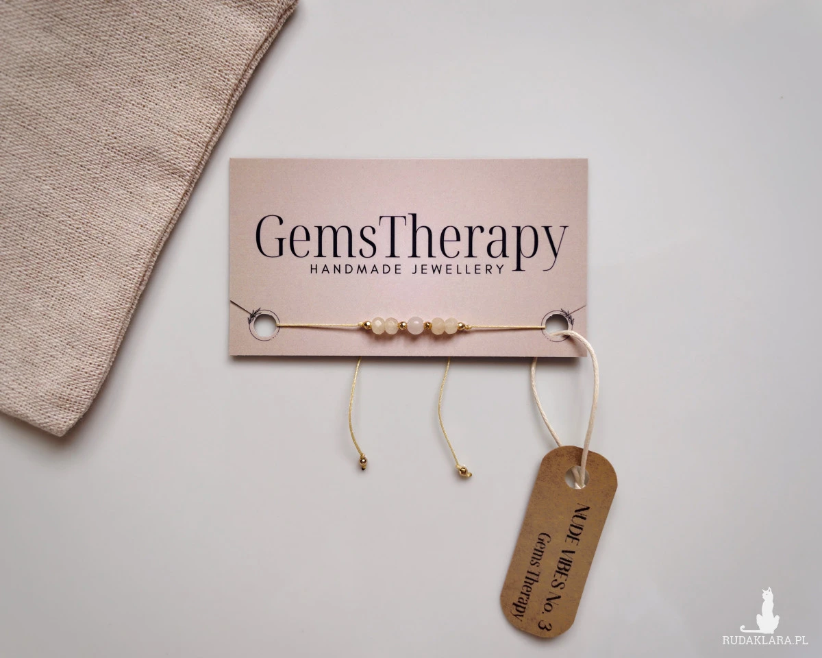 Okrągły awenturyn w towarzystwie jasnego jadeitu w kształcie oponki. Wszystko ozdobione pozłacanym hematytem na beżowo-złotym sznurku.
