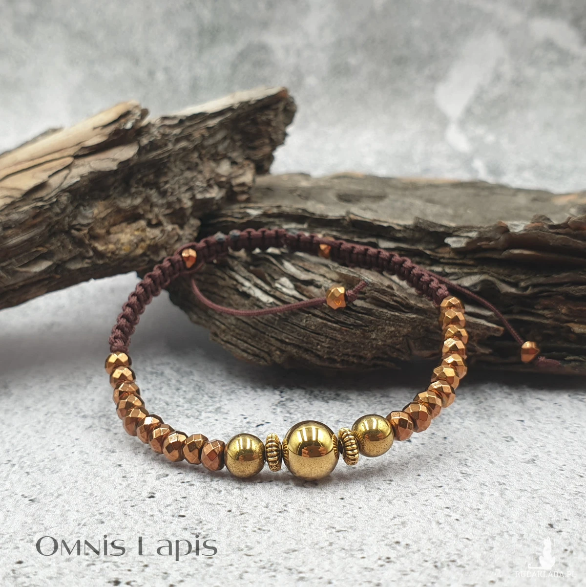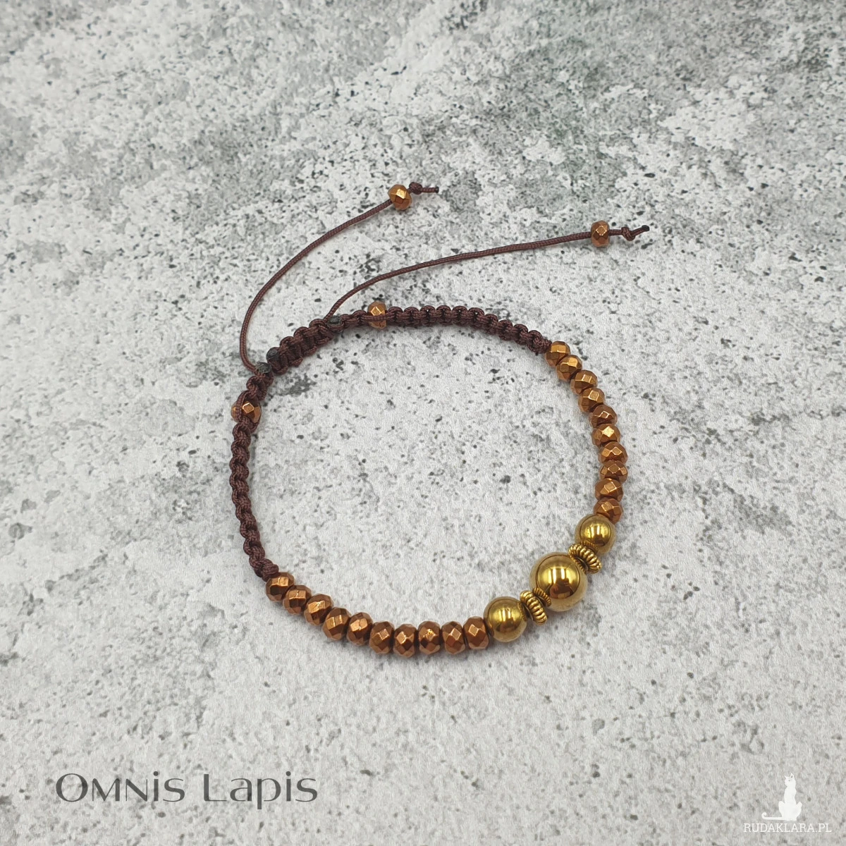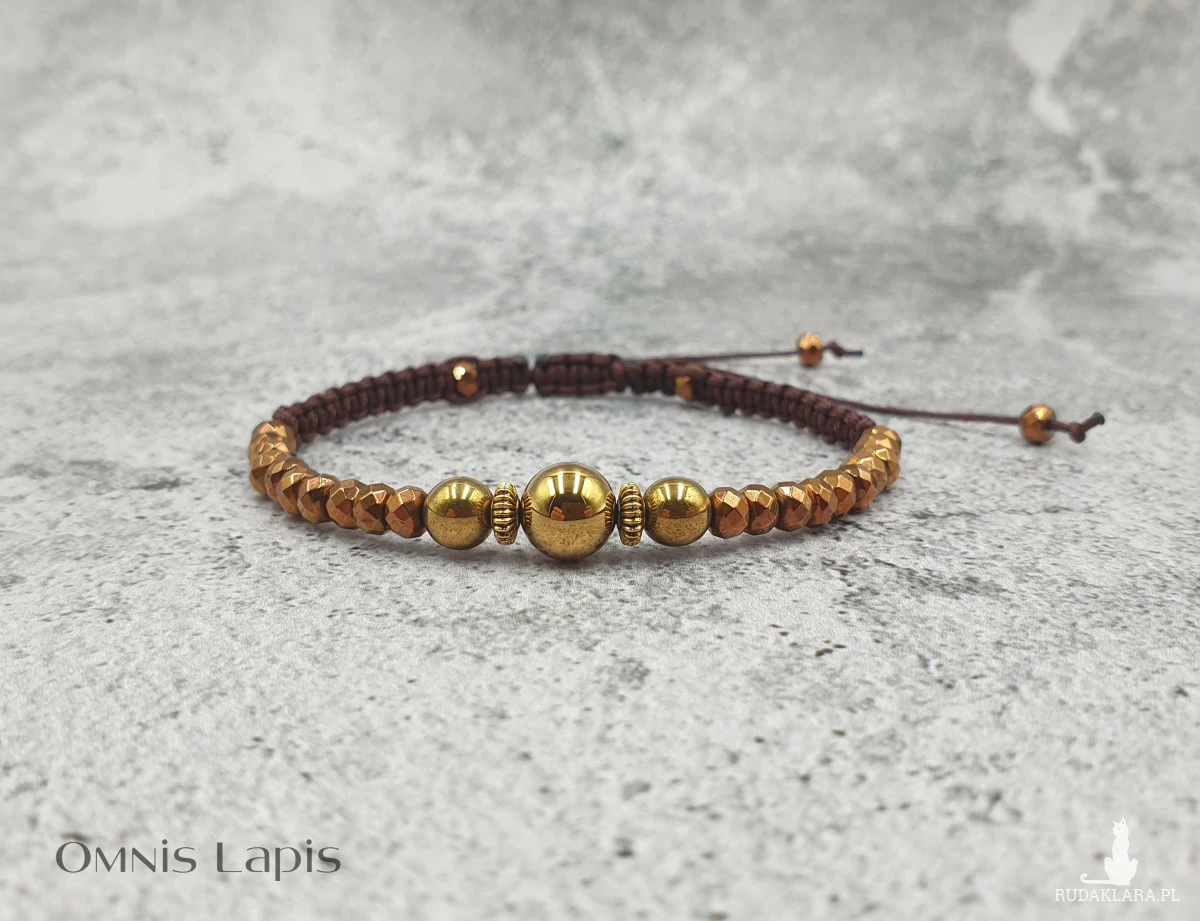 Bransoletka w kolorze brązu i złota, ozdobiona fasetowanymi oponkami i kulami hematytu. Hematyty przedzielone stalowymi przekładkami. Bransoletka wykonana w technice makramy, na mocnym, nylonowym sznurku.