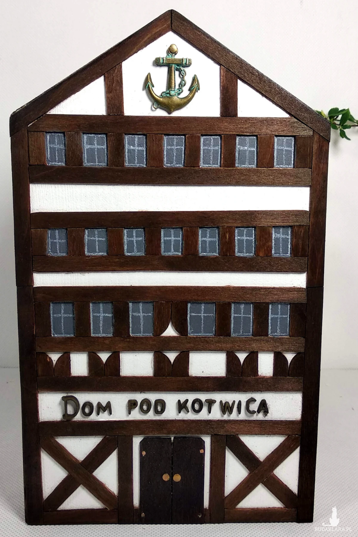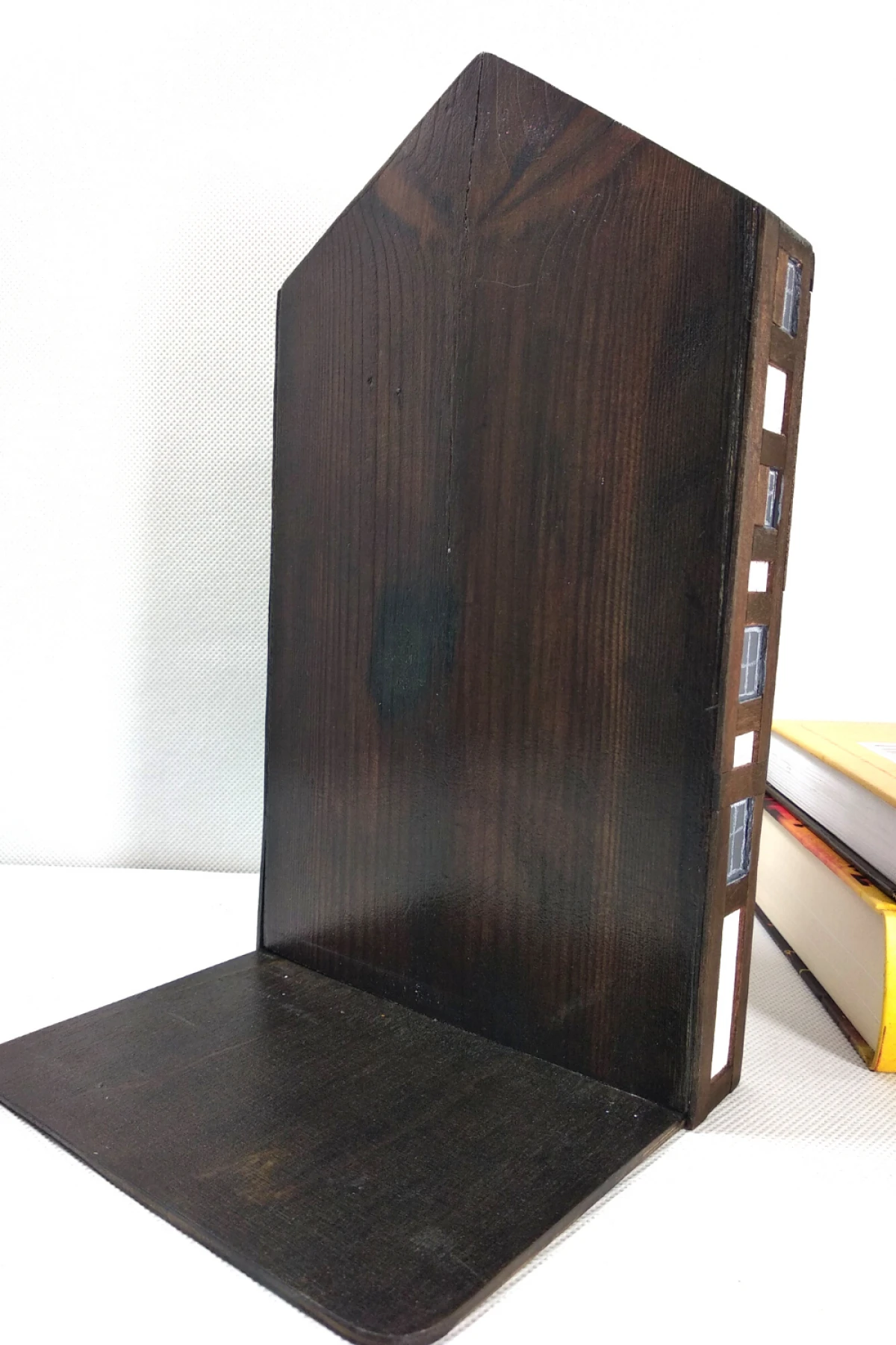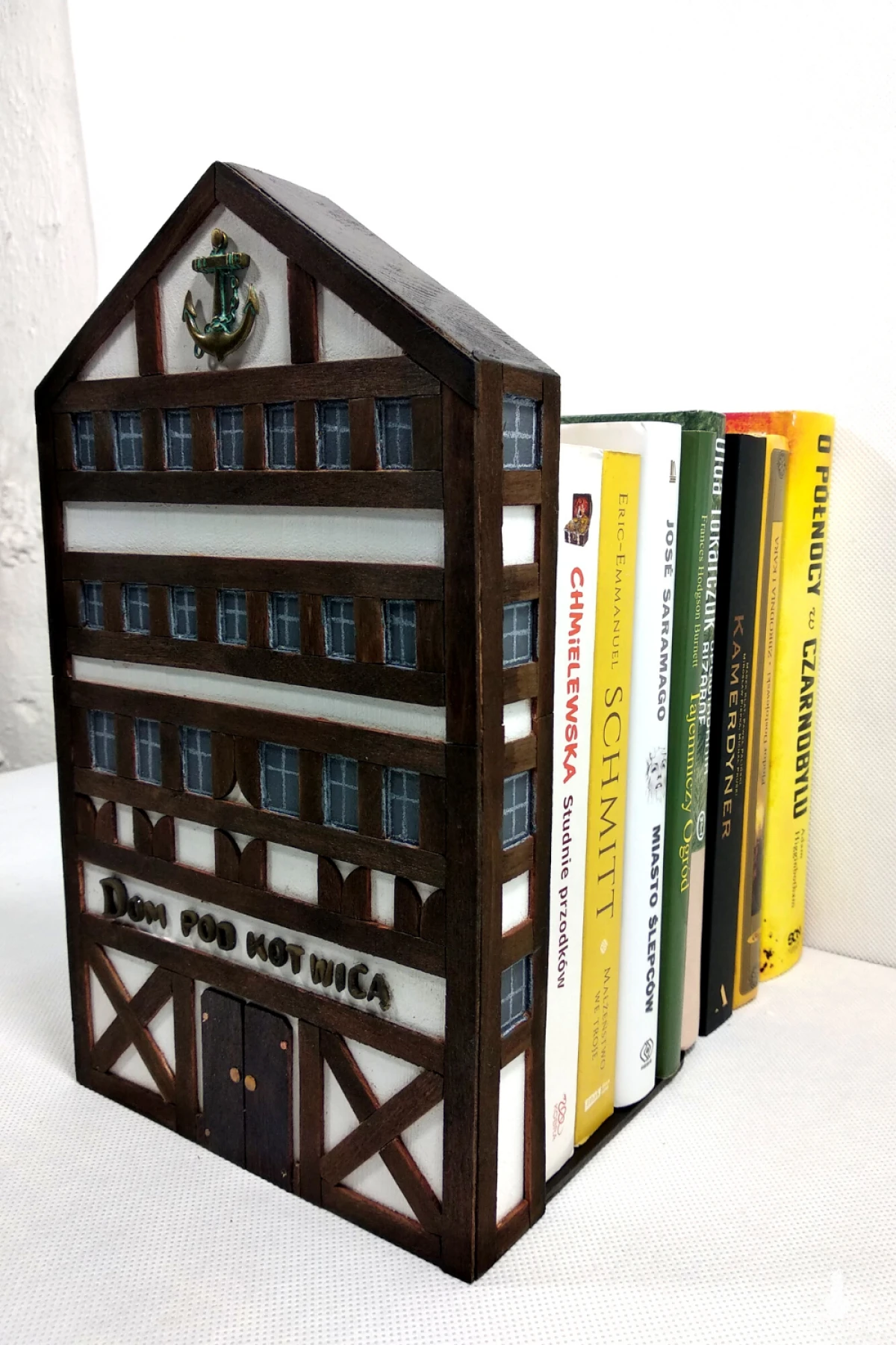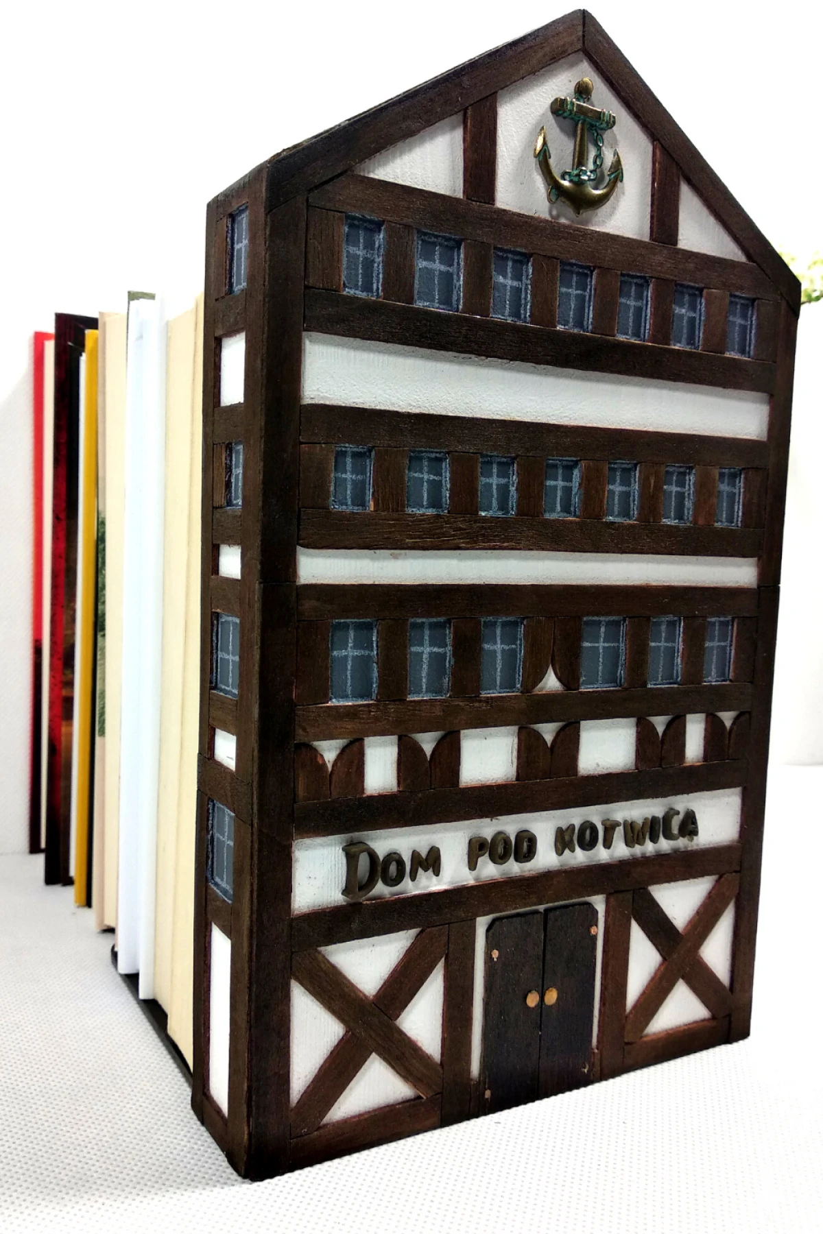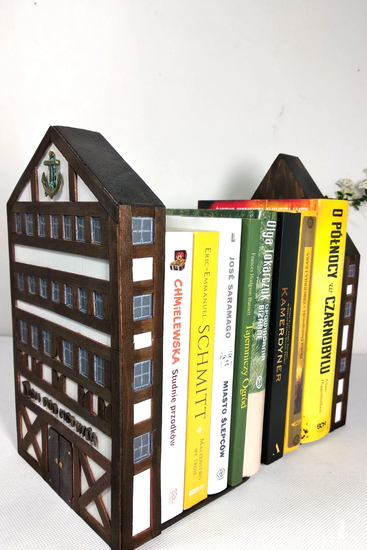 Podpórka do książek wykonana jest z drewna sosnowego. Domek malowany jest białą akrylową farbą z naniesioną aplikacją z cienkiej bejcowanej listewki. Połączenie to tworzy niepowtarzalny urok architektury szachulcowej. Podpórka jest bardzo ciekawym rozwiązaniem na utrzymanie książek w pozycji pionowej. Zaletą tego rozwiązania jest możliwość ustawienia książek opierając z jednej strony np. o ścianę czy bok mebla a z drugiej wykorzystując podpórkę. Jest to połączenie rzeczy użytkowej i zarazem bardzo dekoracyjnej. Niezależnie od tego, czy potrzebujesz podeprzeć stos książek, czy chcesz mieć dodatkowe elementy wystroju domu, podpórka jest doskonałym rozwiązaniem. Idealna propozycja dla tych, którzy szukają oryginalnego prezentu dla miłośnika książek.