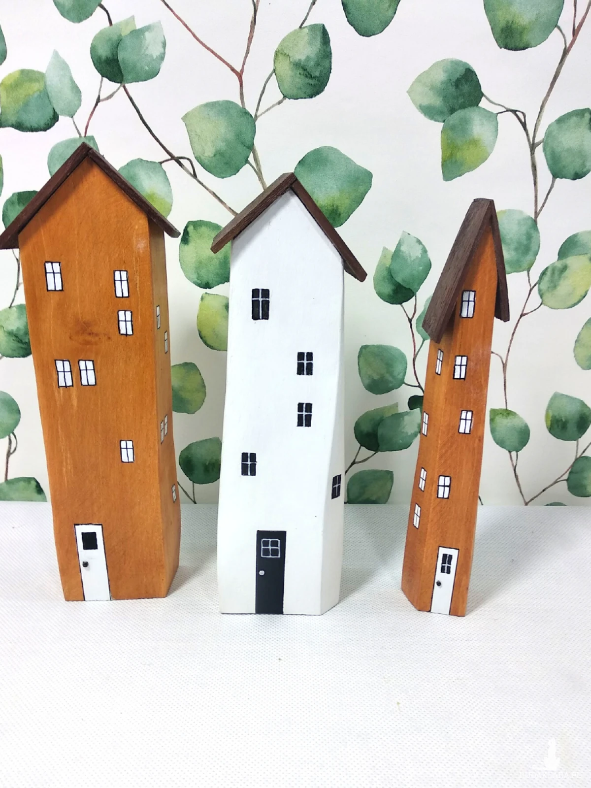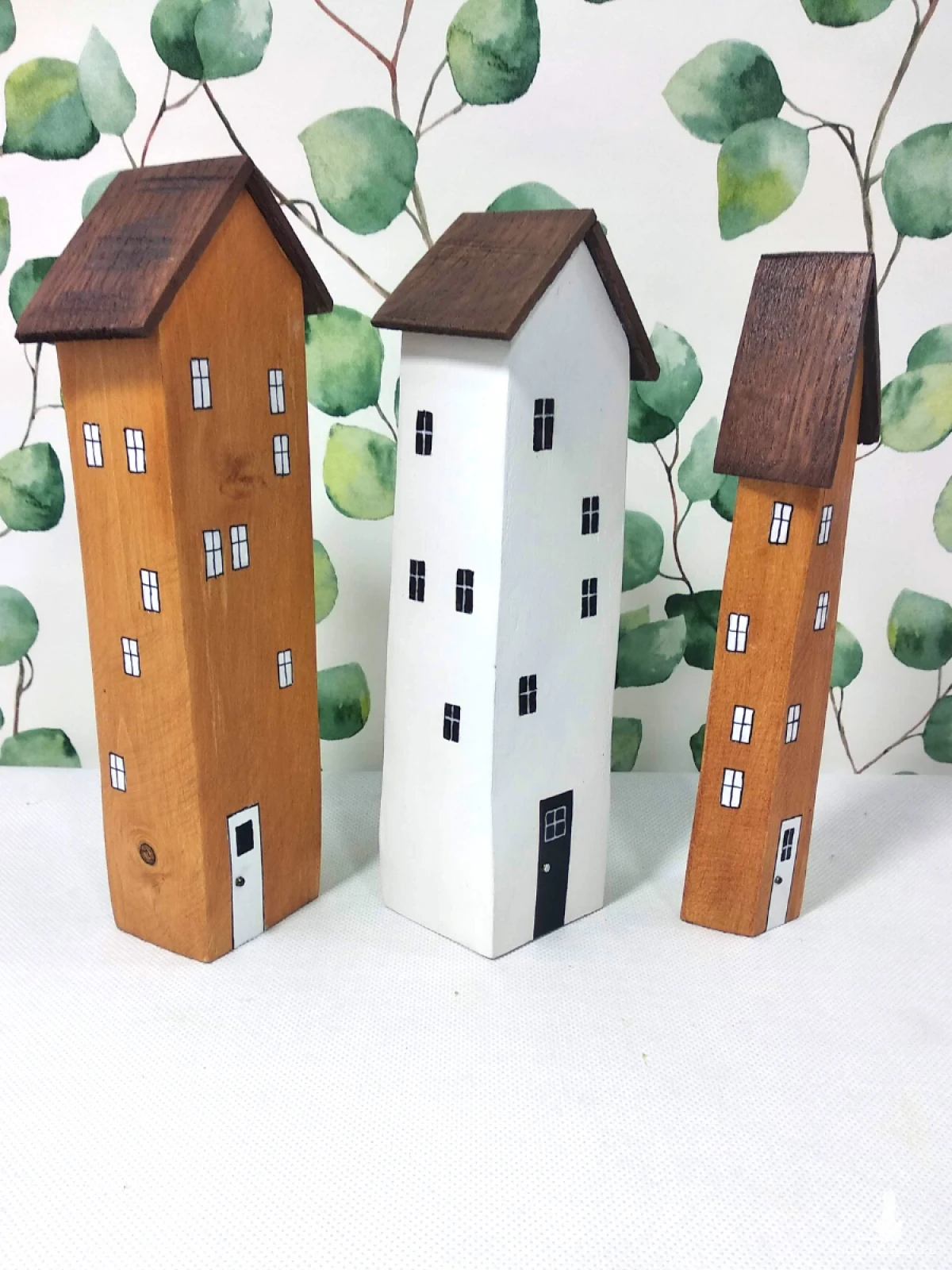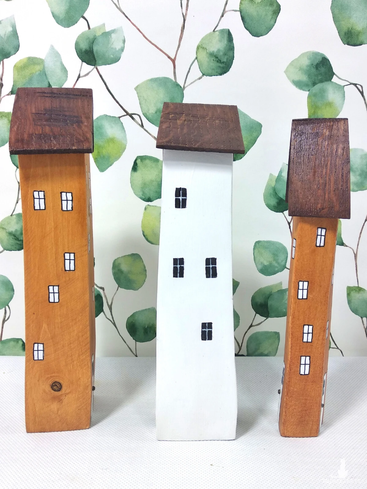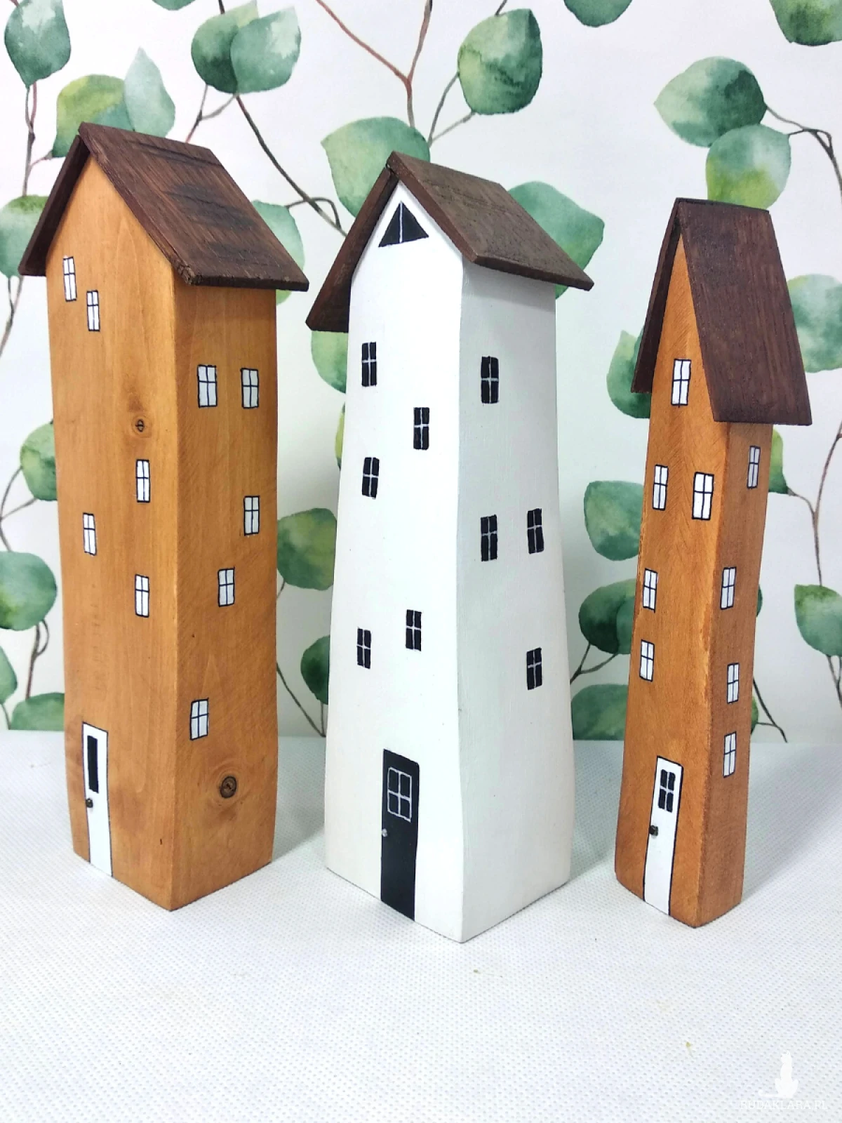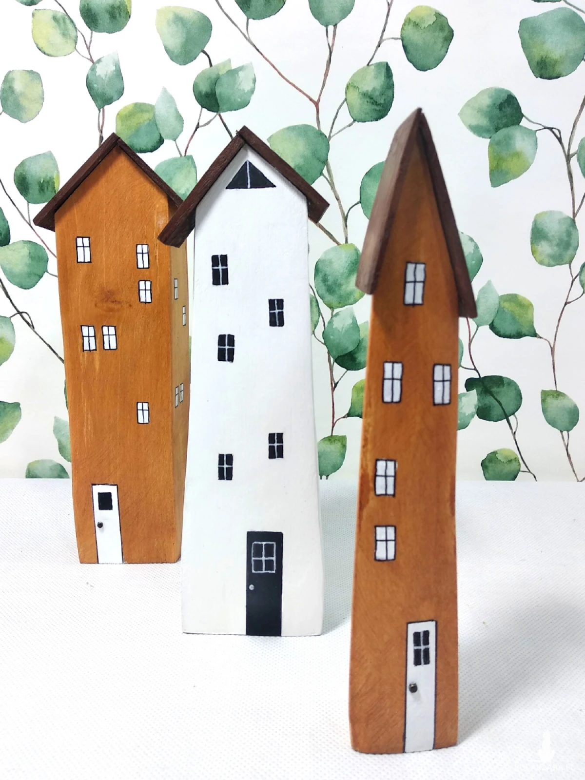 Trzy dekoracyjne domki wykonane są z drewna jesionowego. Jeden domek malowany jest akrylową białą farbą, dwa pozostałe lekko zabarwione bejcą wodną w barwie buku, zabezpieczone akrylowym satynowym lakierem. Dachy domków barwione bejcą wodną i zabezpieczone lakierem, dzięki czemu widoczny jest piękny rysunek słojów drewna. Domki posiadają okienka z każdej strony, dlatego mozna je ustawić w kazddej konfiguracji. Nieregularny kształt domków wynikający z naturalnego ulożenia słojów, nadaje im ciekawego i niepowtarzalnego wyglądu. Domki są bardzo oryginalną ozdobą każdego wnętrza. Bardzo ładnie prezentują się na parapecie okna, komodzie, półce i w każdym innym miejscu.