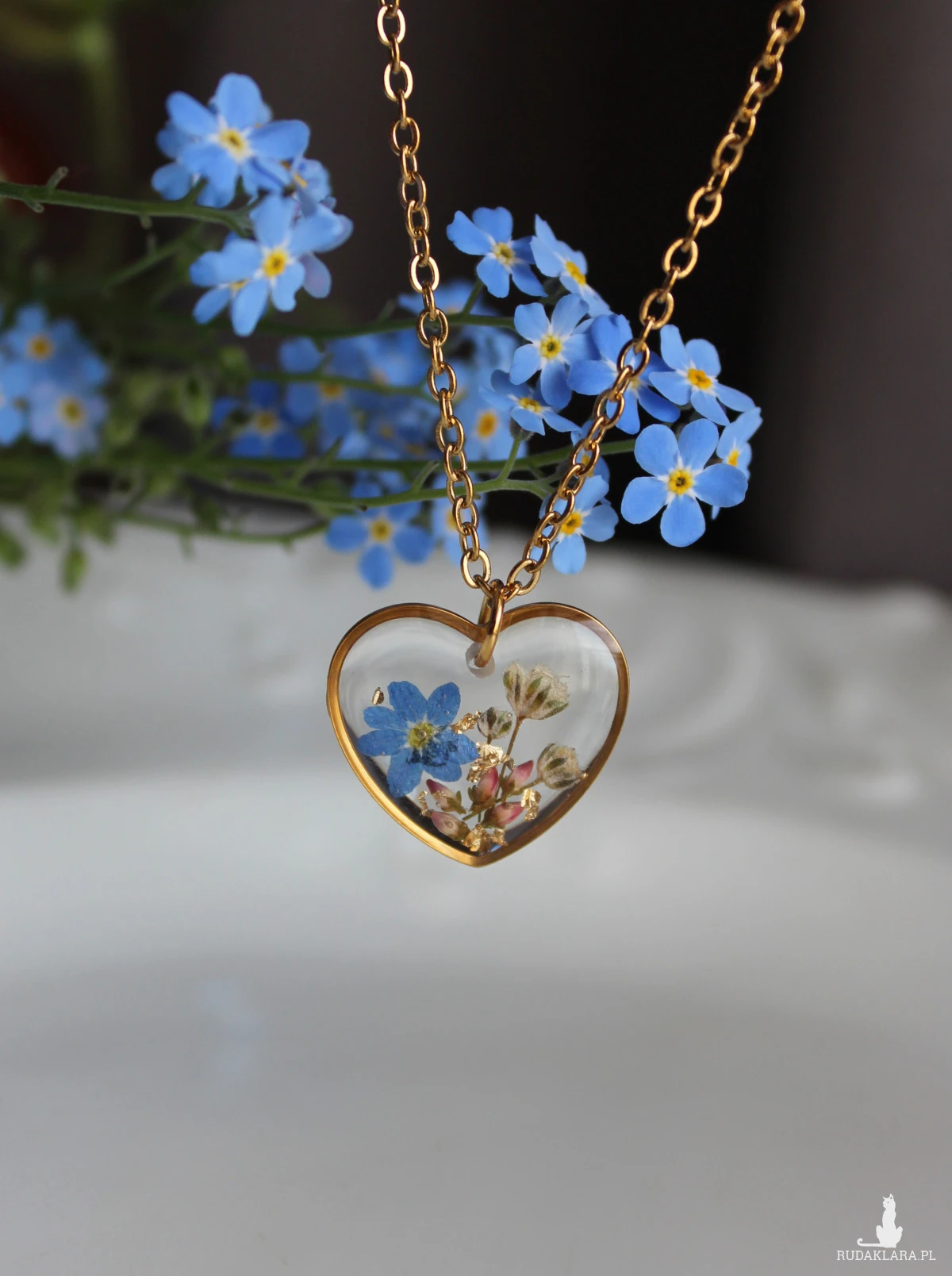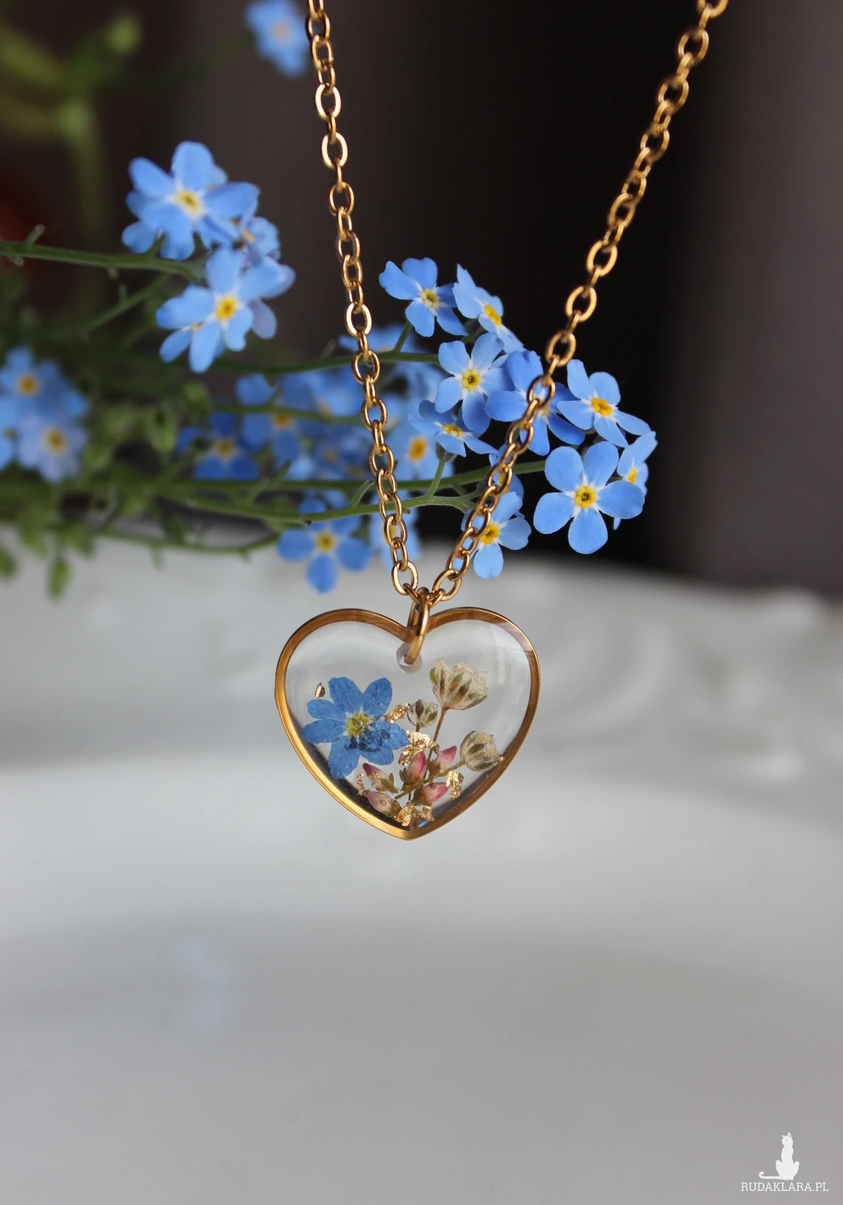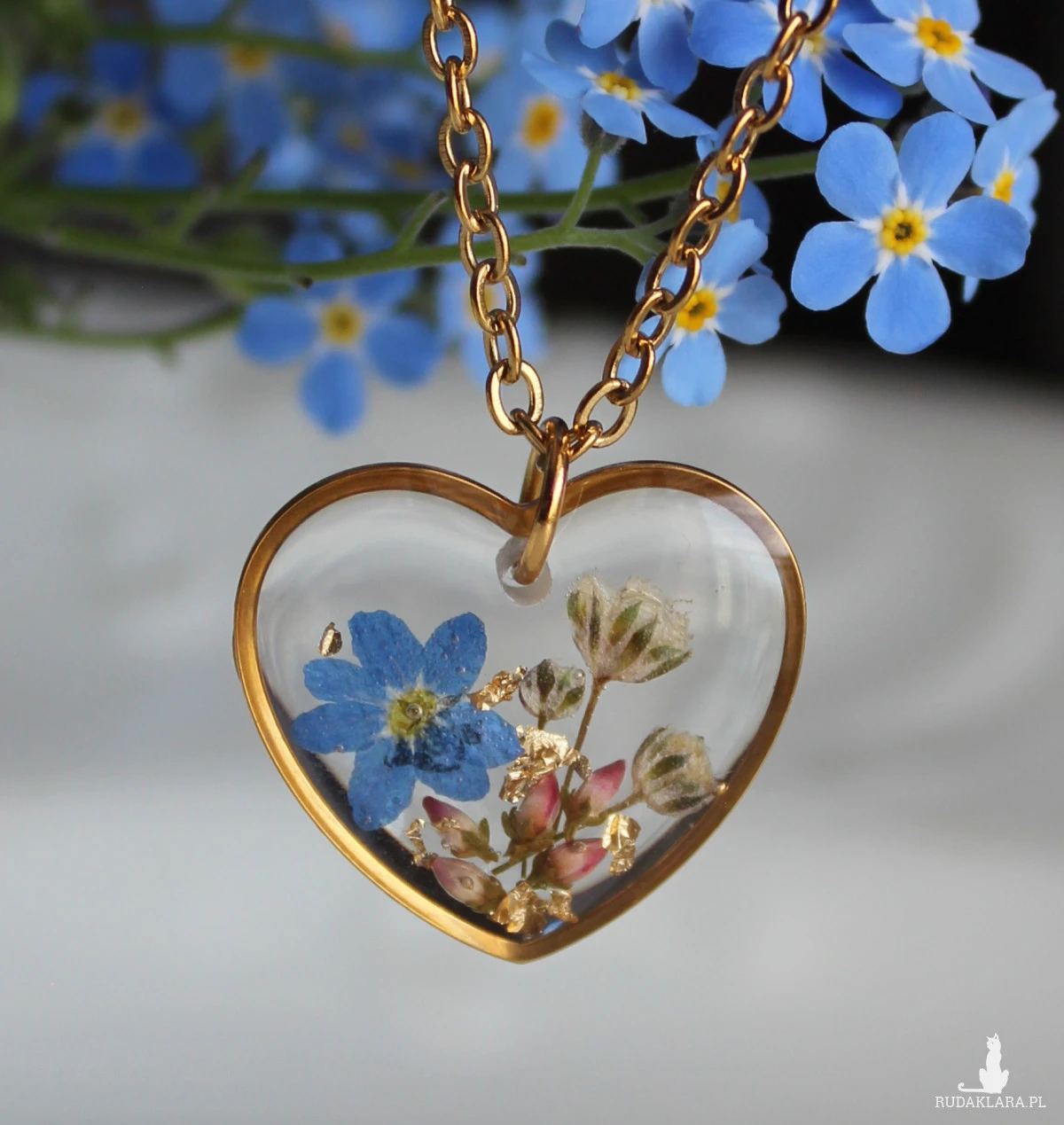 Złota zawieszka złoty wisiorek kwiat naszyjnik żywica z żywicy kwiaty serce serduszko niezapominajki gipsówka
