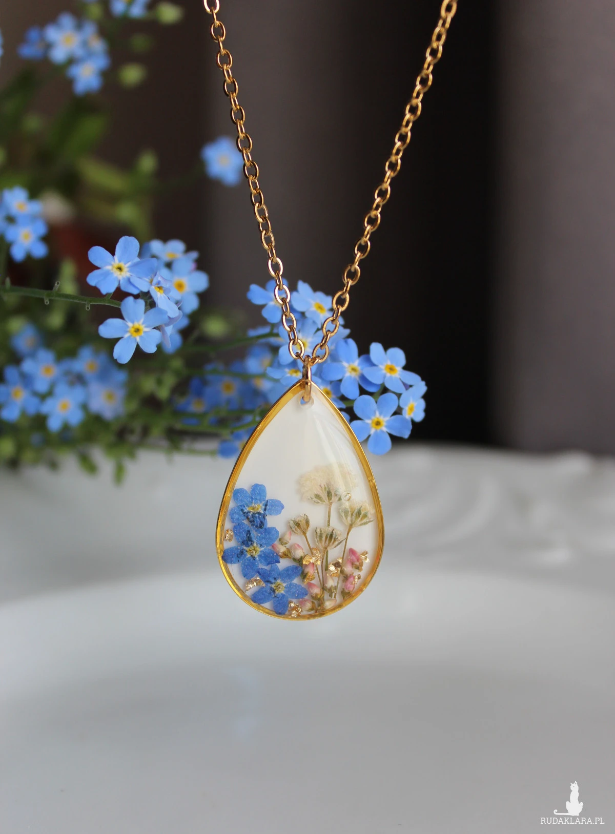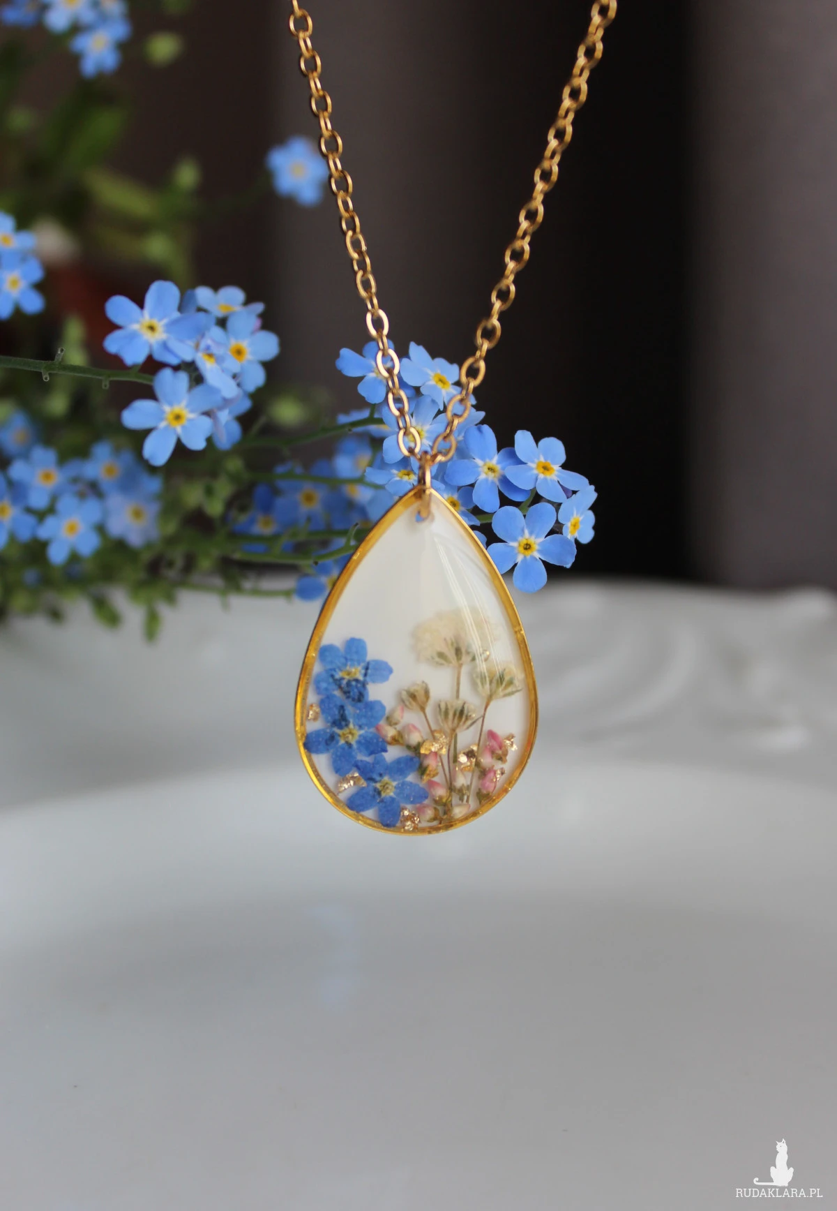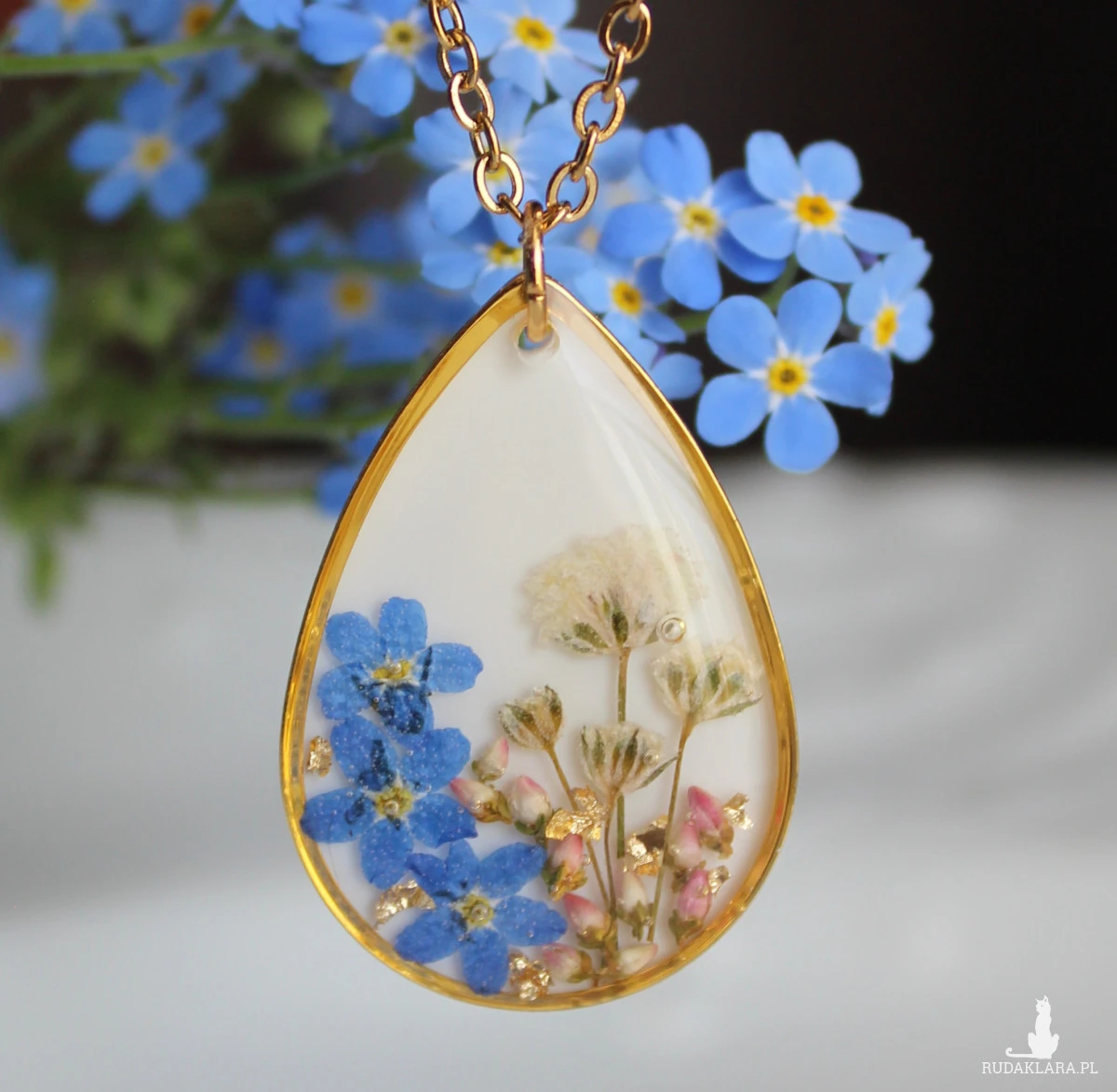 Oferuję Państwu unikalną biżuterię. Zawieszka jest wykonana z suszonych kwiatów i żywicy epoksydowej. Biżuteria jest wspaniałym i oryginalnym prezentem na lata.