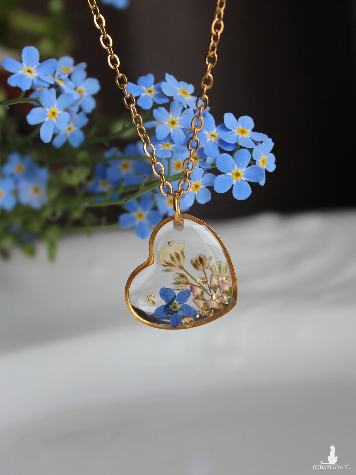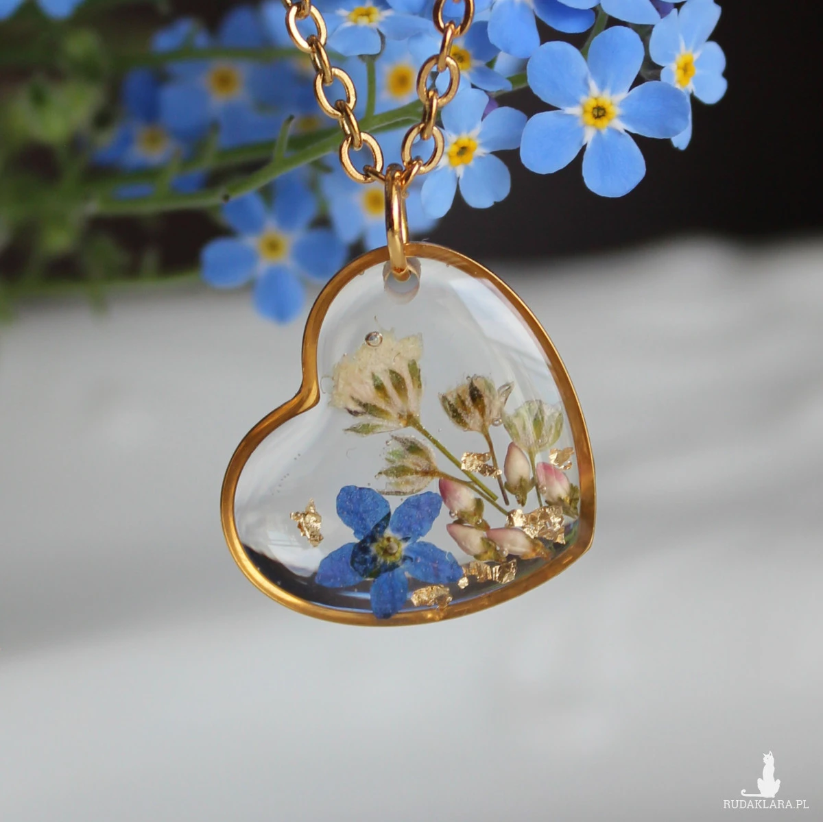 Złota zawieszka złoty wisiorek kwiat naszyjnik żywica z żywicy kwiaty serce serduszko niezapominajki gipsówka