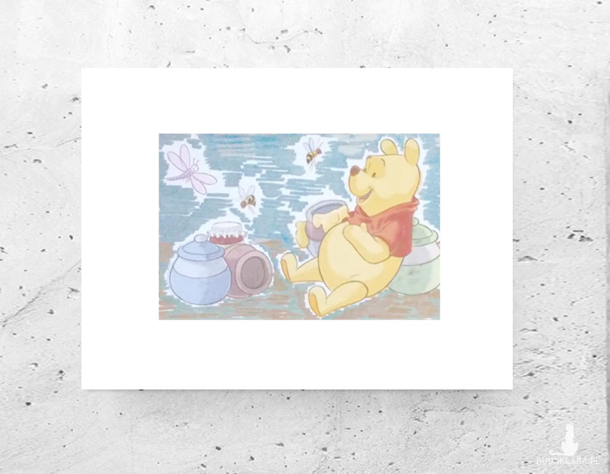 Kolorowy obrazek z Kubusiem Puchatkiem, lekko srebrzyste tło. Grafika na białym kartoniku w rozmiarze A4. Dekoracja na ścianę do dziecięcego pokoju, kuchni, jadalni, sypialni, żłobka, przedszkola, bawialni, klubu malucha itp. Poster wystarczy dać do ramki w rozmiarze 21 x 30 cm..