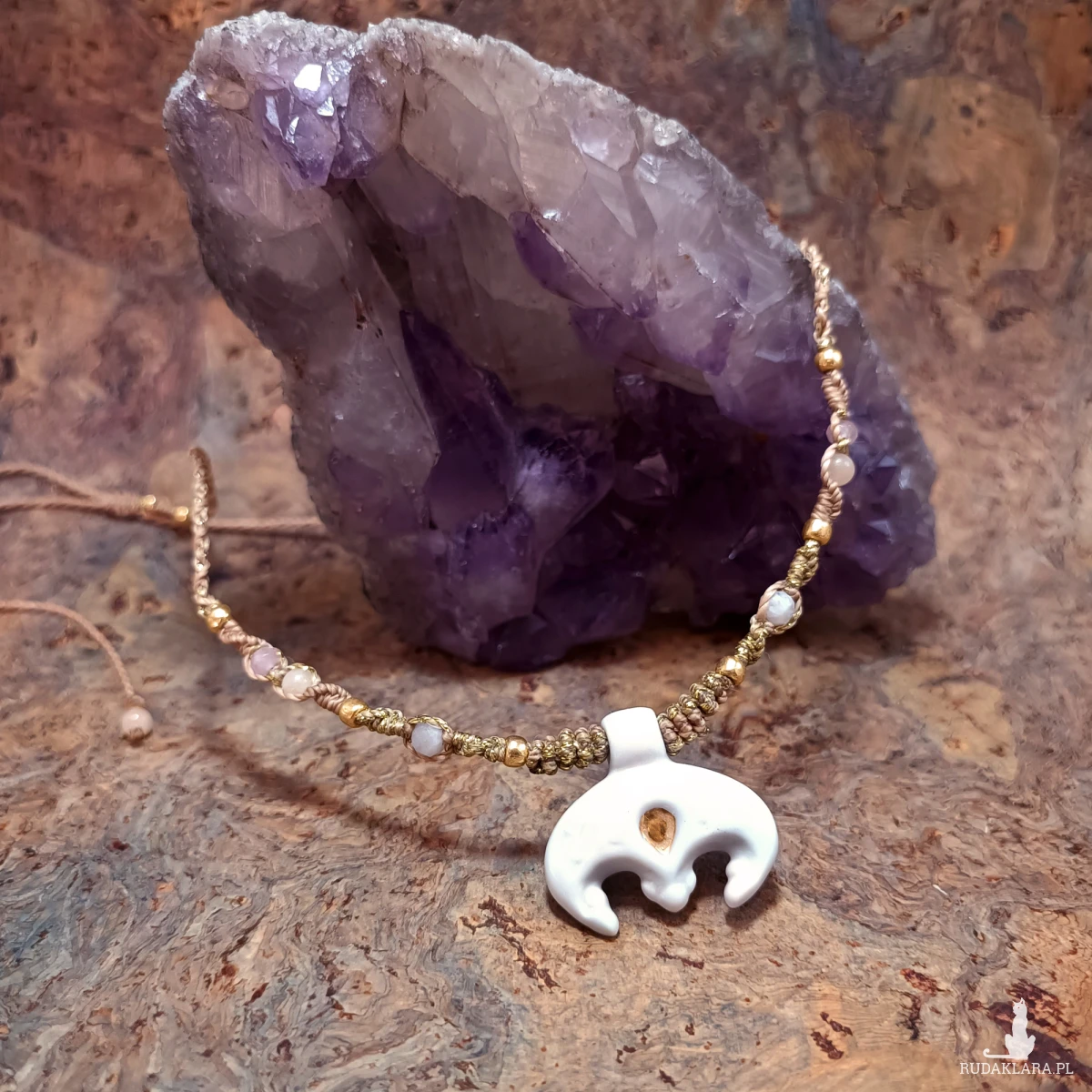 Lunula wykonana jest z porcelany, ozdobiona błyszczącym szkliwem i złotem. Oprawiona techniką mikromakramy, wykonaną ze sznurka o doskonałej jakości.