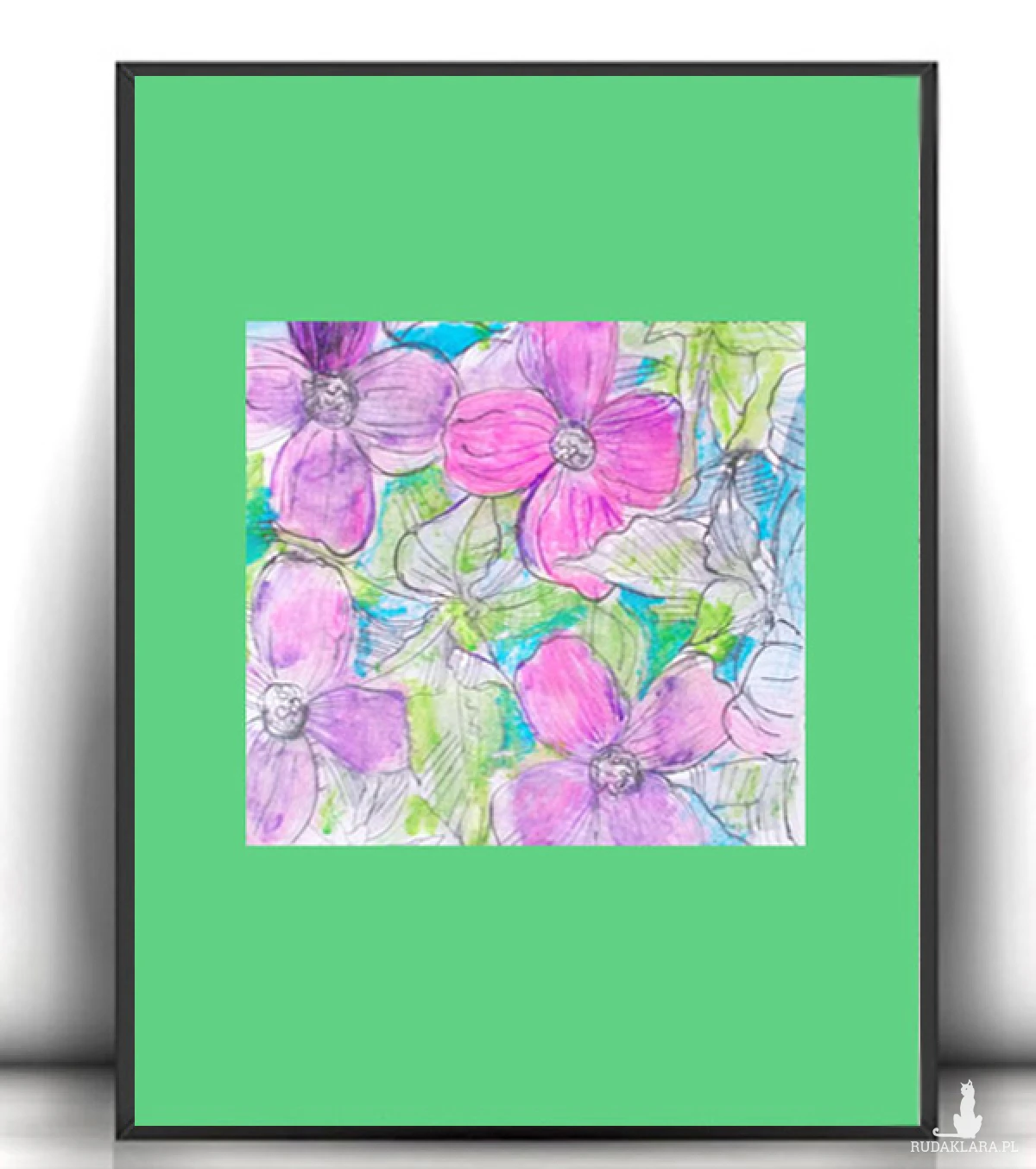 Kolorowa grafika na zielonym kartoniku w rozmiarze A4. Obrazek wystarczy tylko oprawić w ramkę 21x30 cm. Ozdoba na ścianę do salonu, sypialni, biura, gabinetu, pokoju dziewczynki lub nastolatki, przedpokoju, jadalni, kuchni, holu. Ilustracja będzie pasowała zarówno do wnętrz nowoczesnych, boho, eklektycznych jak i do tradycyjnych, tradycyjnych, klasycznych. Przedmiot do dekoracji wnętrz.
