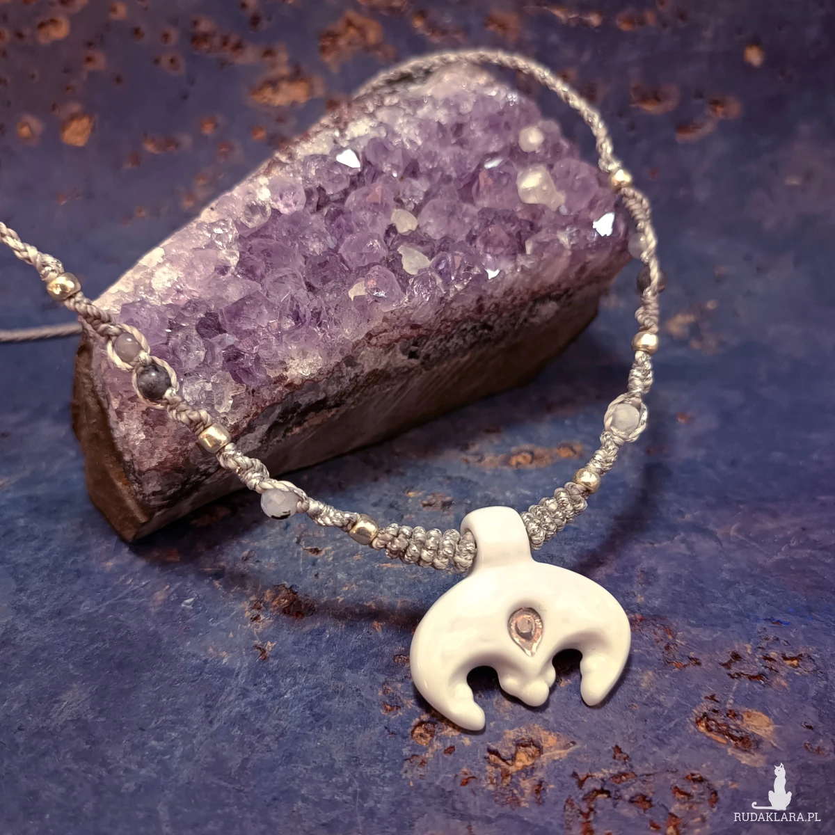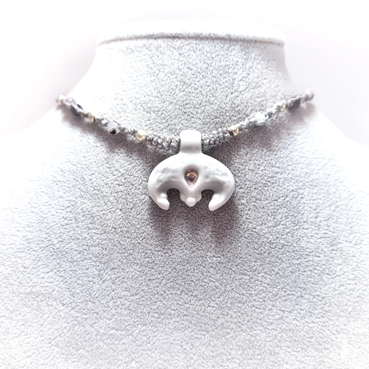 Lunula wykonana jest z porcelany, ozdobiona błyszczącym szkliwem i srebrem. Oprawiona techniką mikromakramy, wykonaną ze sznurka o doskonałej jakości.