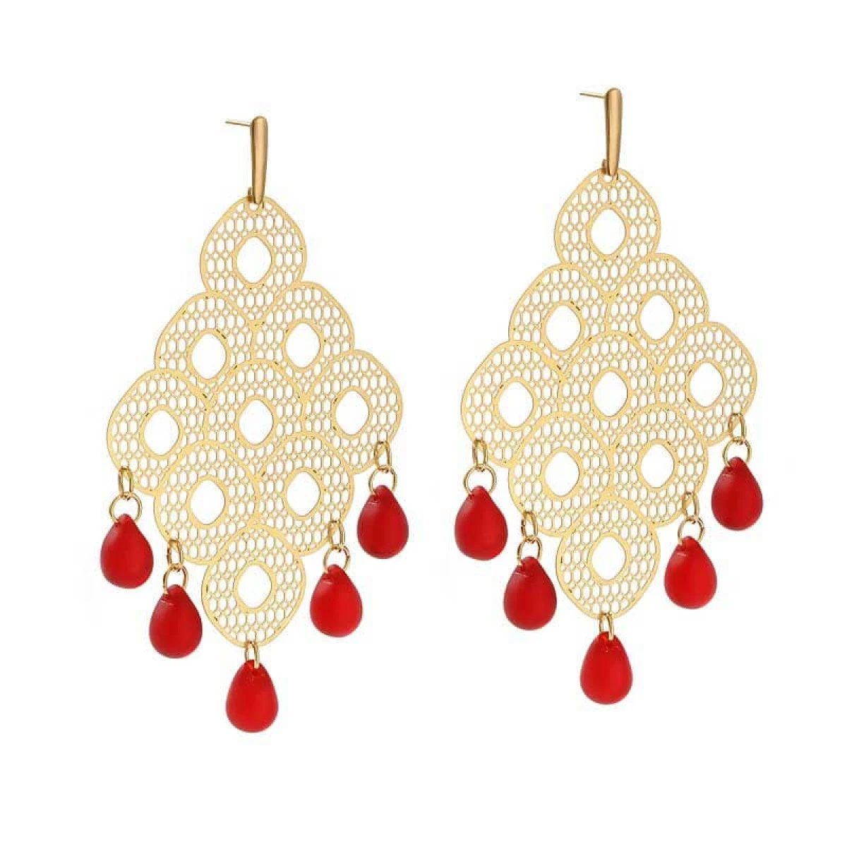 Kolczyki w kształcie rombów w złocistym odcieniu, urozmaicone szklanymi kroplami w głębokim, rubinowym kolorze. Połączenie klasycznej barwy złota i matowej czerwieni nadaje kolczykom charakteru boho, sprawiając, że będą idealnym uzupełnieniem stylizacji festiwalowych czy imprezowych. Z pewnością staną się znakiem rozpoznawczym właścicielki lub będą trafionym prezentem dla wielbicielki orientalnego designu. Biżuteria wykonana jest z wysokiej jakości mosiądzu, który nie zawiera niklu, ołowiu ani kadmu. Dzięki swojej ażurowej budowie i wykorzystanym materiałom, kolczyki są bardzo lekkie - co za tym idzie, nie obciążają ucha i mogą być noszone cały dzień.