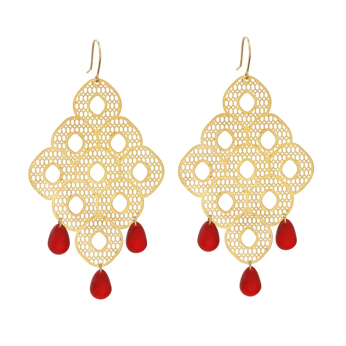 Kolczyki w kształcie rombów w złocistym odcieniu, urozmaicone szklanymi kroplami w głębokim, rubinowym kolorze. Połączenie klasycznej barwy złota i matowej czerwieni nadaje kolczykom charakteru boho, sprawiając, że będą idealnym uzupełnieniem stylizacji festiwalowych czy imprezowych. Z pewnością staną się znakiem rozpoznawczym właścicielki lub będą trafionym prezentem dla wielbicielki orientalnego designu. Dzięki swojej ażurowej budowie i wykorzystanym materiałom, kolczyki są bardzo lekkie - co za tym idzie, nie obciążają ucha i mogą być noszone cały dzień.