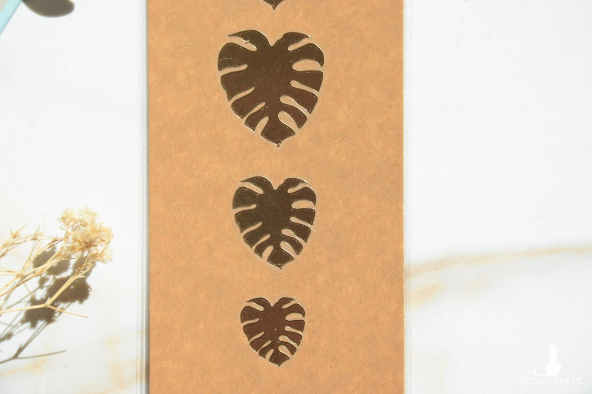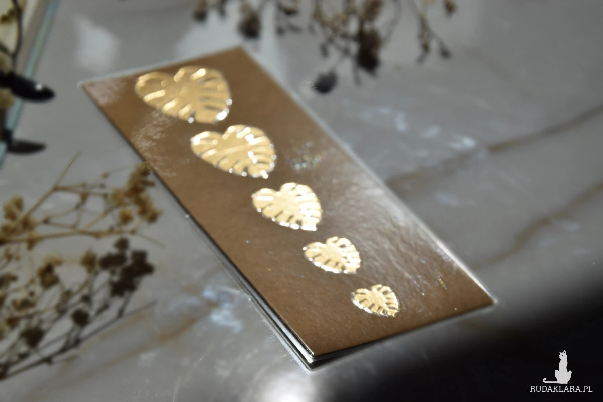 Zakładka wykonana jest z brązowego papieru o grubości 300 g. Ozdobne elementy wykonane są ze złotej, chromowanej folii, która przepięknie błyszczy w promieniach słońca. Całość zabezpieczona jest poprzez zalaminowanie zakładki.
